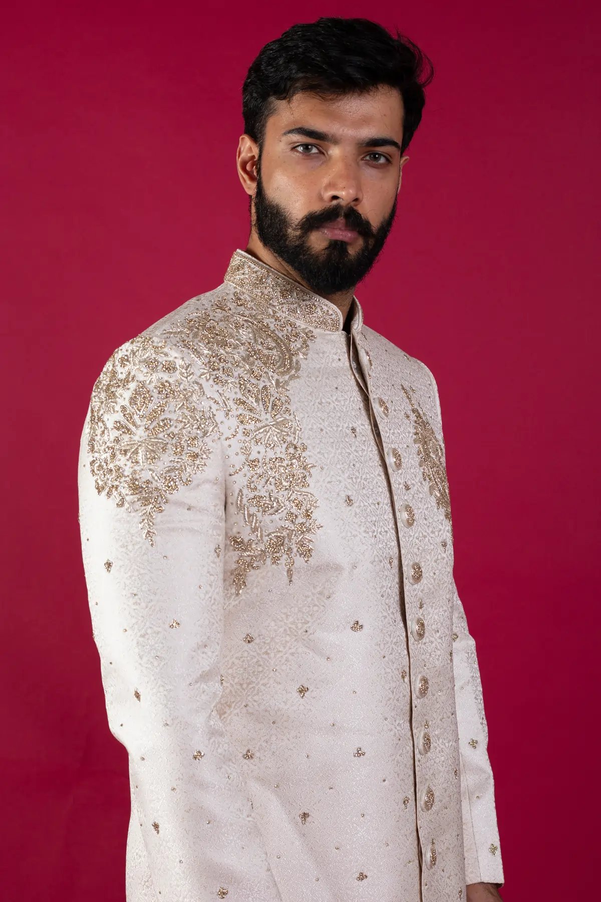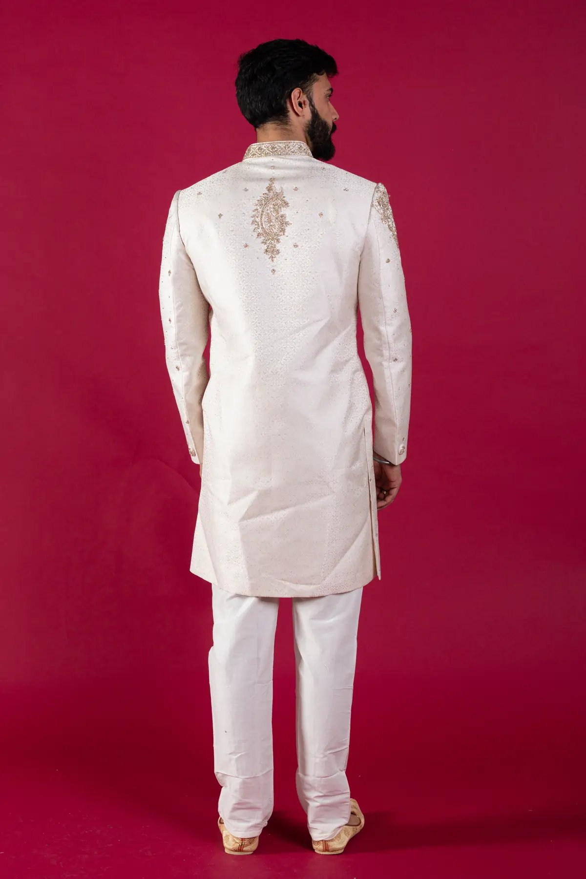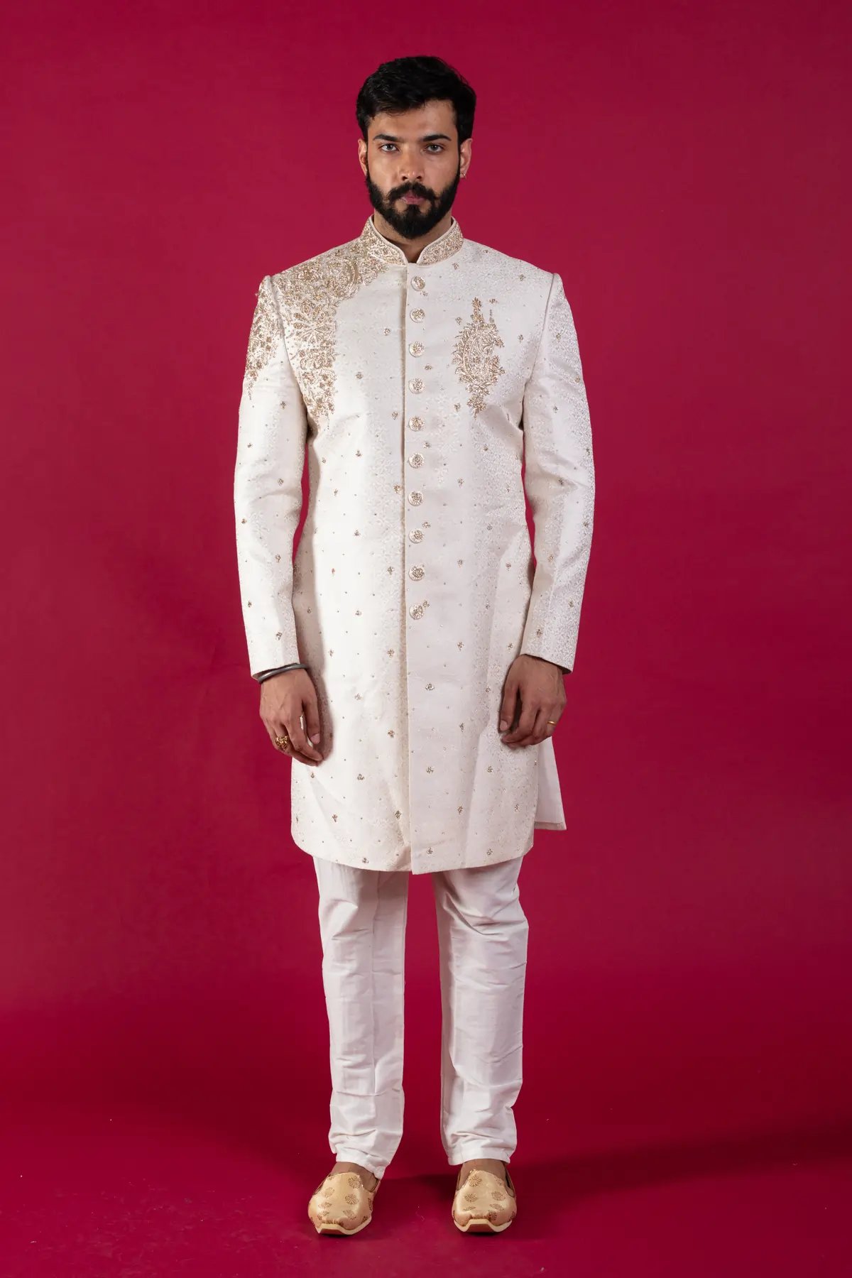 This beautiful men’s sherwani features a long coat all closed up to the collar and below the knee lengthwise. It is designed with beautiful thread-work embroidered detailing all over the front with scattered diamantés embellishments and full length embroidered sleeves. It comes with an embroidered mandarin collar with detailed button embellishments along the middle. Paired with raw silk trousers.