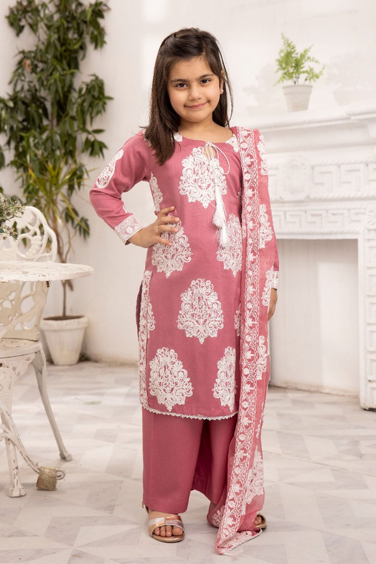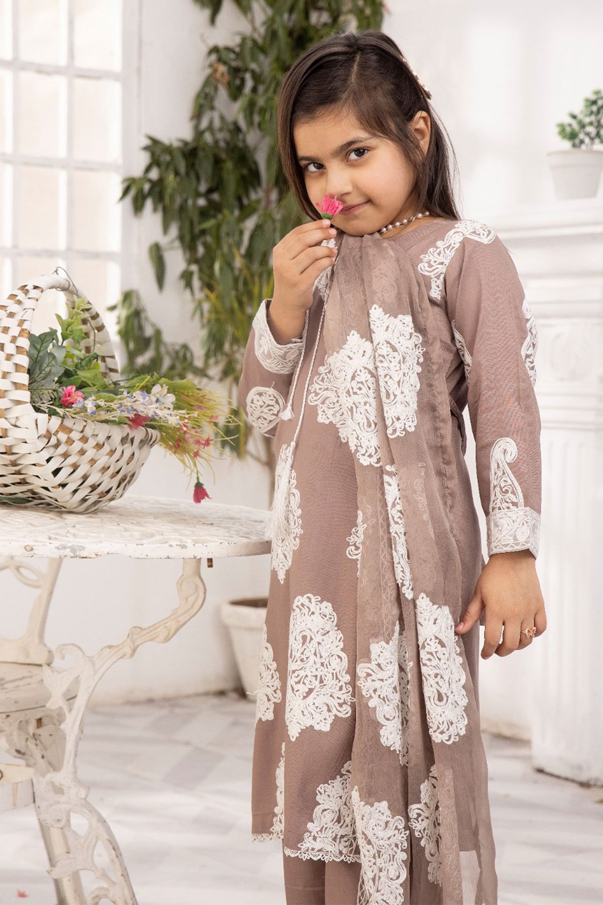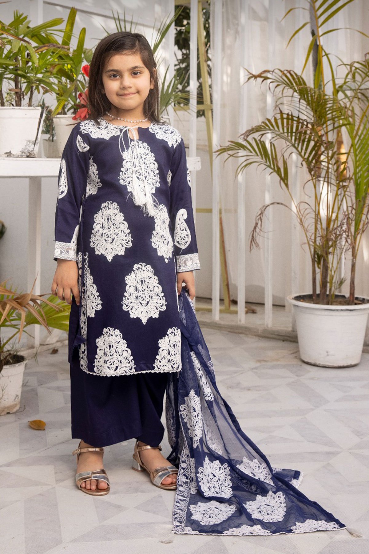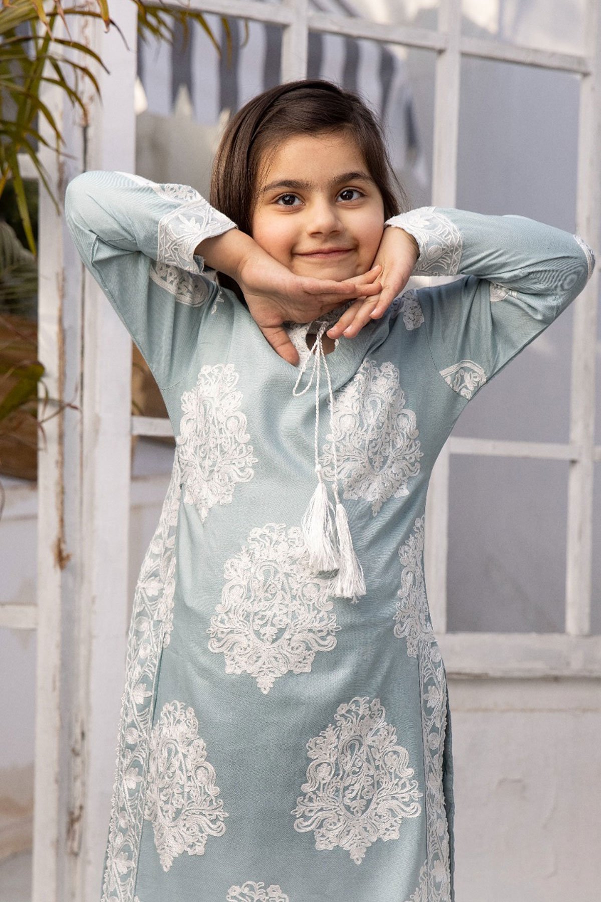 This beautiful 3 piece Jannat linen collection features a straight shirt with luxury thread work embroidery throughout with dori embellishment on the neckline. It comes with full length embroidered sleeves with wide leg plazo trousers. The look is finished with a chiffon embroidered dupatta. Perfect mother and daughter collection for this Eid.