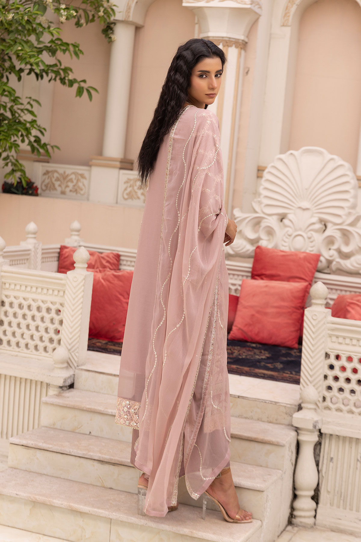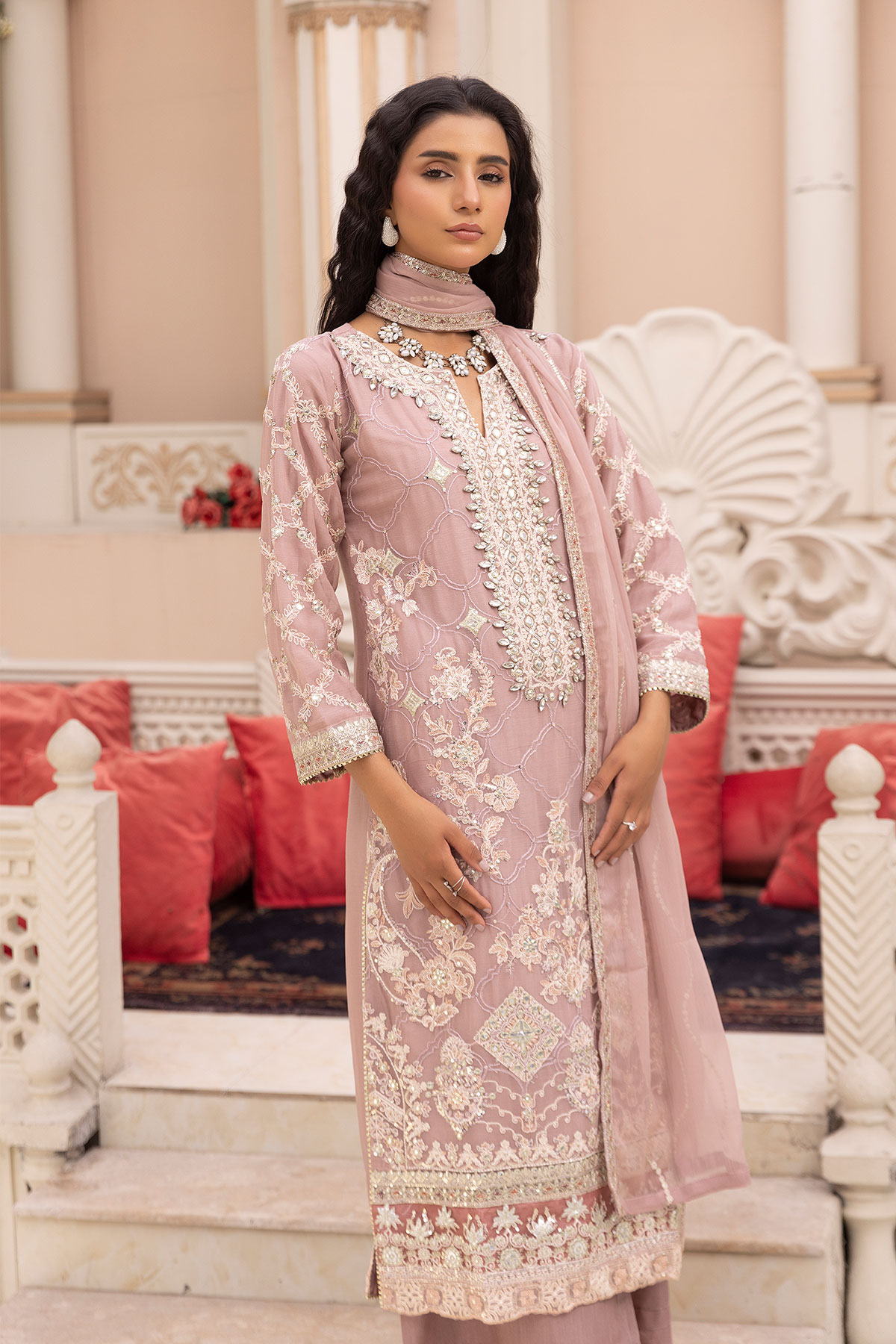 This beautiful 3 piece Kashish collection suit features a straight pure chiffon shirt with luxury thread work embroidery along with stone work on the front, finished with full length embroidered sleeves. Paired with straight leg plain trousers. The look is finished with a chiffon embroidered dupatta. Perfect festive collection for Eid 2025 known for comfort and elegance.