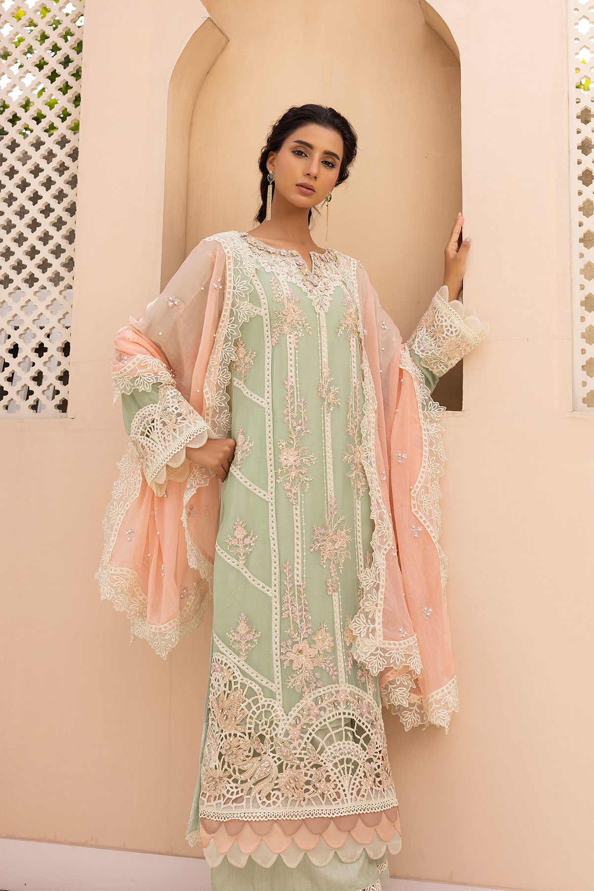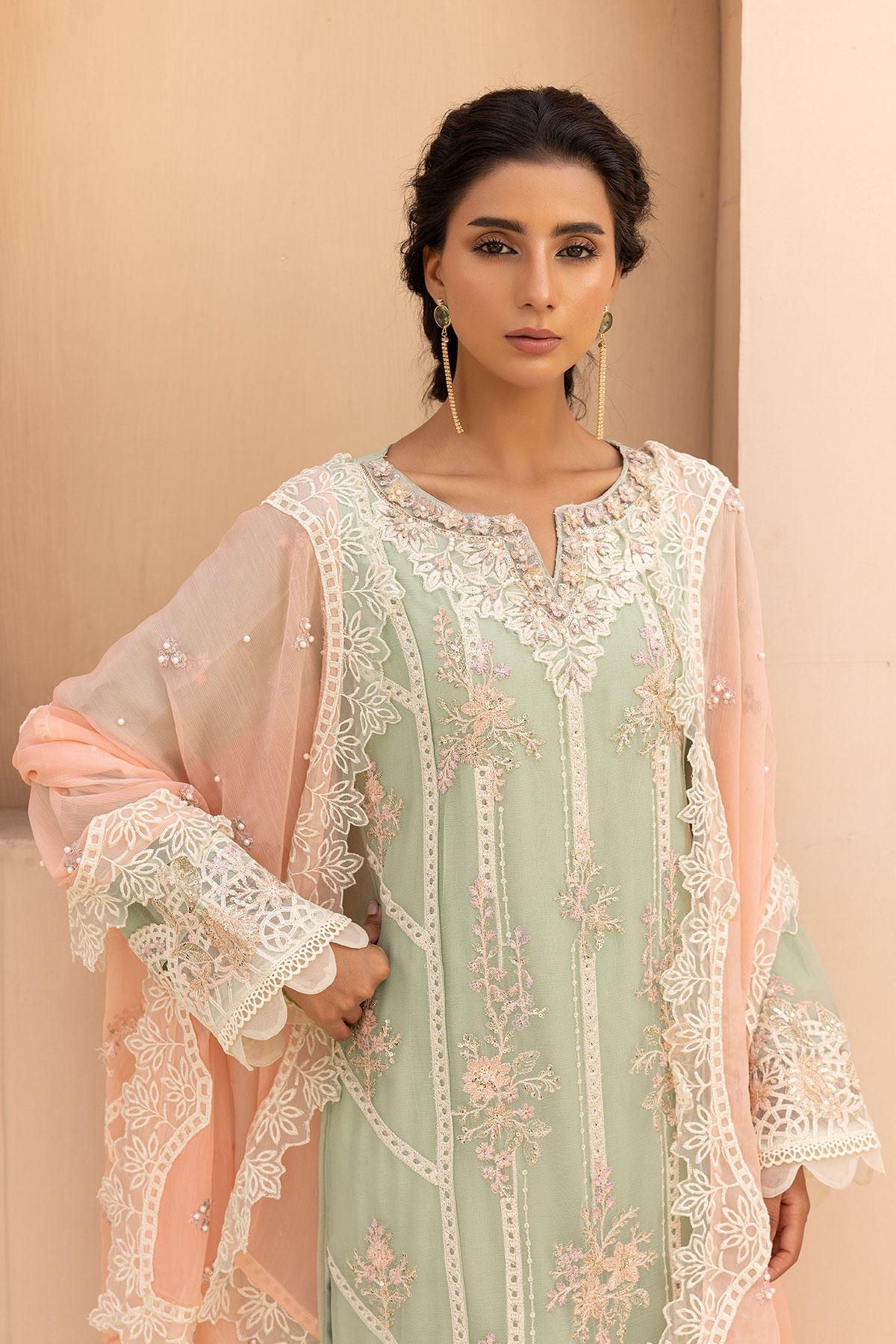 This beautiful 3 piece Kashish collection suit features a straight pure chiffon shirt with luxury thread work embroidery along with 3d embellishment around the neckline, finished with full length embroidered sleeves. Paired with wide leg trousers. The look is finished with a chiffon embroidered dupatta. Perfect festive collection for Eid 2025 known for comfort and elegance.