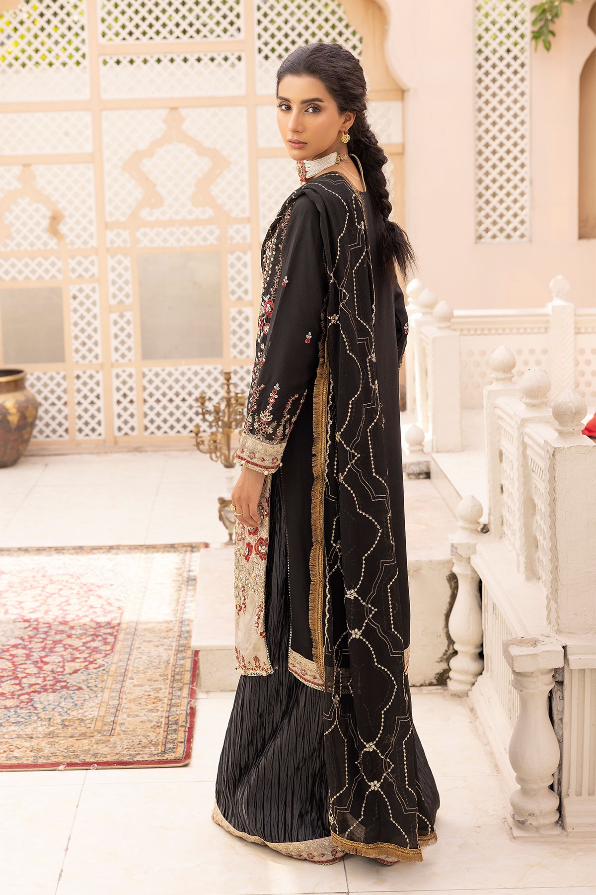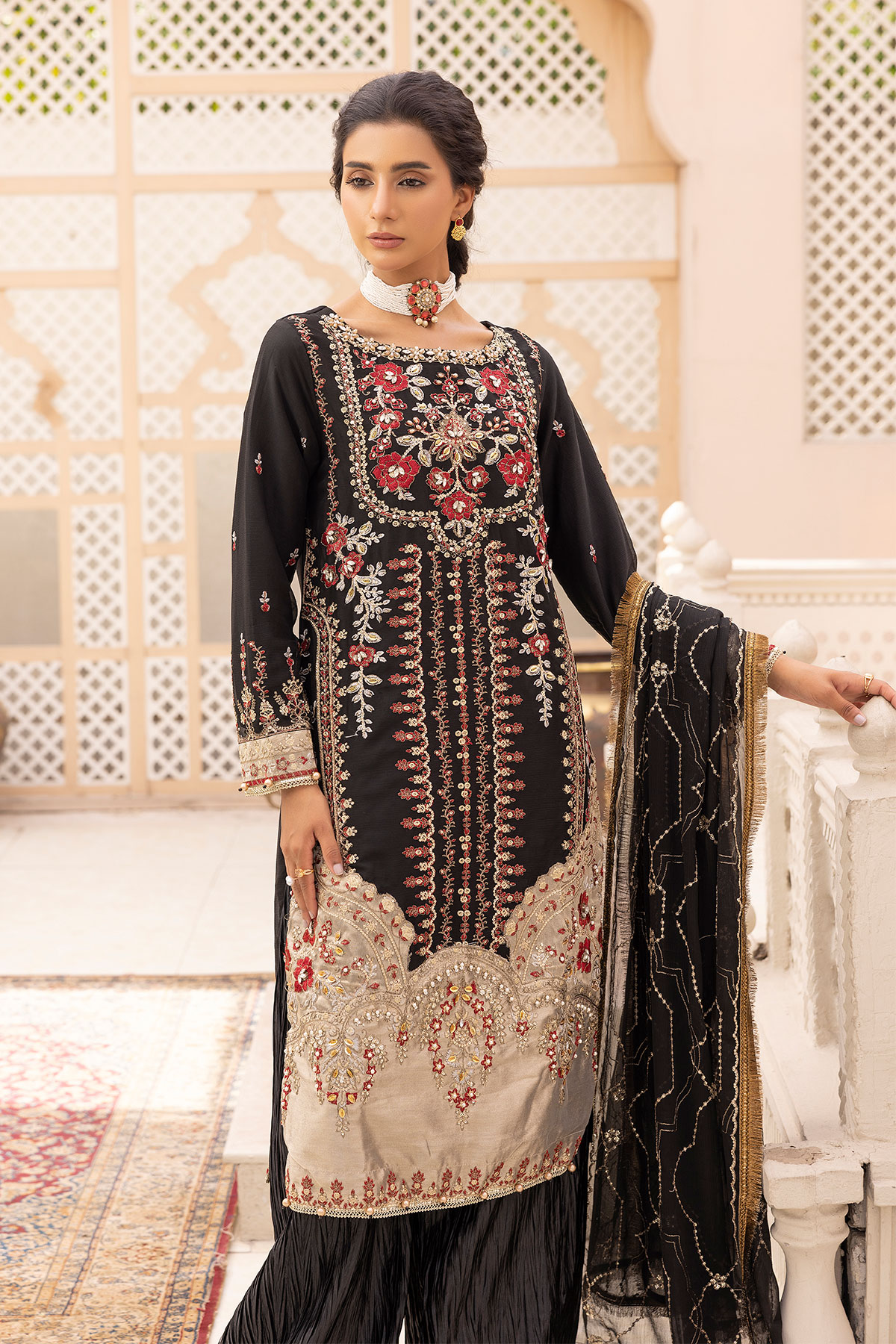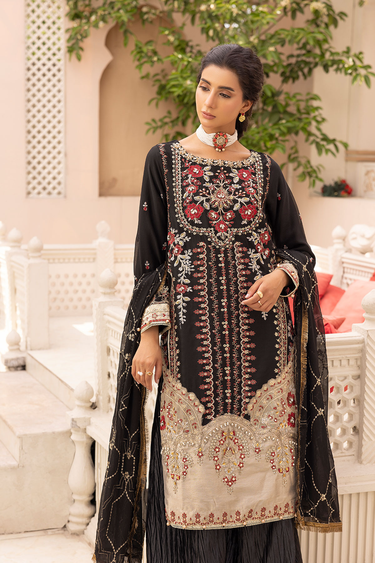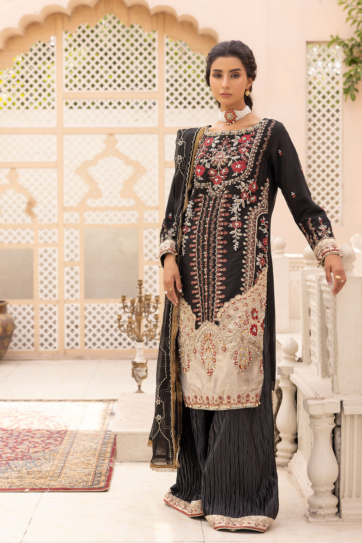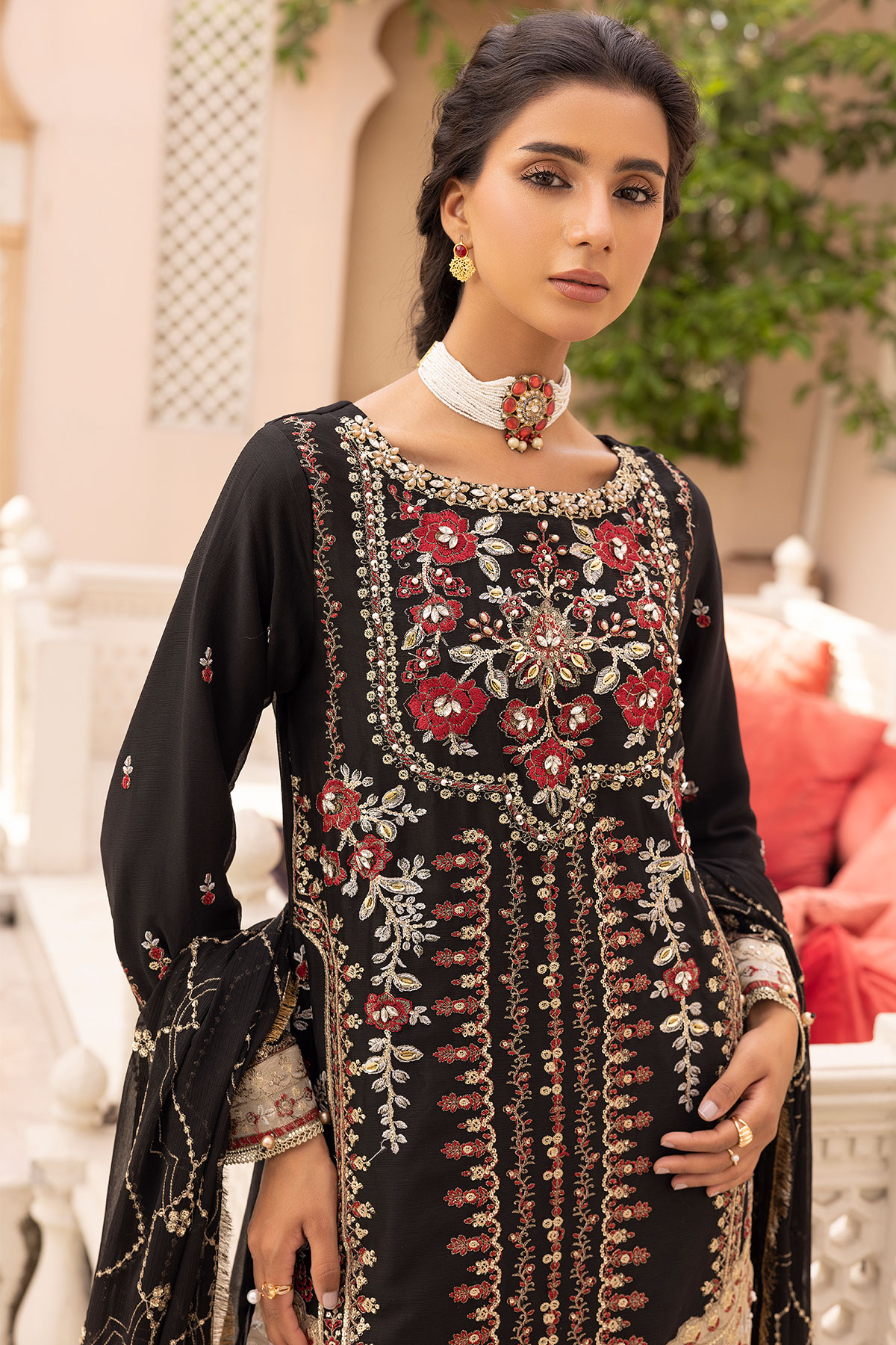 This beautiful 3 piece Kashish collection suit features a straight pure chiffon shirt with luxury thread work embroidery with scattered diamantés, finished with full length embroidered sleeves. Paired with crinkled plazo trousers. The look is finished with a chiffon embroidered dupatta. Perfect festive collection for Eid 2025 known for comfort and elegance.