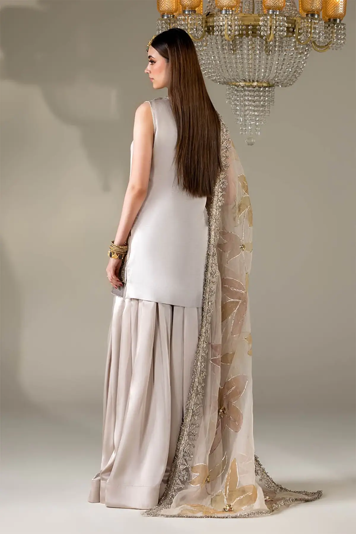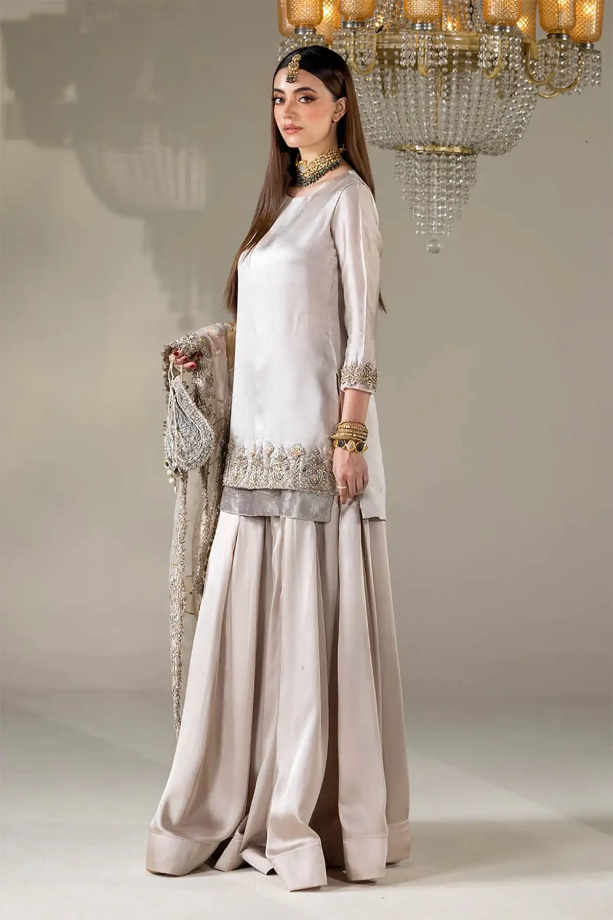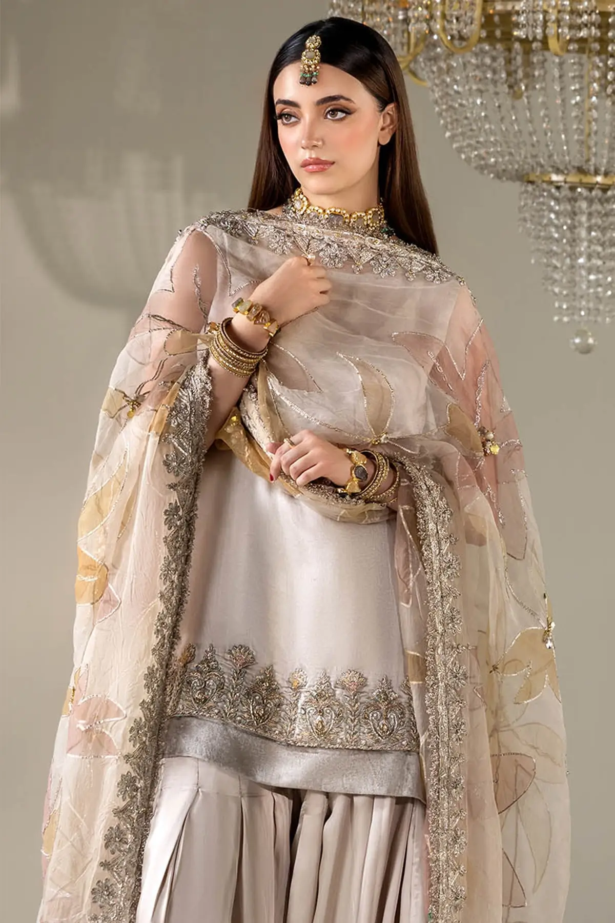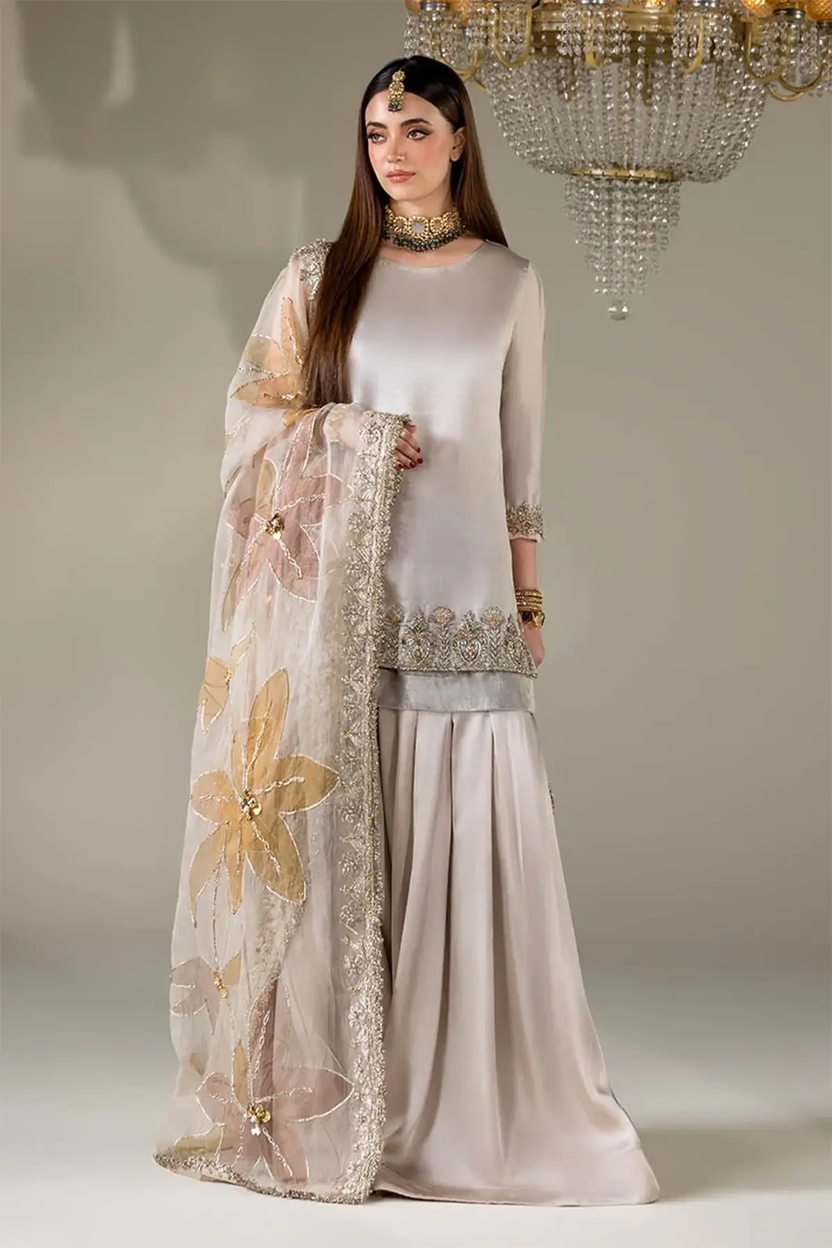 This beautiful 3 piece Khudabaksh suit features a short shirt with luxury embroidered border and cuffs of full length sleeves. Paired with a flared sharara. The look is finished with a hand painted floral dupatta with an embroidered border with kiran embellishments. Note: Above catalogue images are for design reference only. Stitching and embellishments may vary.