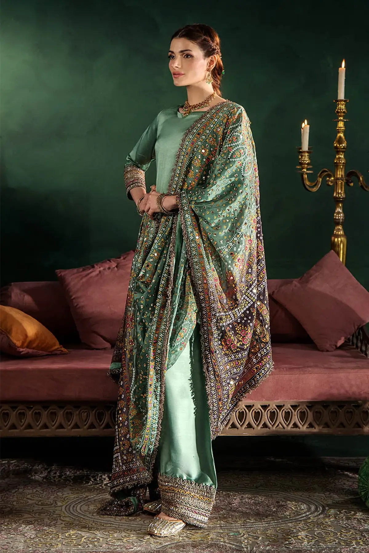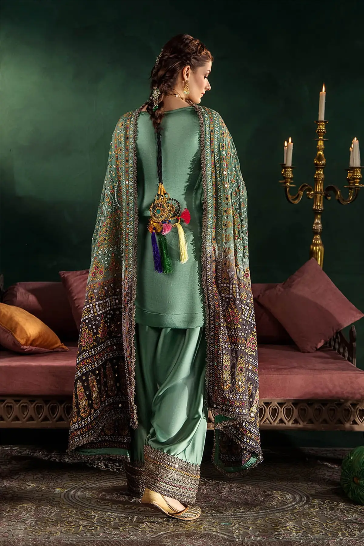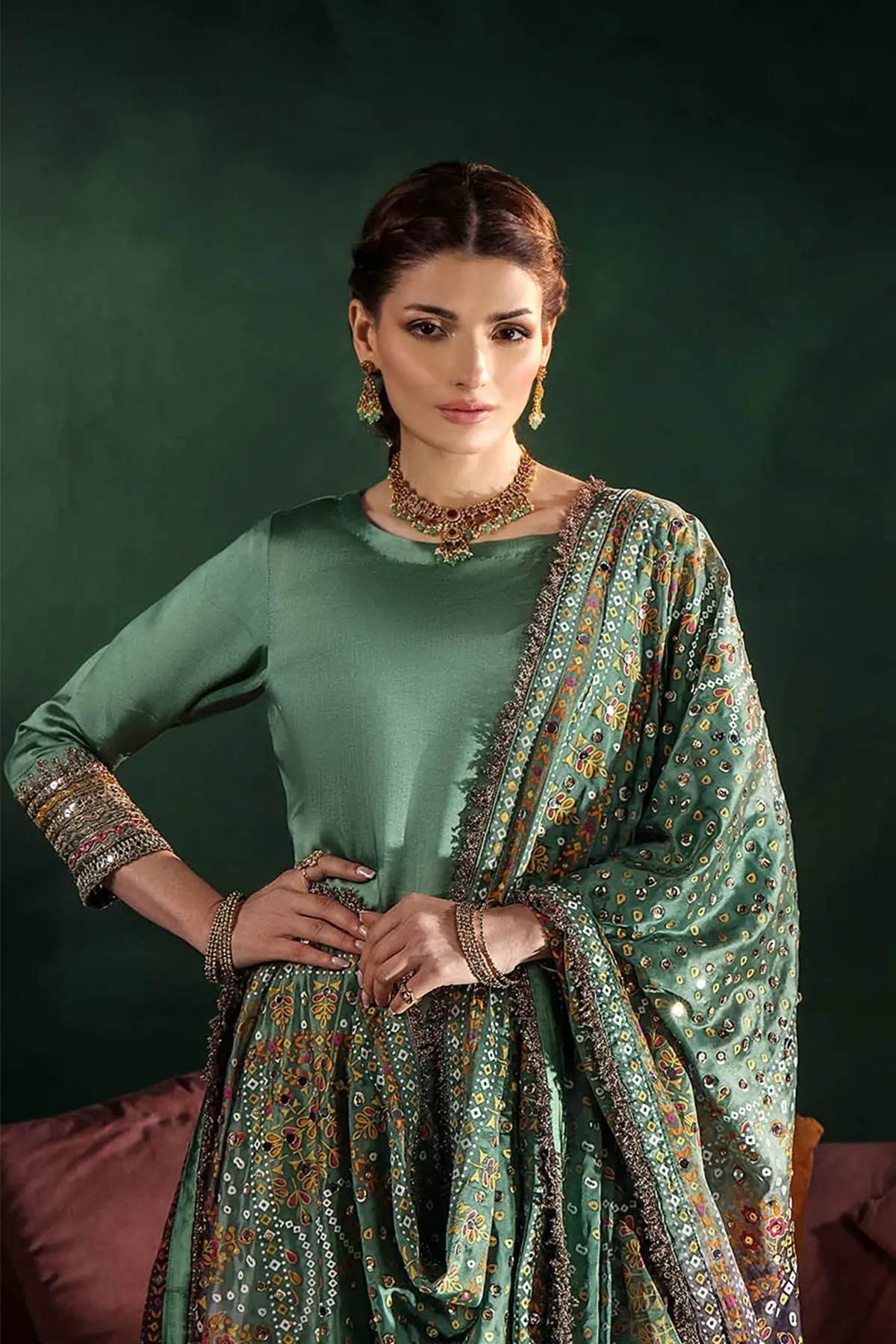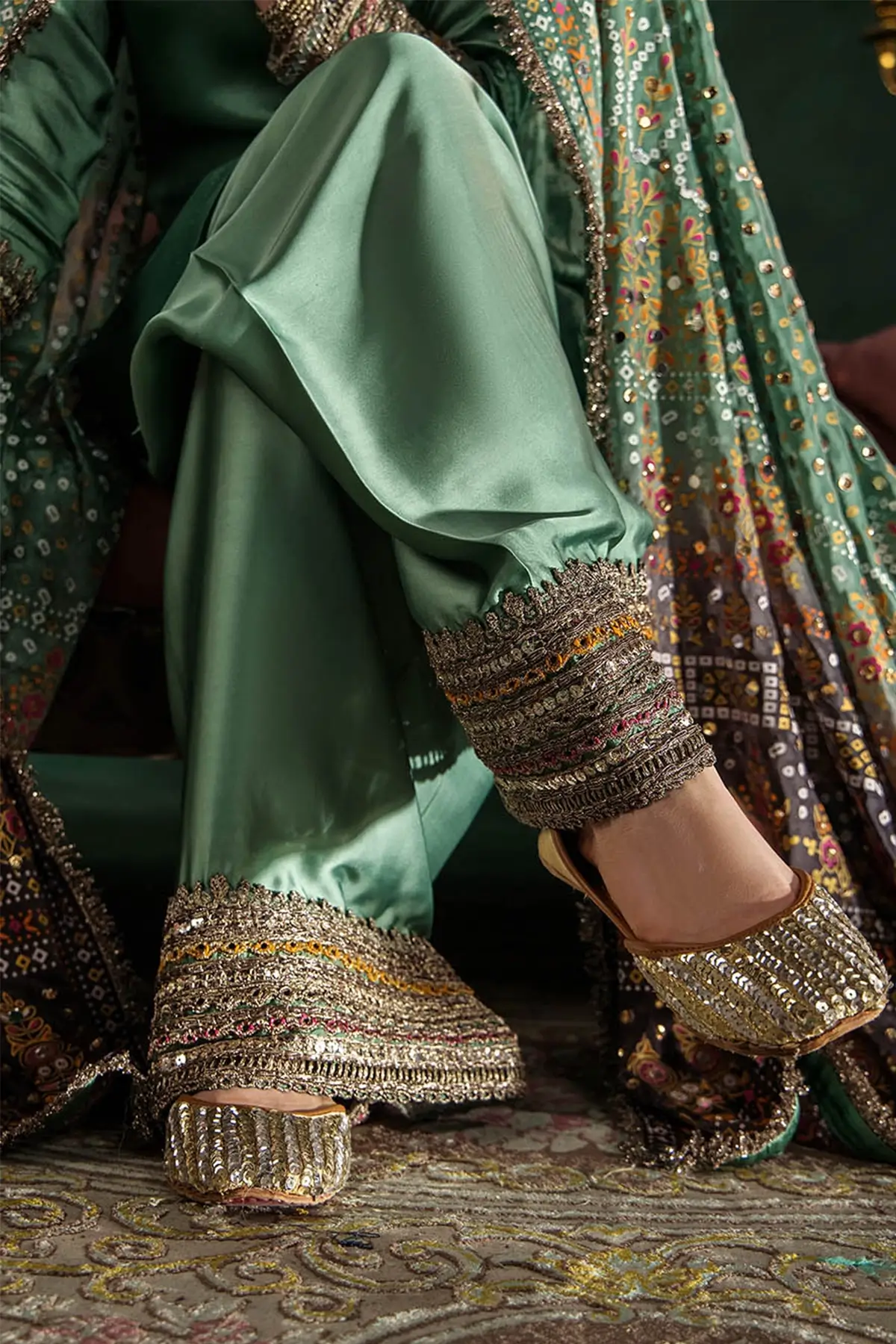 The shirt is made from premium gloss silk, offering a smooth, elegant drape, with the sleeves designed in the same fabric for a cohesive finish. The dupatta is crafted from charmeuse silk and features block printing enhanced with mirror work and gotta detailing, adding a festive and refined touch. Paired with a shalwar which is tailored from charmeuse silk as well, providing a luxurious fall and comfortable wear.