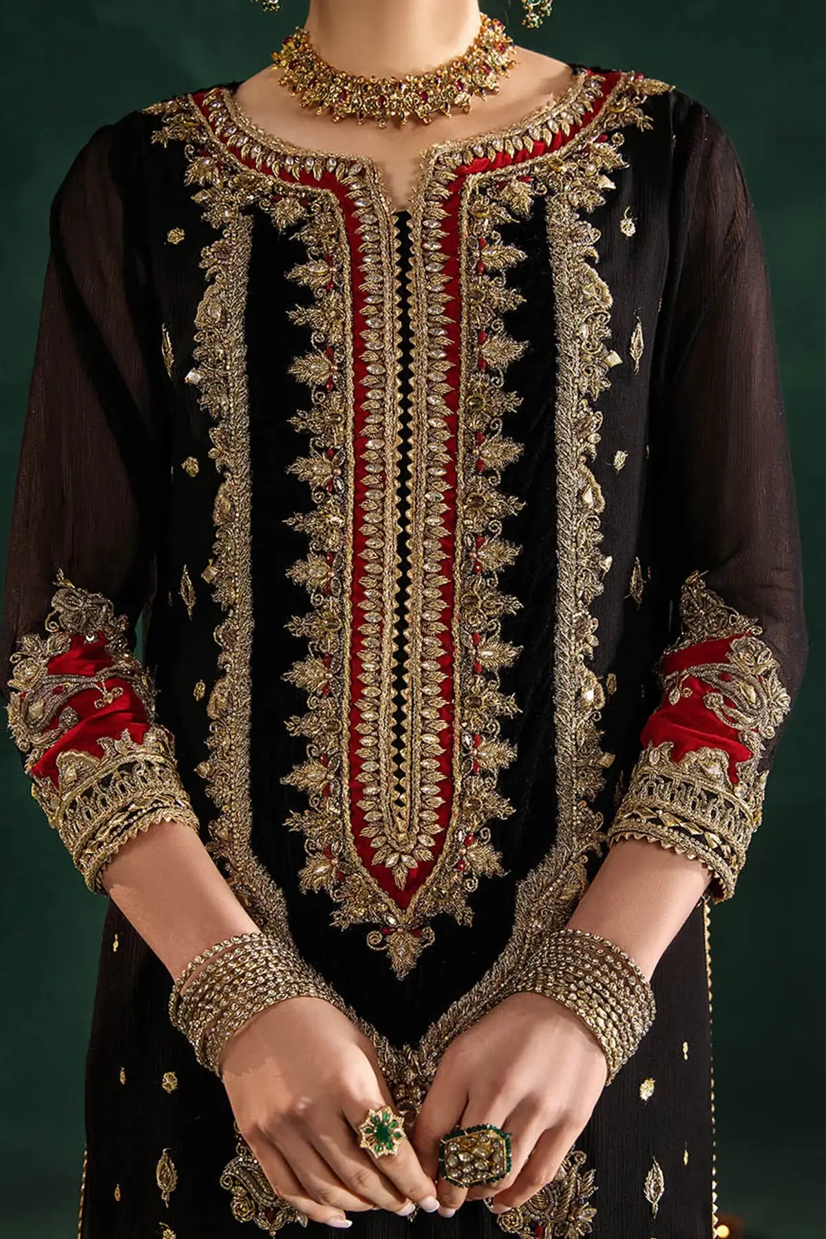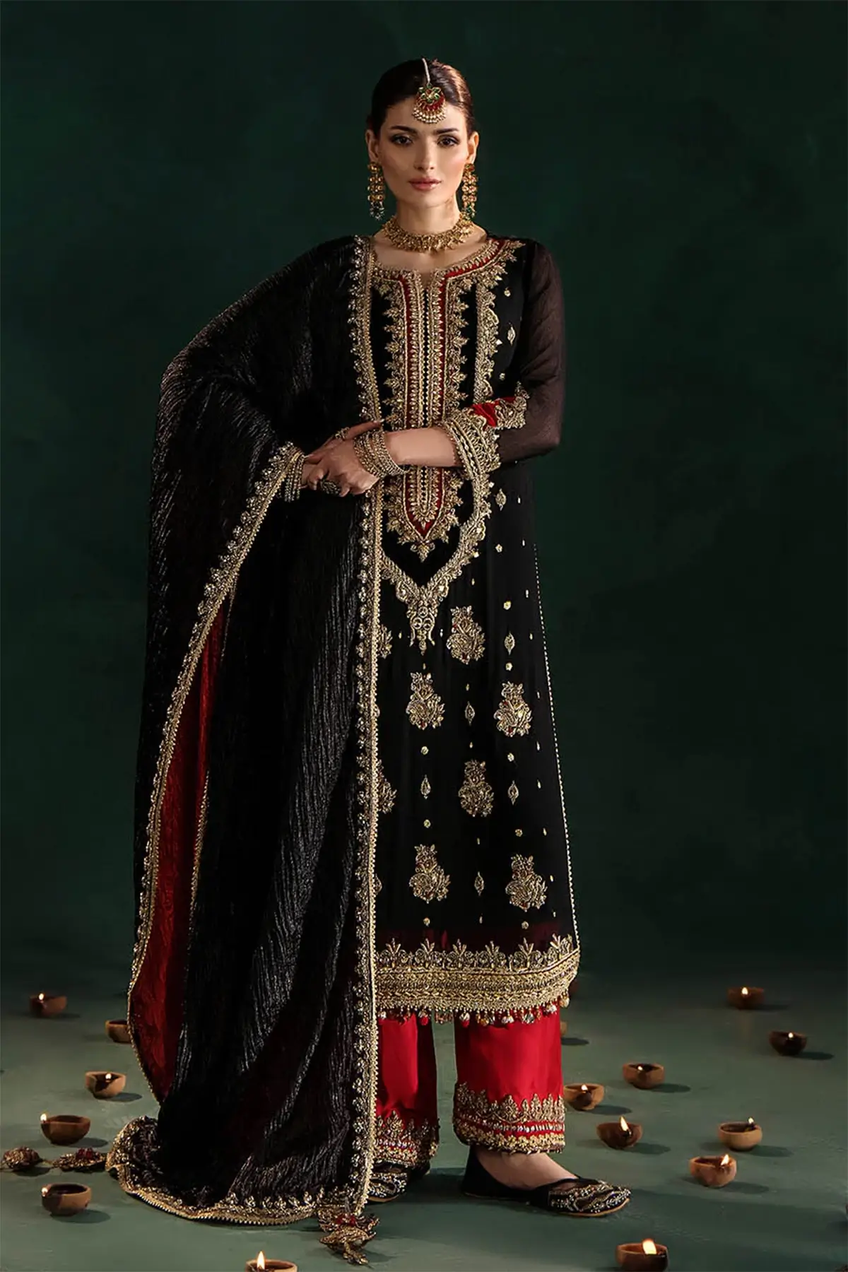 Fabric & Work Details: The shirt is made from premium crinkle chiffon and showcases hand‑embroidered kora, dabka, and zardozi work, with the sleeves designed in the same fabric and embellishment style for a cohesive finish. The dupatta is crafted from double‑layered silk, featuring one side in a contrasting tone and the other in a deeper shade for an elegant two‑tone effect. The contrasted bottoms are tailored in silk and adorned with hand‑embroidered kora, dabka, and complementary detailing to complete the look.