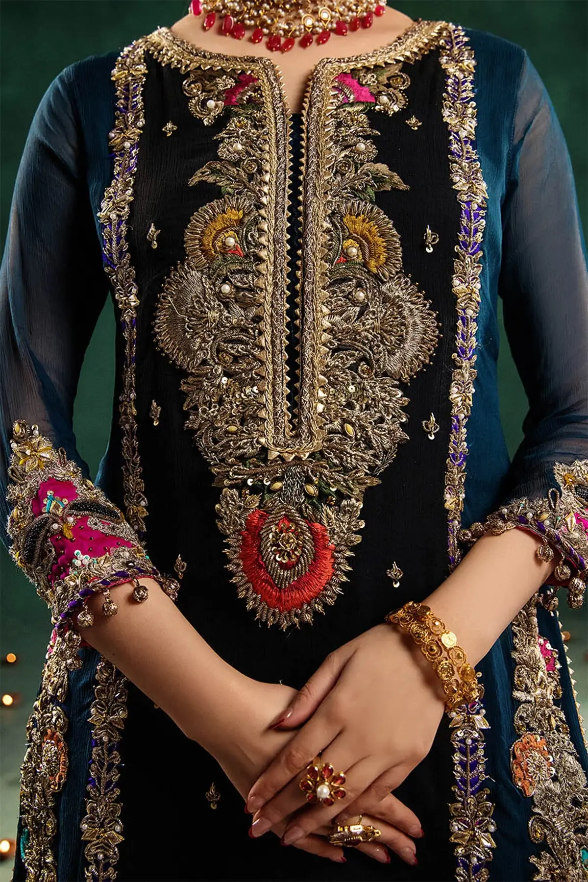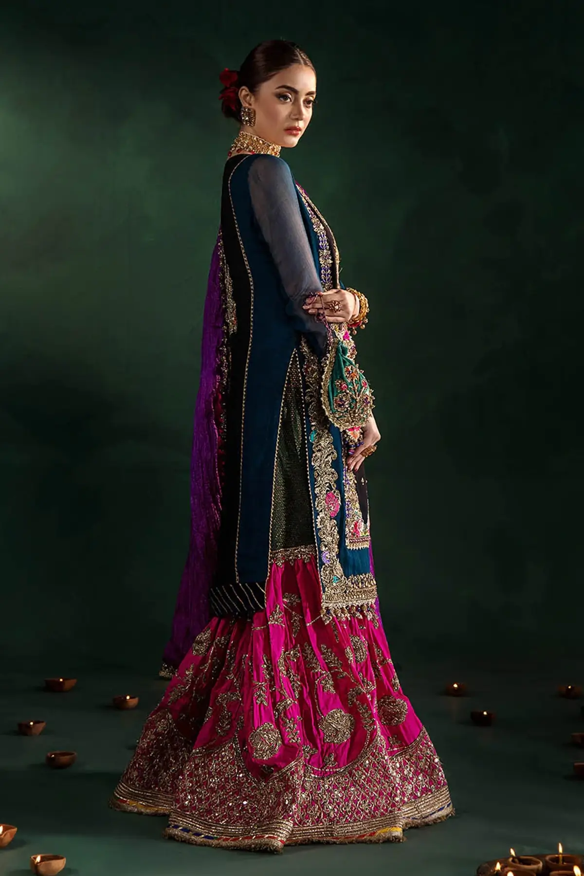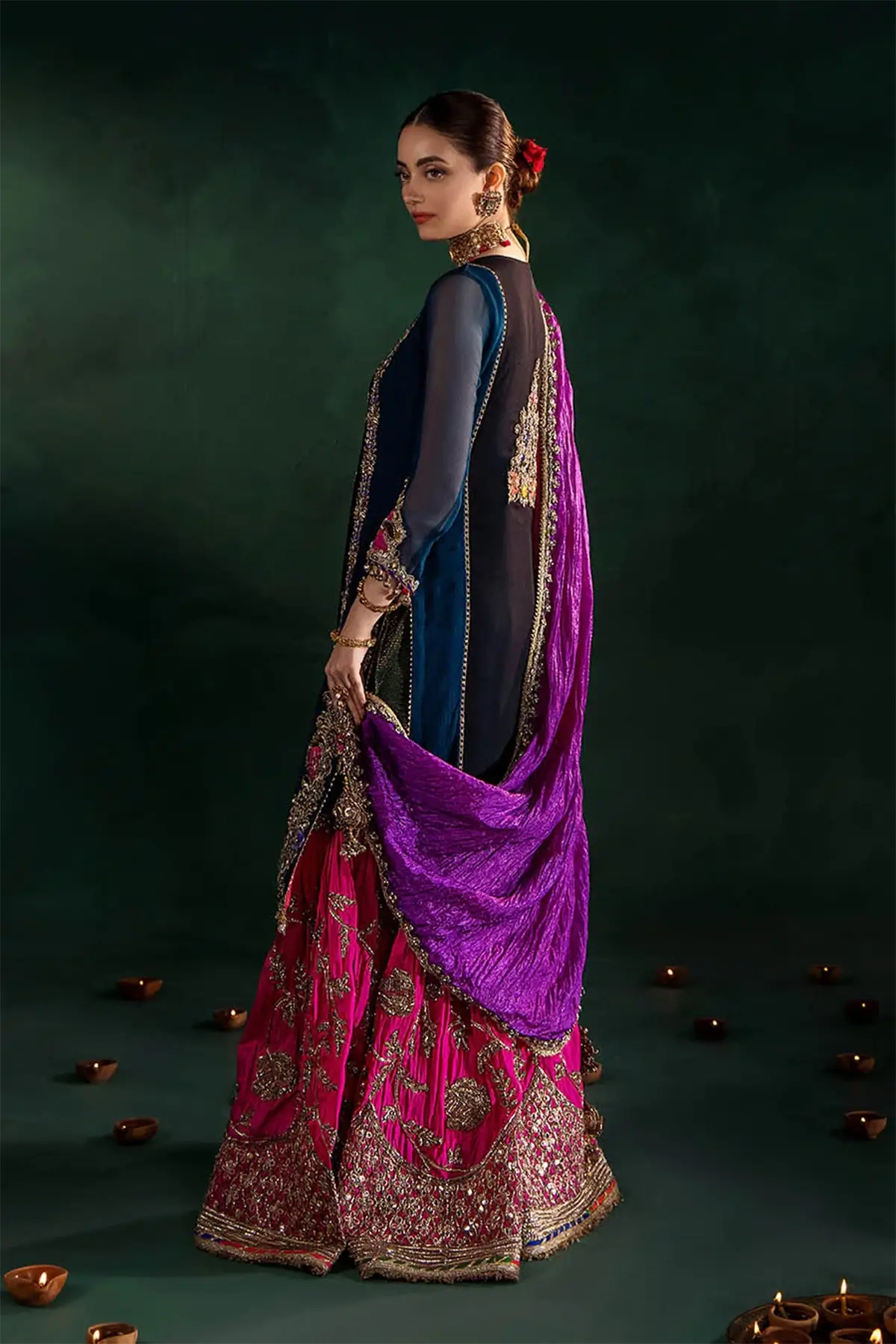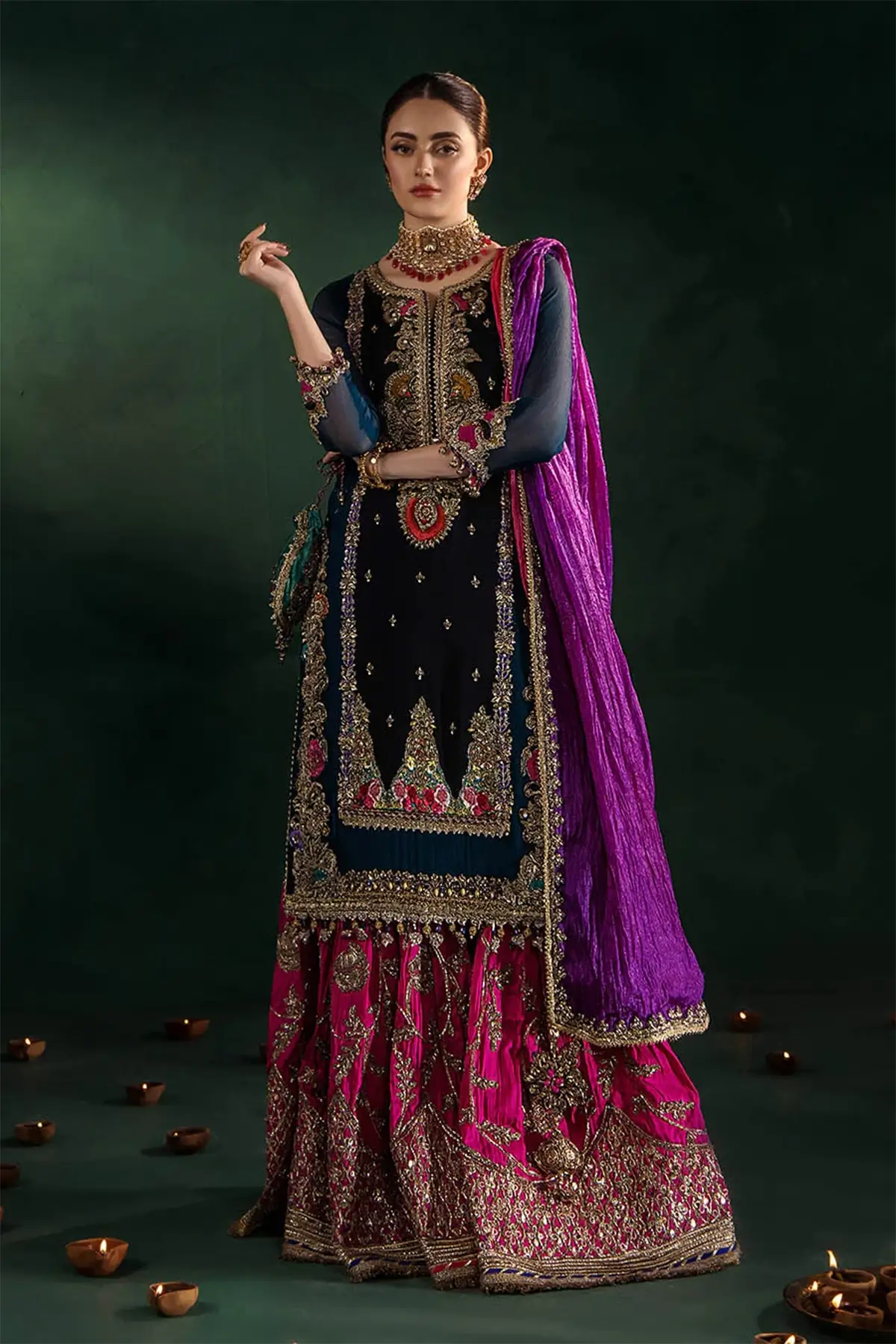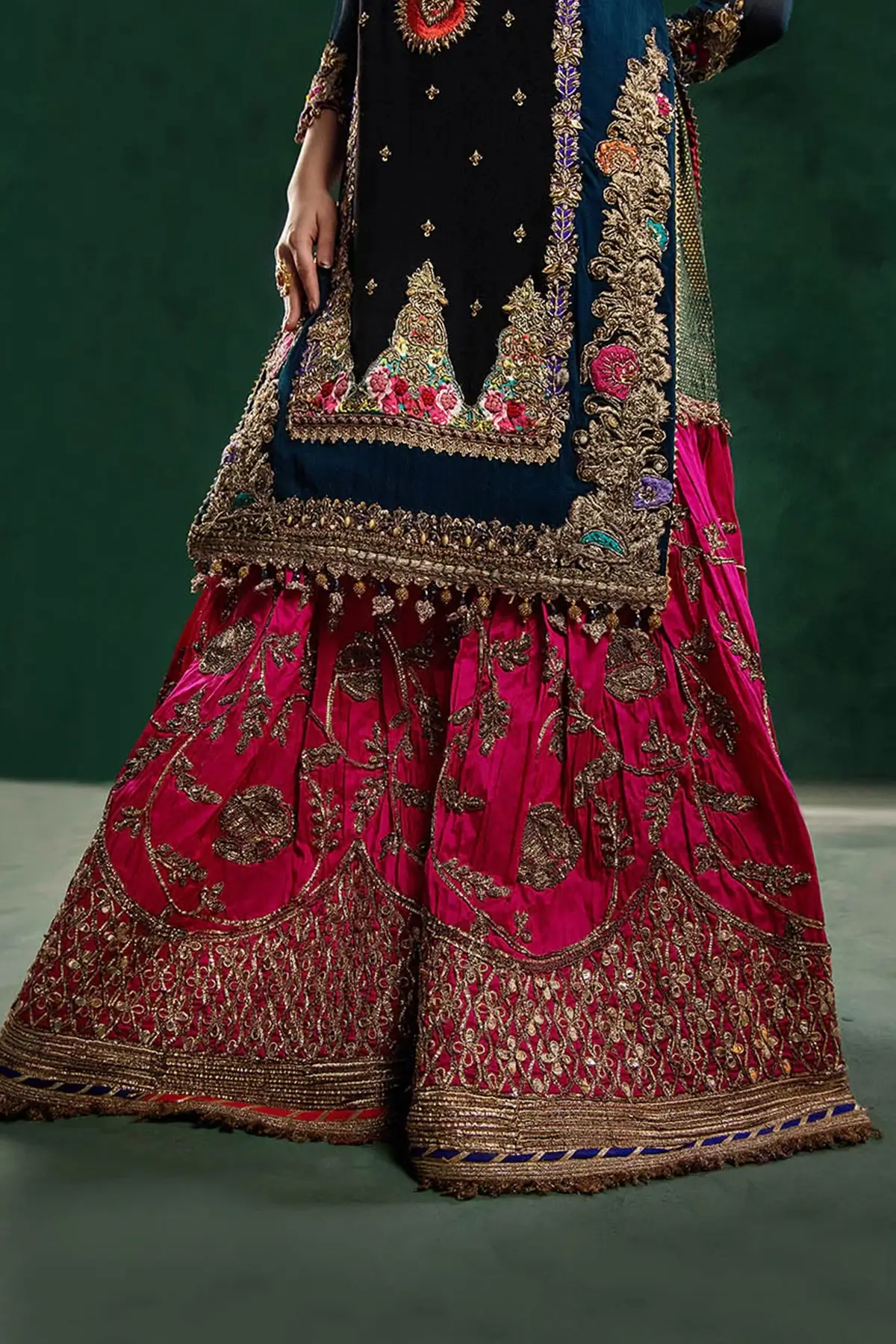 The shirt is designed with a striking center panel in black crinkle chiffon and side panels in zinc crinkle chiffon, each section hand‑embroidered with digital print appliqué, kora, dabka, zardozi, and gotta work for a richly detailed finish. The sleeves follow the same fabric and embellishment style for a cohesive, luxurious look. The included dupatta is crafted from double‑layered silk, featuring shocking pink on one side and carrot pink on the other, with a beautifully embellished border adorned with gotta and pearls. An optional net dupatta is also available, featuring delicate embellishment for added versatility. The sharara is designed with a kamkhwab jamawaar upper portion and a heavily embellished kattan silk lower flare, finished with intricate gotta work to complete the ensemble with elegance and grandeur.