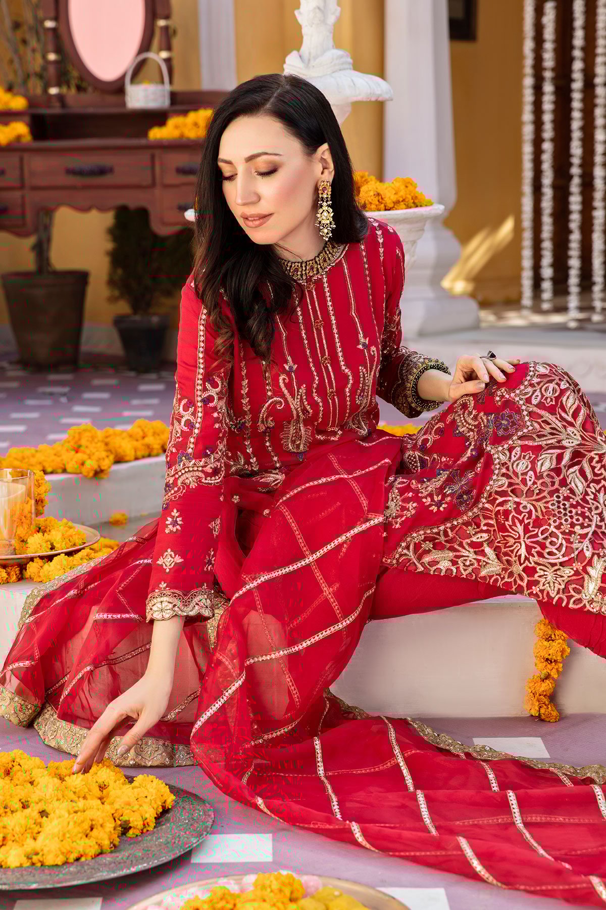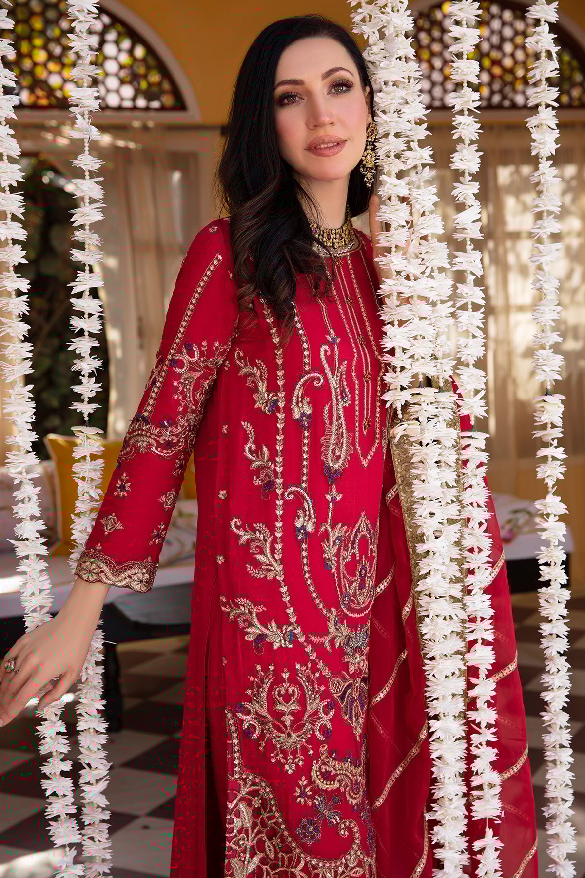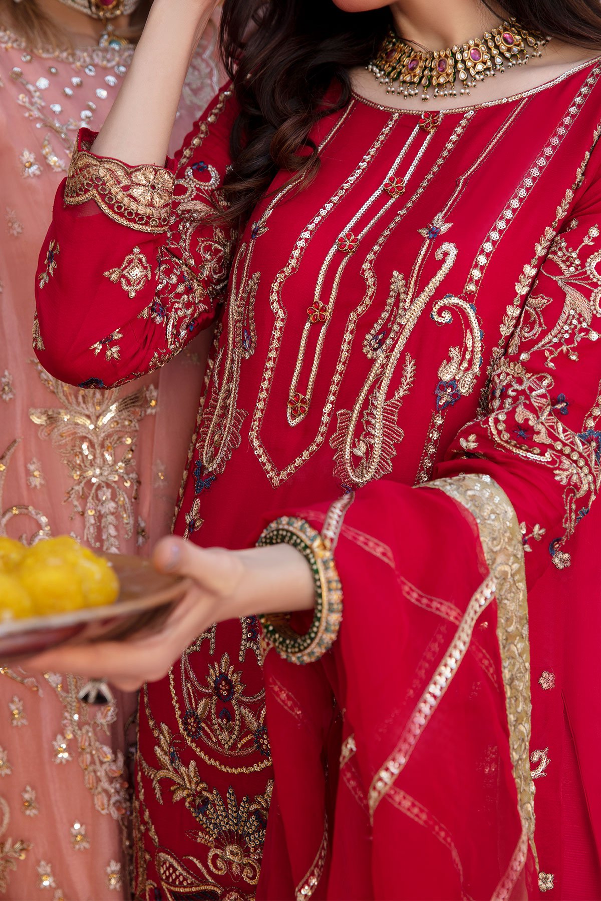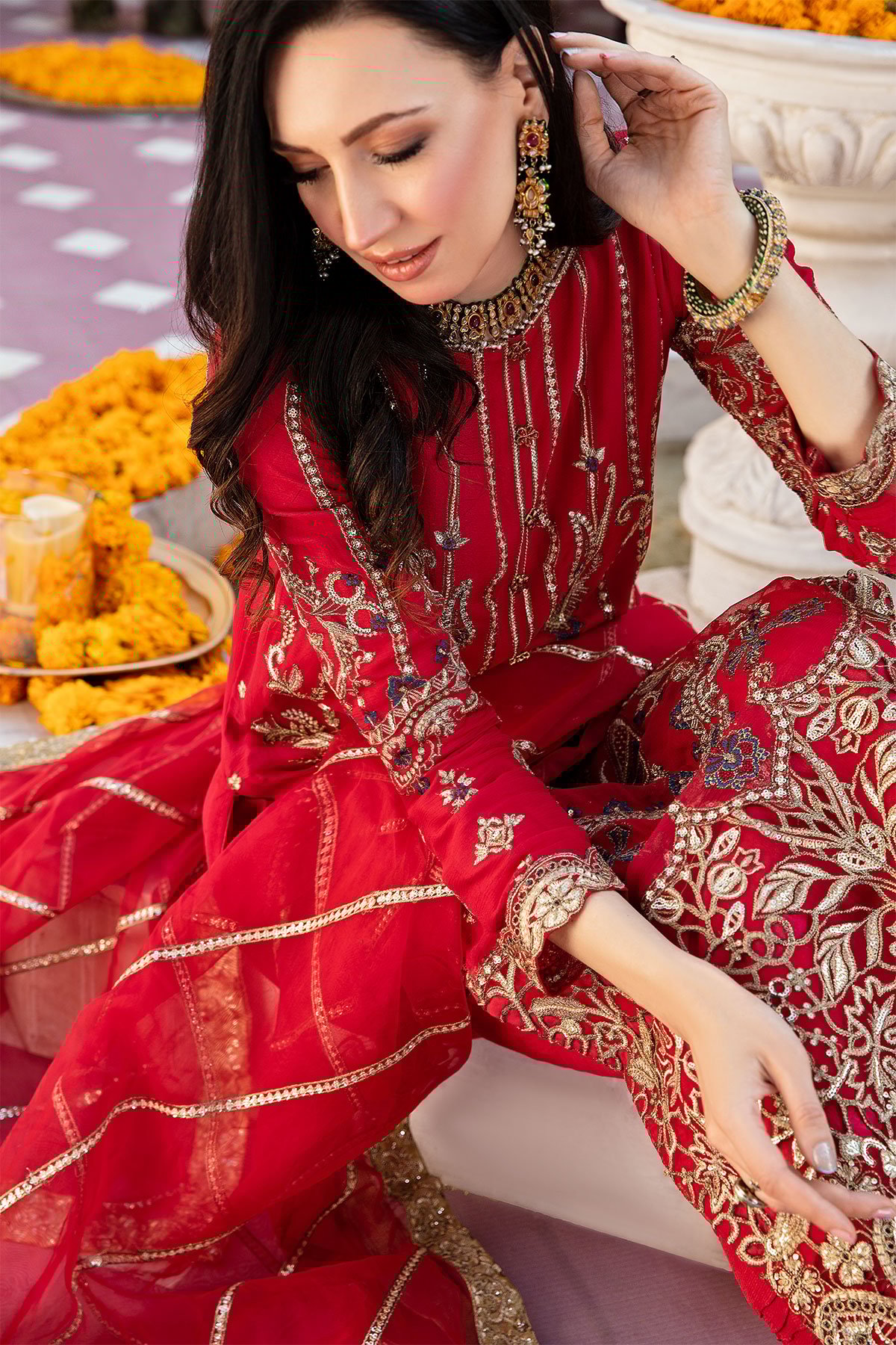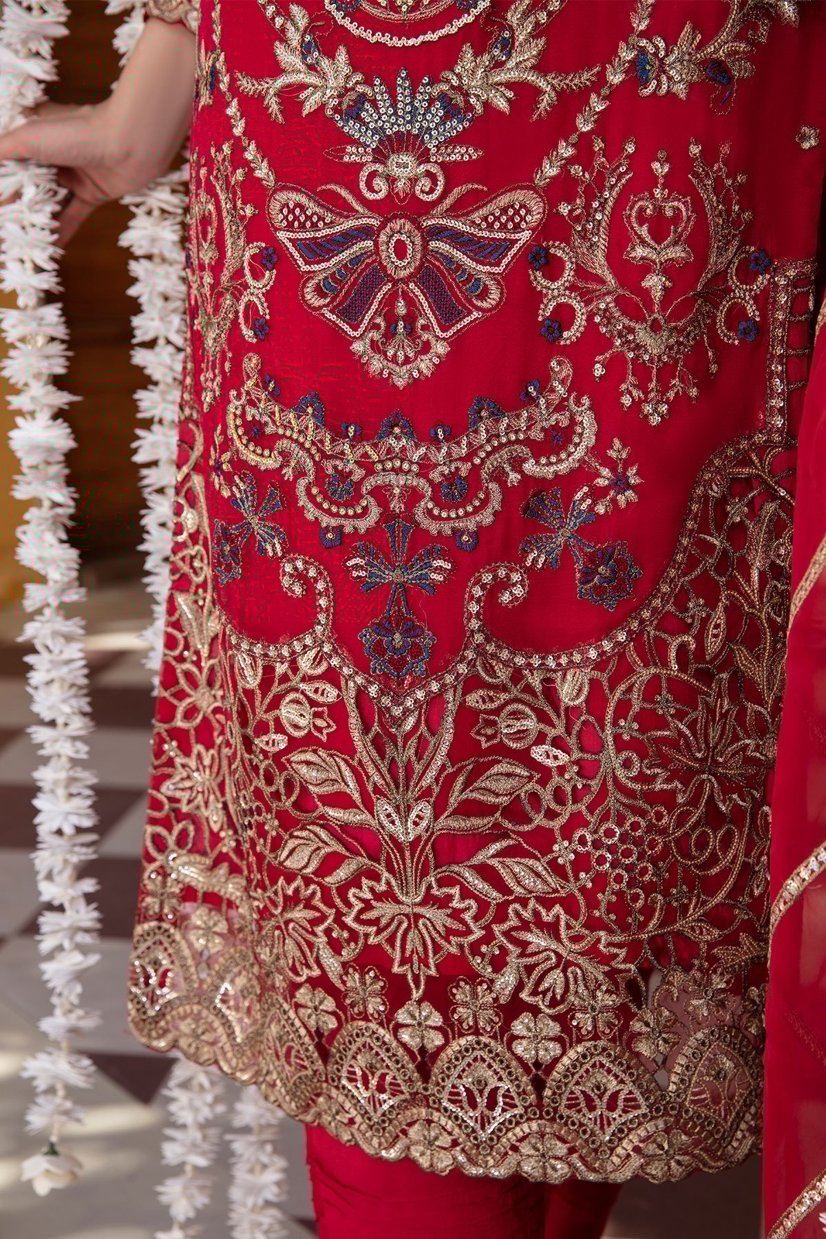 This beautiful 3 piece Khushian wedding collection suit features a straight shirt with luxury thread work embroidery throughout the front along with sequence and bead embellishments, finished with full length embroidered sleeves and straight crepe trousers. The look is finished with an embroidered organza dupatta. Perfect partywear suit.