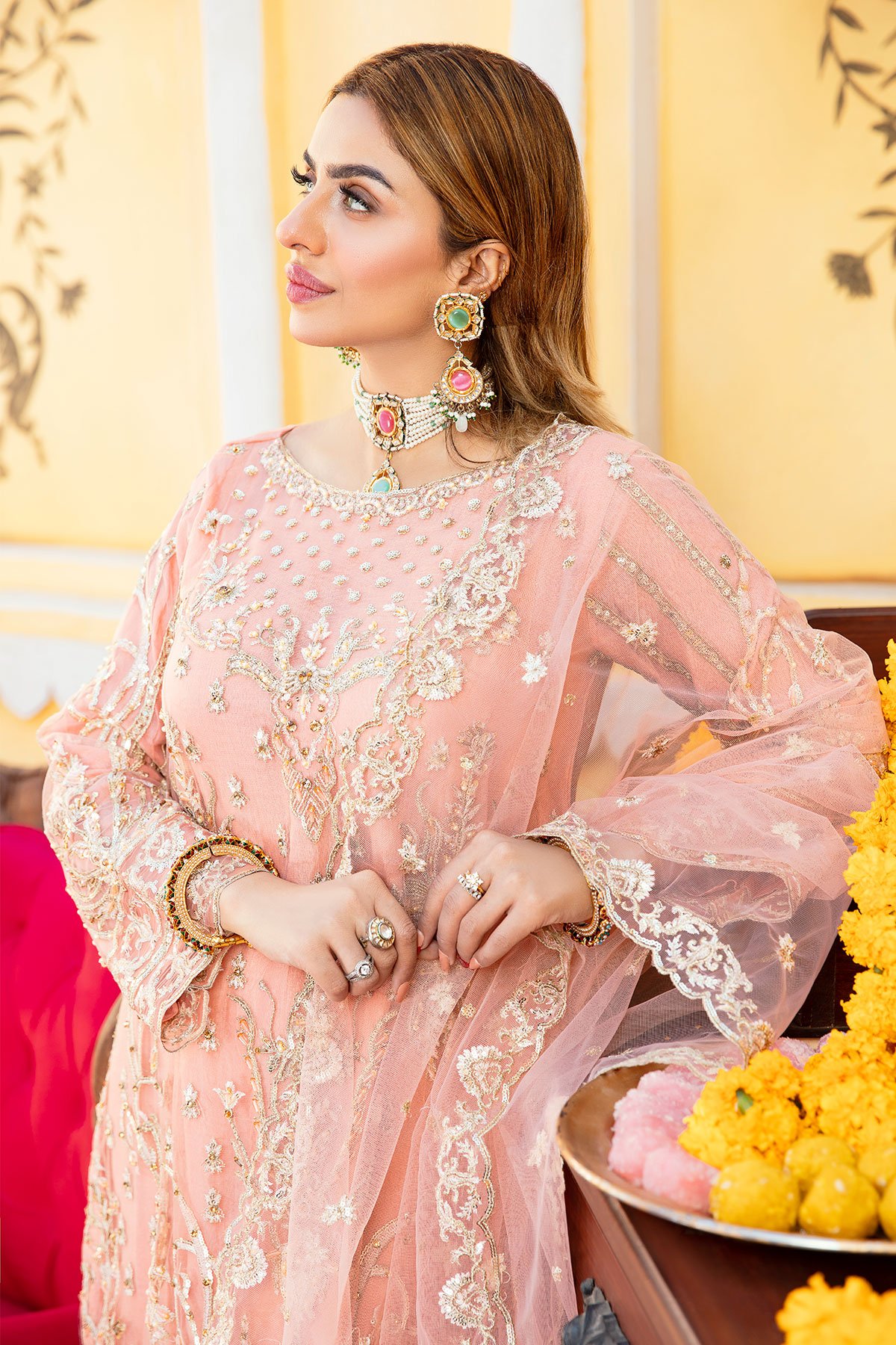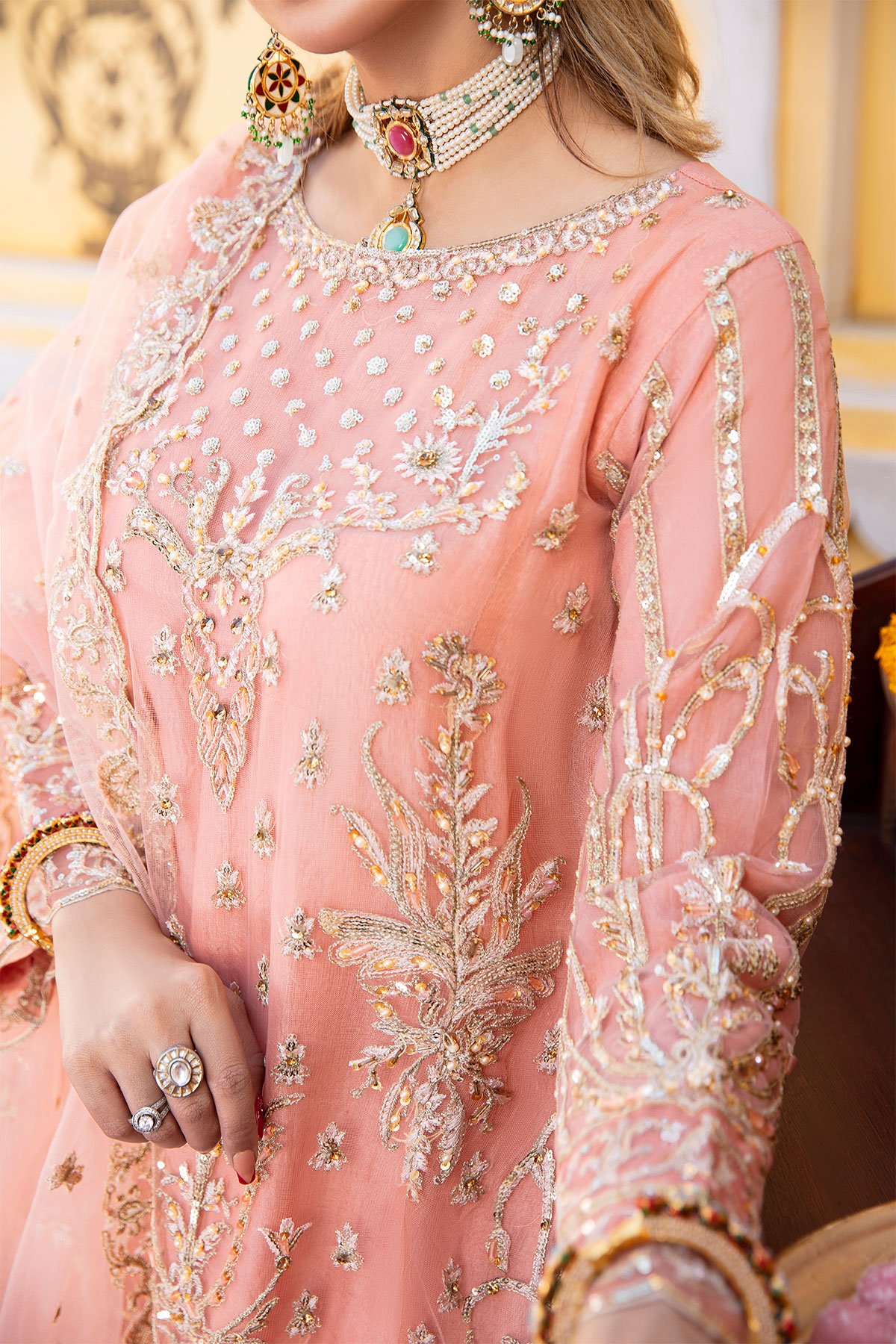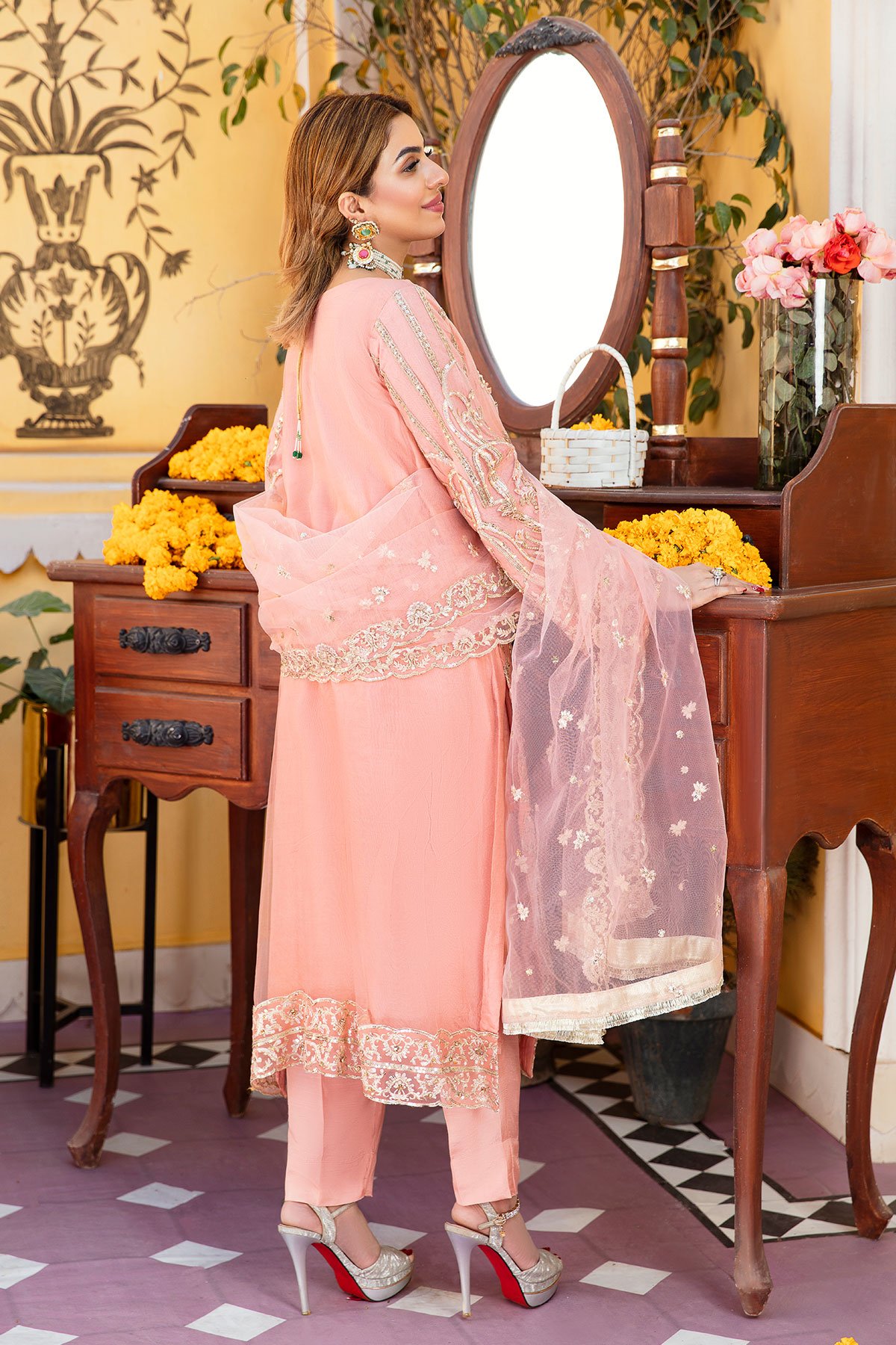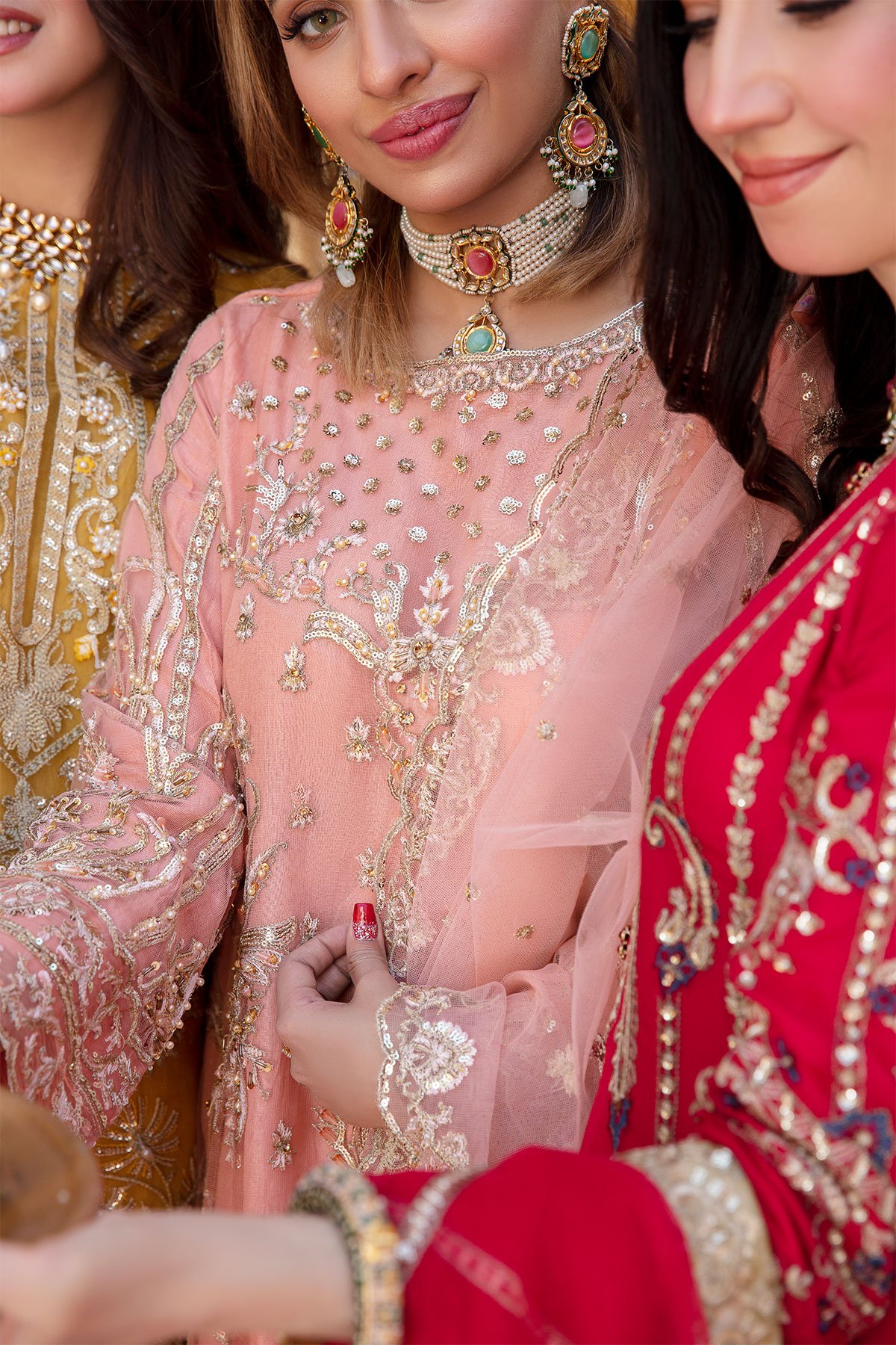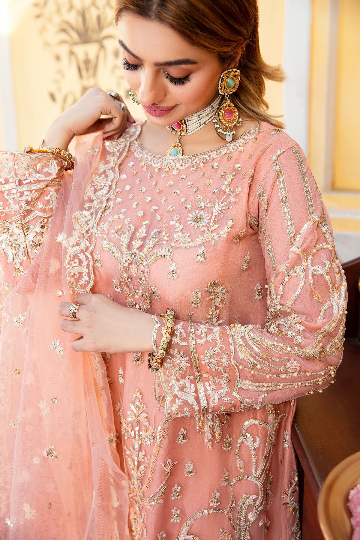 This beautiful 3 piece Khushian wedding collection suit features a straight shirt with luxury thread work embroidery throughout the front along with sequence and bead embellishments, finished with full length embroidered sleeves and straight leg crepe trousers. The look is finished with a net embroidered dupatta. Perfect partywear suit.