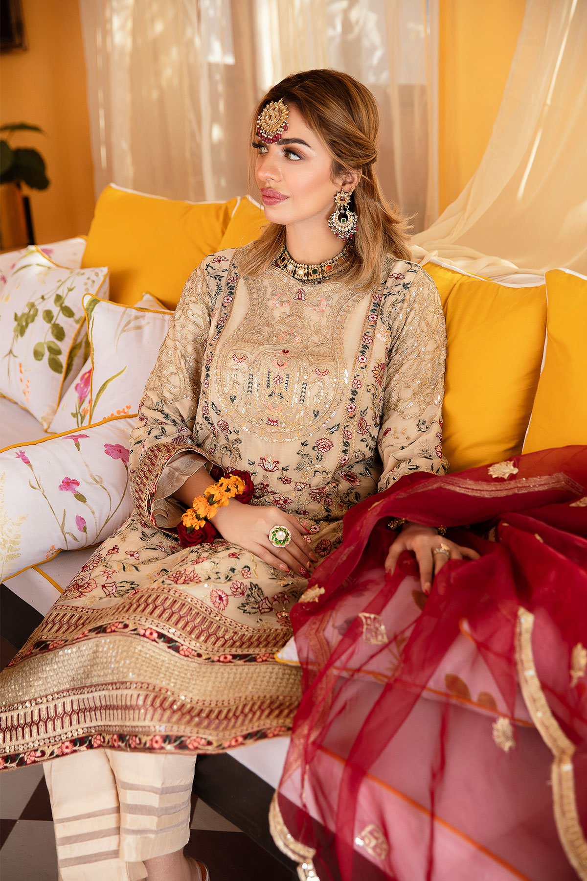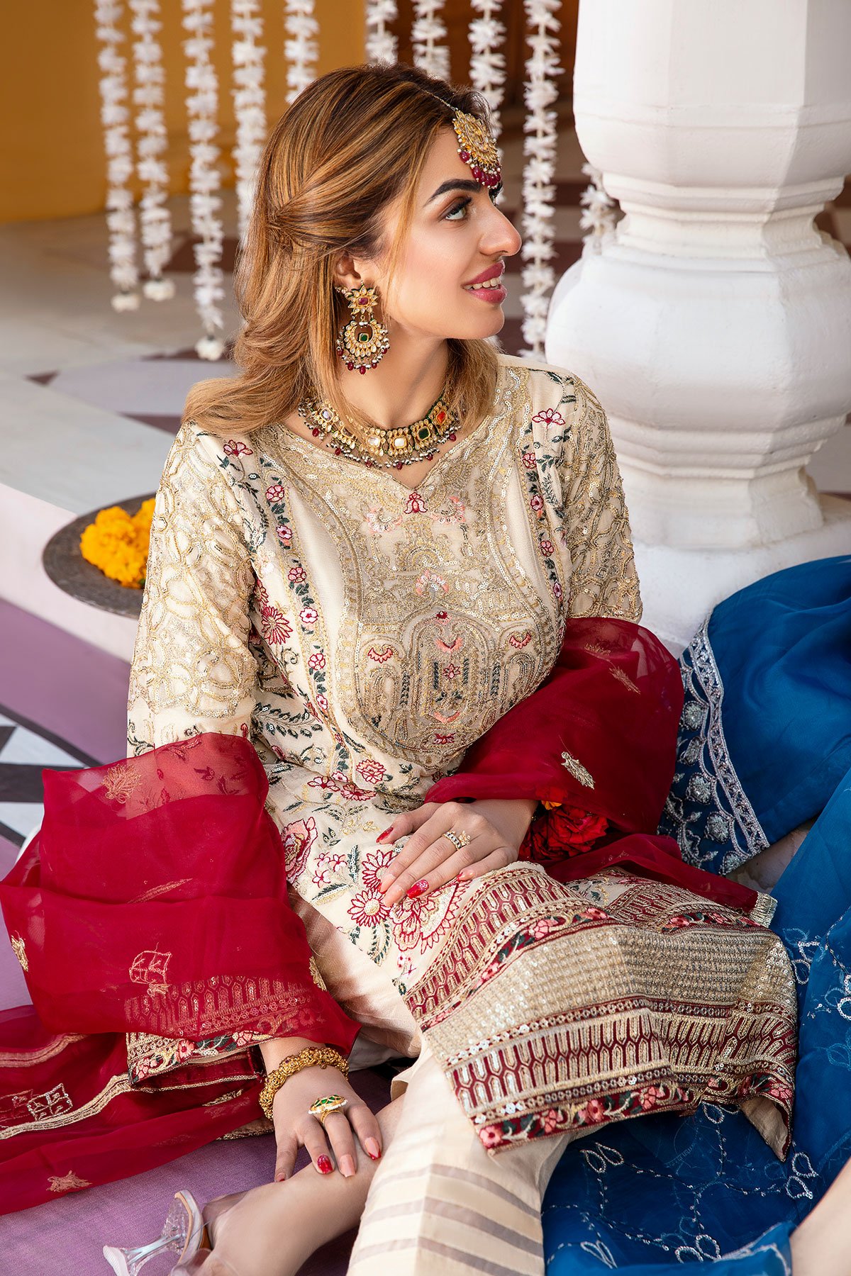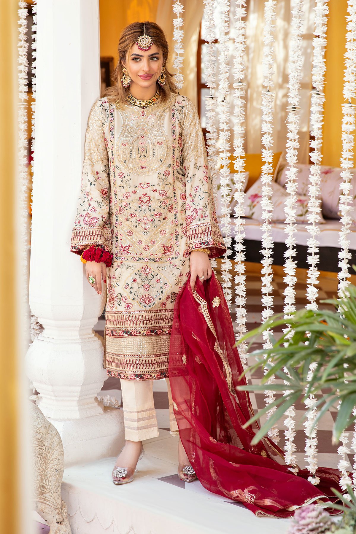 This beautiful 3 piece Khushian wedding collection suit a features a straight shirt with luxury multi coloured thread work embroidery throughout the front along with dori and sequence embellishments, finished with full length embroidered sleeves. It comes with straight crepe trousers and the look is finished with a contrasted organza embroidered dupatta. Perfect partywear suit.