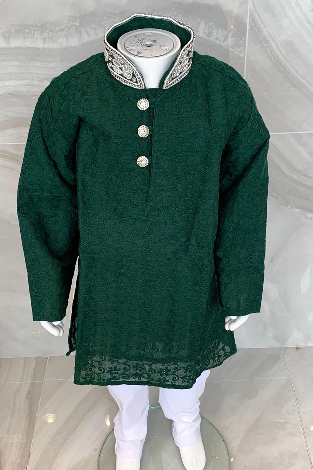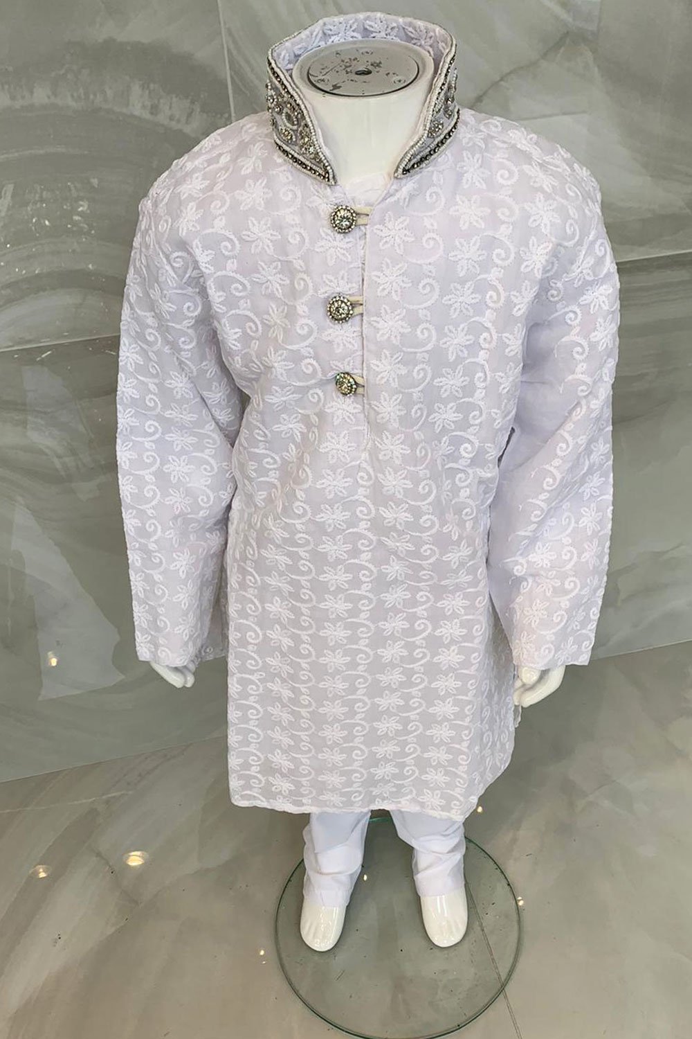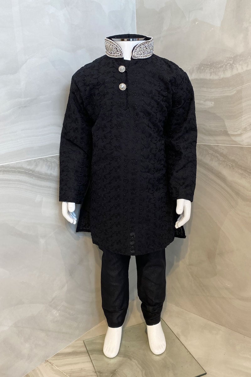This beautiful 2 piece boys shalwar kameez features a straight chicken shirt with silver embroidered collar neck along with silver button embellishments on the front. It comes with full length chicken sleeves and the look is finished with a plain churidaar bottom.