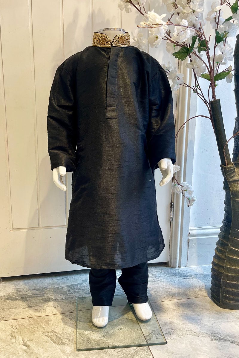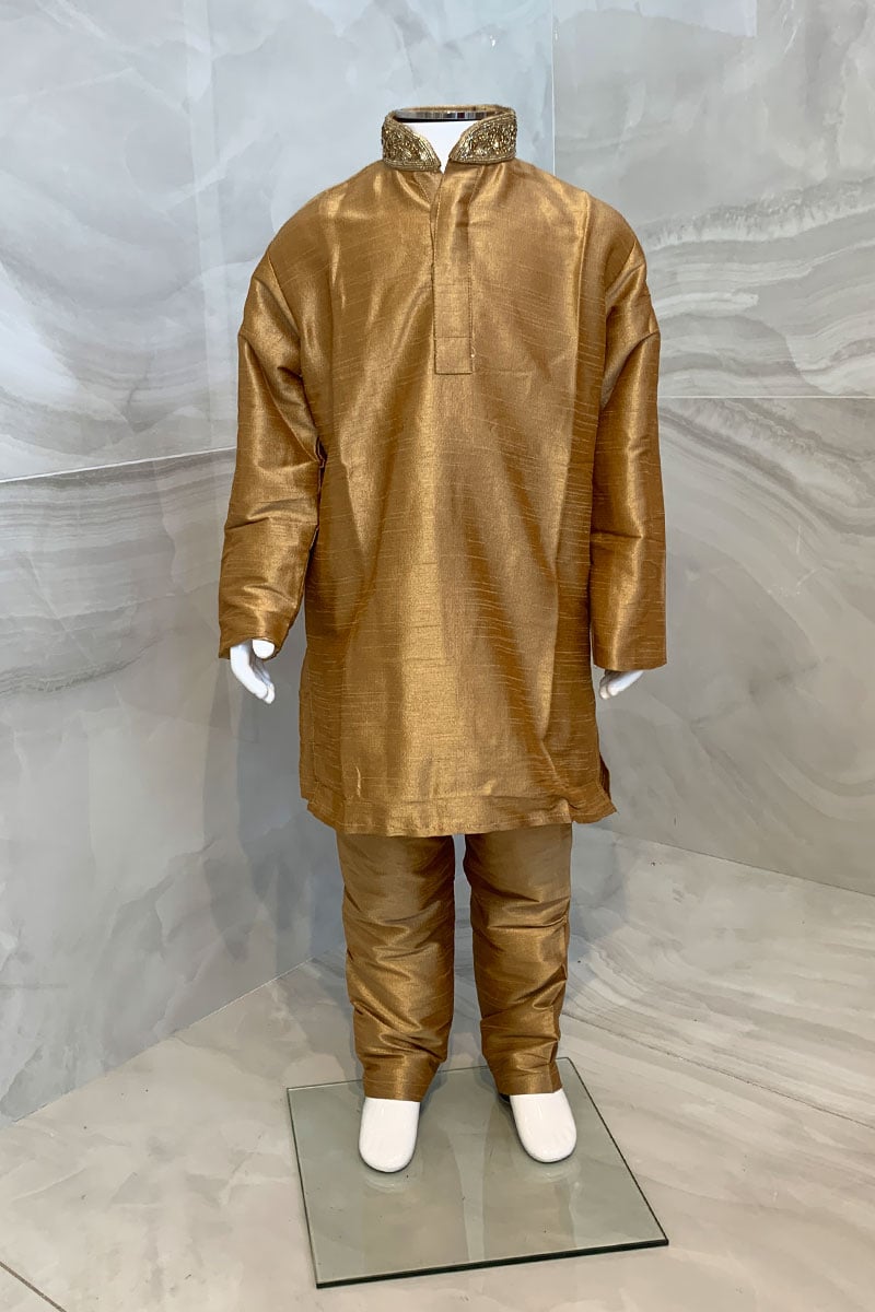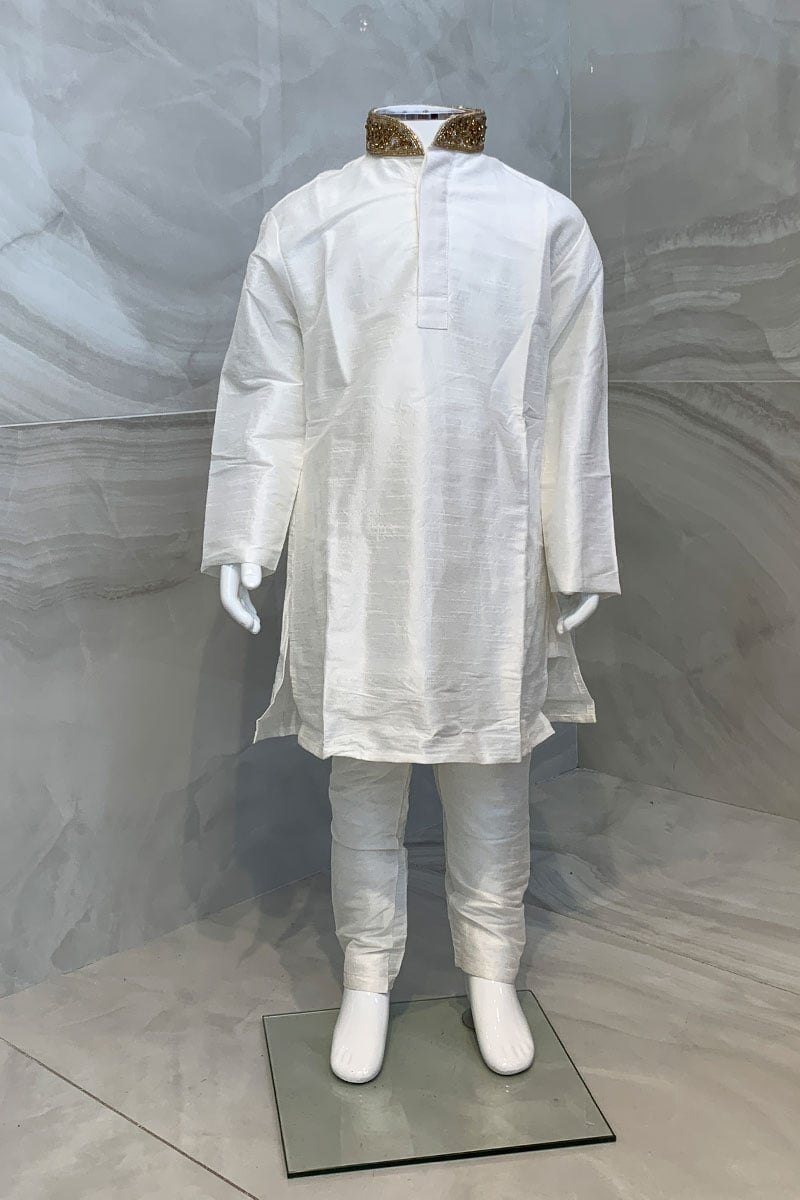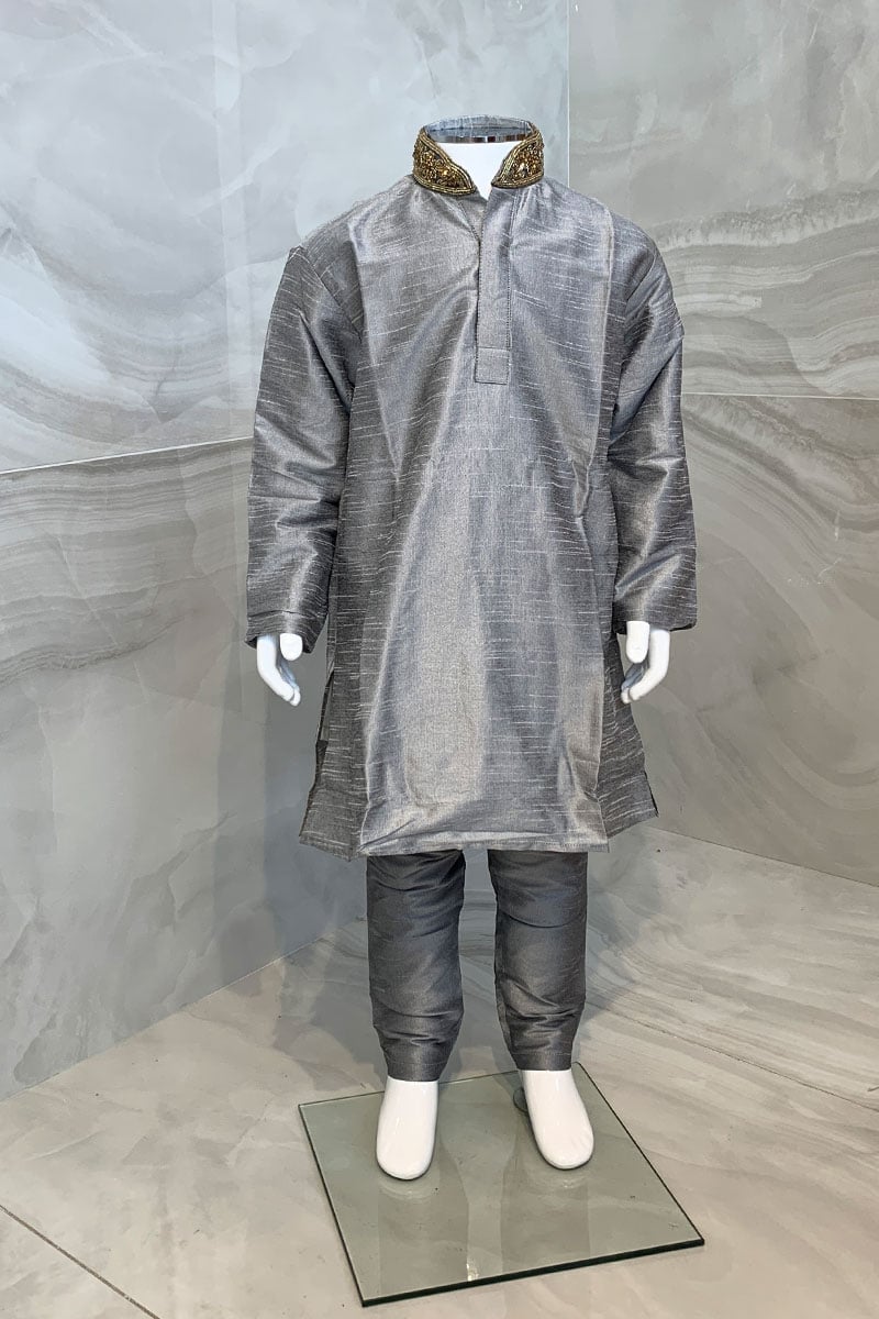 This beautiful 2 piece boys kurta pyjama features a straight raw silk shirt with embroidered collar. It comes with full length sleeves and the look is finished with a plain raw silk trousers.