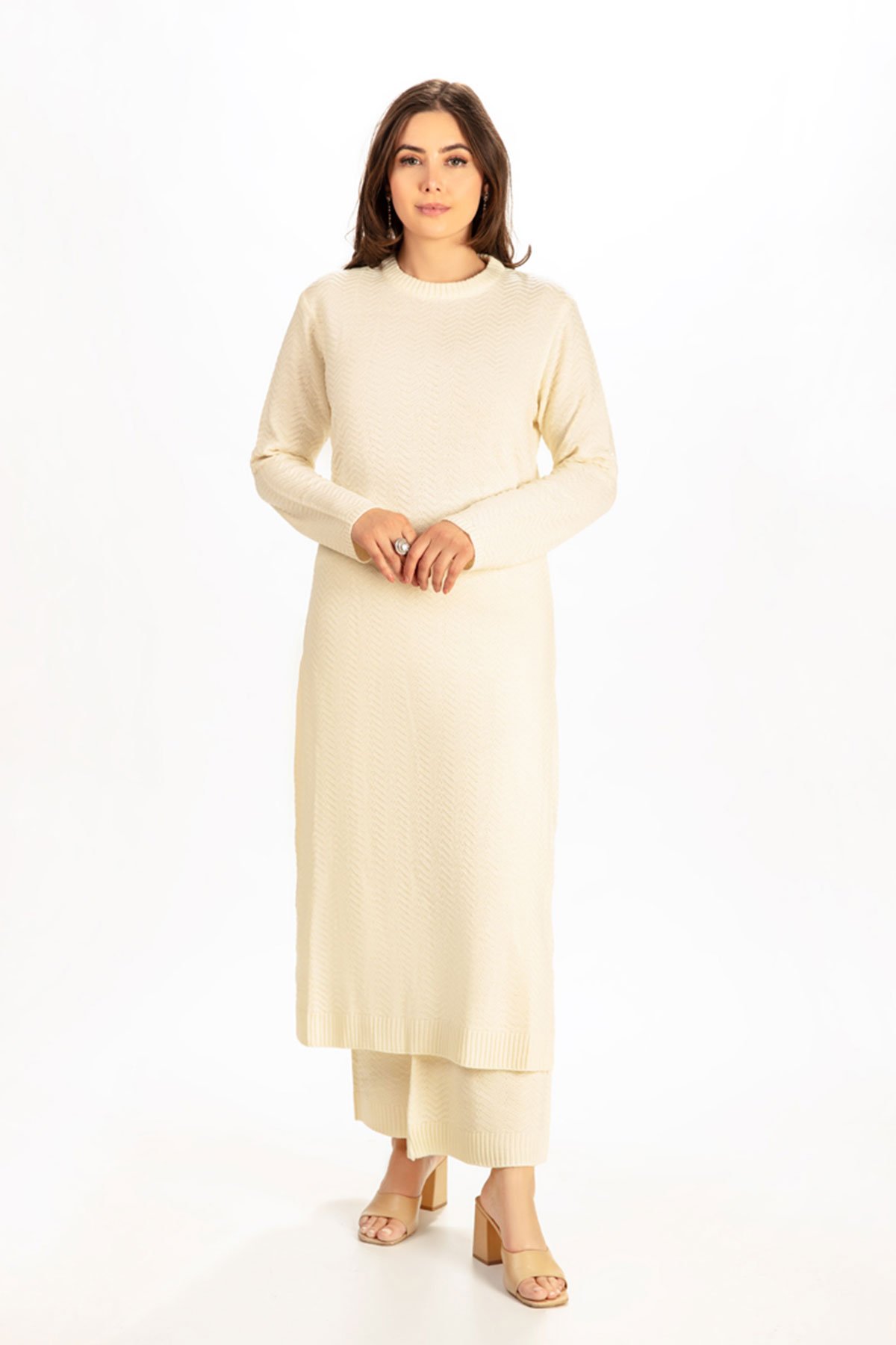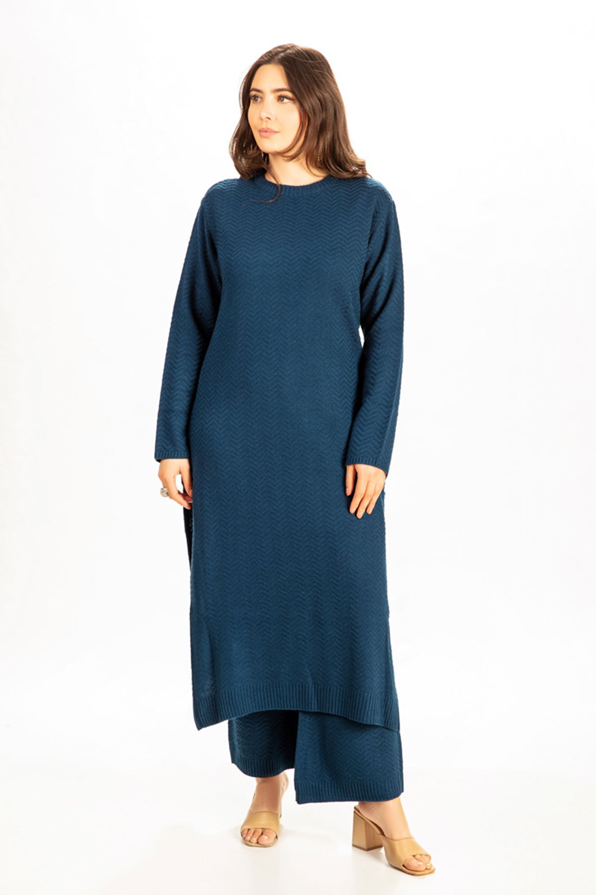 Get the cosy vibe in a knitted co-ord, this beautiful 2 piece knitwear co-ord set features a long length jumper with open sides and knitwear straight leg trousers. Perfect casual attire for this winter look.