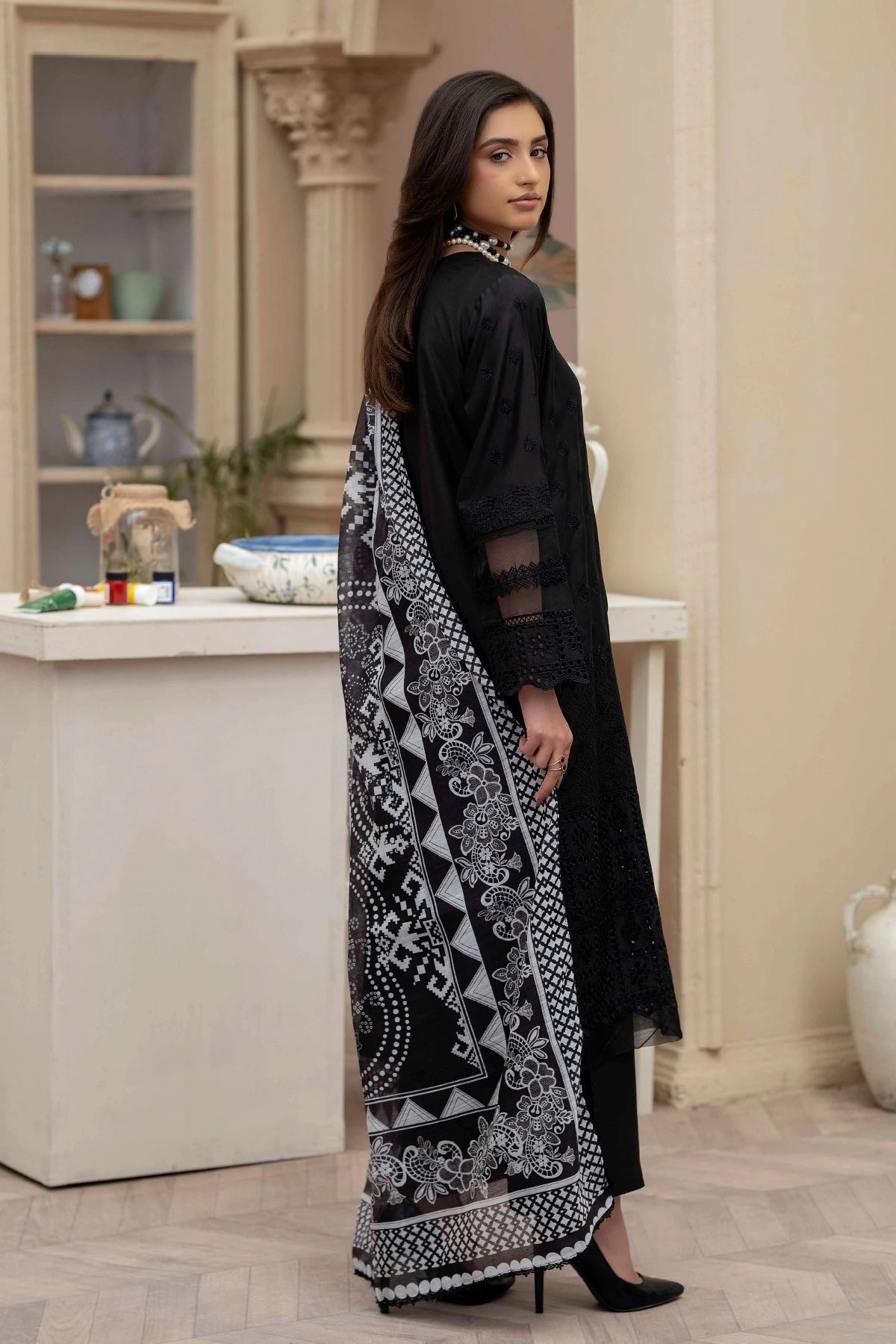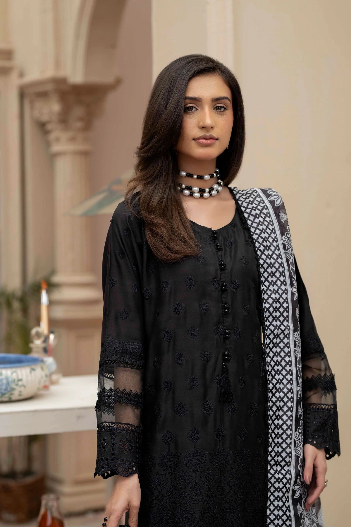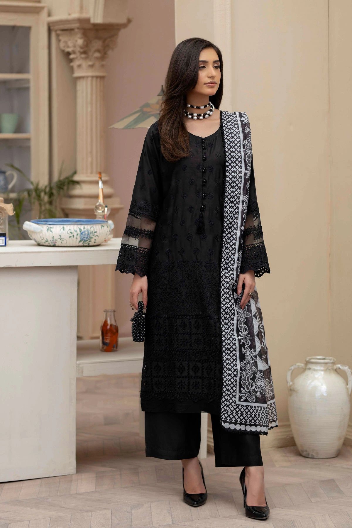 This beautiful 3 piece Sana Safinaz inspired viscose suit features a straight chikankari embroidered shirt with bead embellishment along the front. It comes with full length embroidered sleeves and straight plazo trousers. The look is finished with a luxury digital printed organza dupatta. Perfect mother and daughter collection for this Eid.