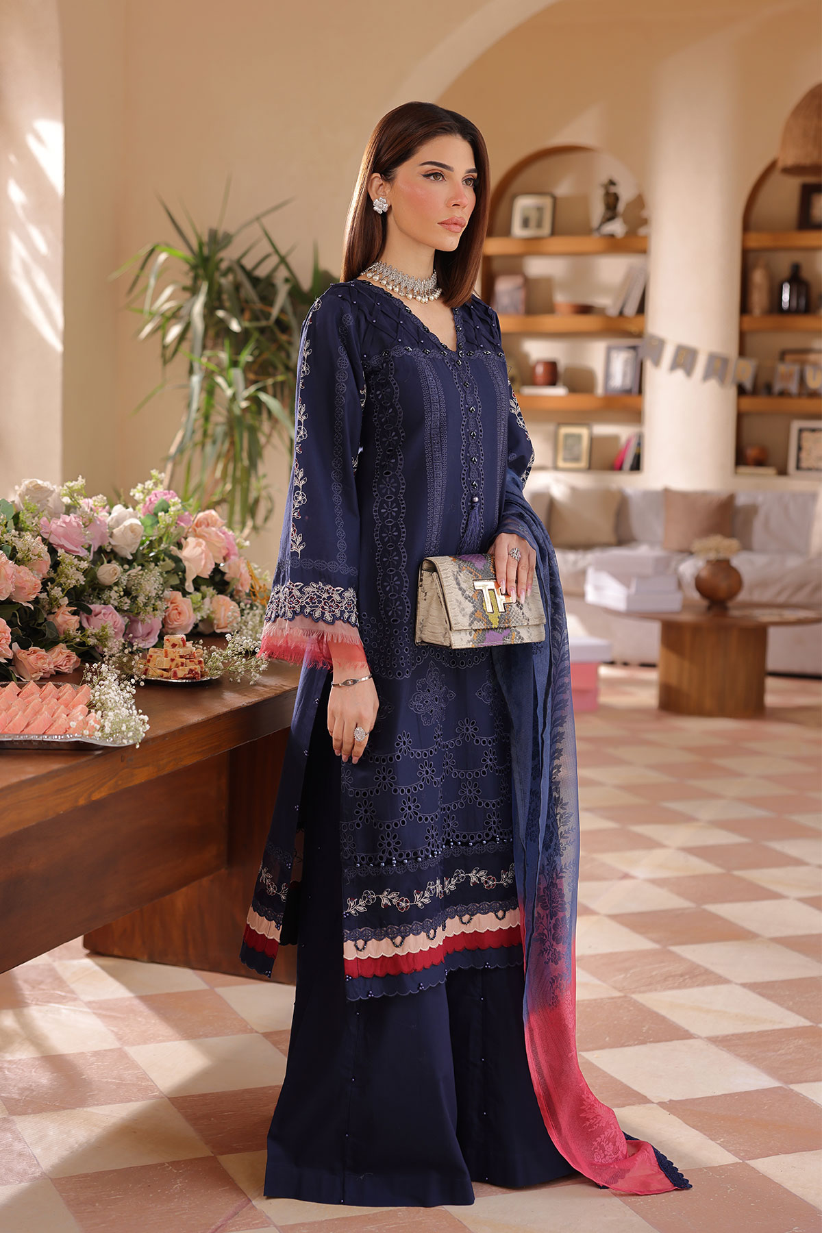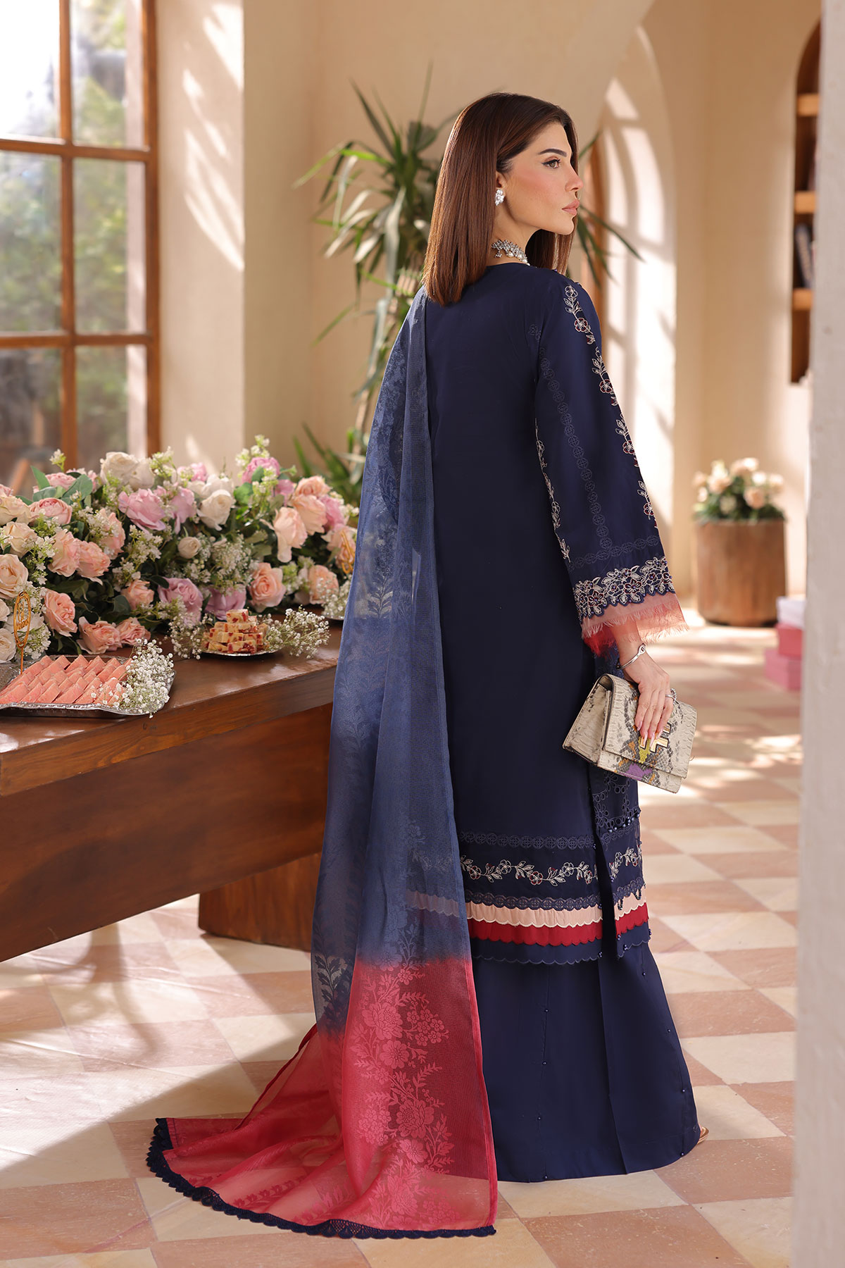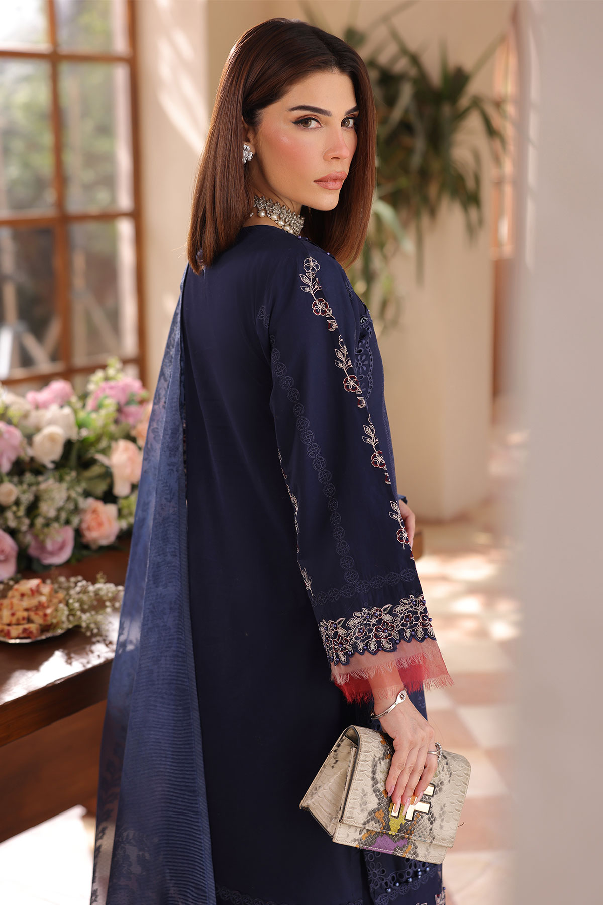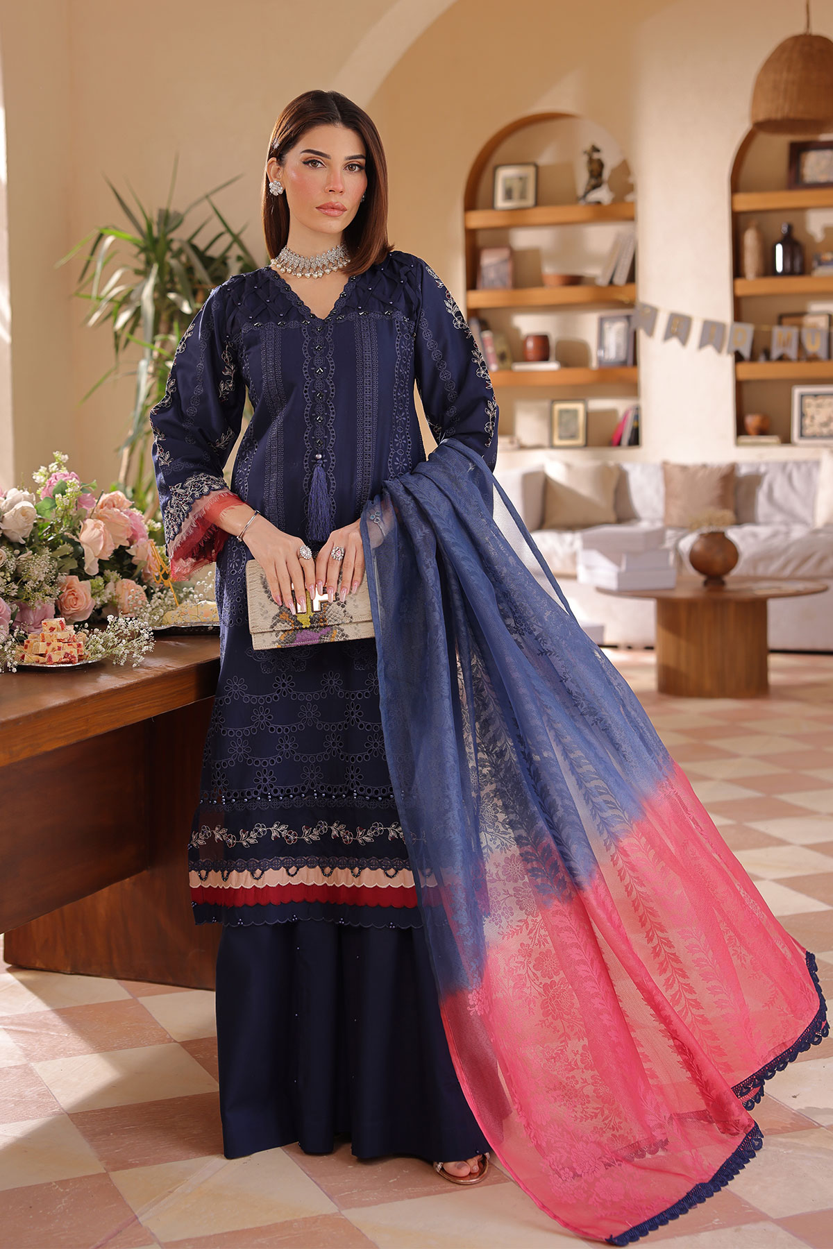 This beautiful 3 piece Lamhe collection features a straight Chikan Kari shirt with sequence embellishments throughout, finished with piping embellishment on the contrasted border. It comes with full length embroidered sleeves. Paired with wide leg plazo trousers and the look is finished with an embroidered organza two toned dupatta. Perfect mother and daughter collection for this Eid.