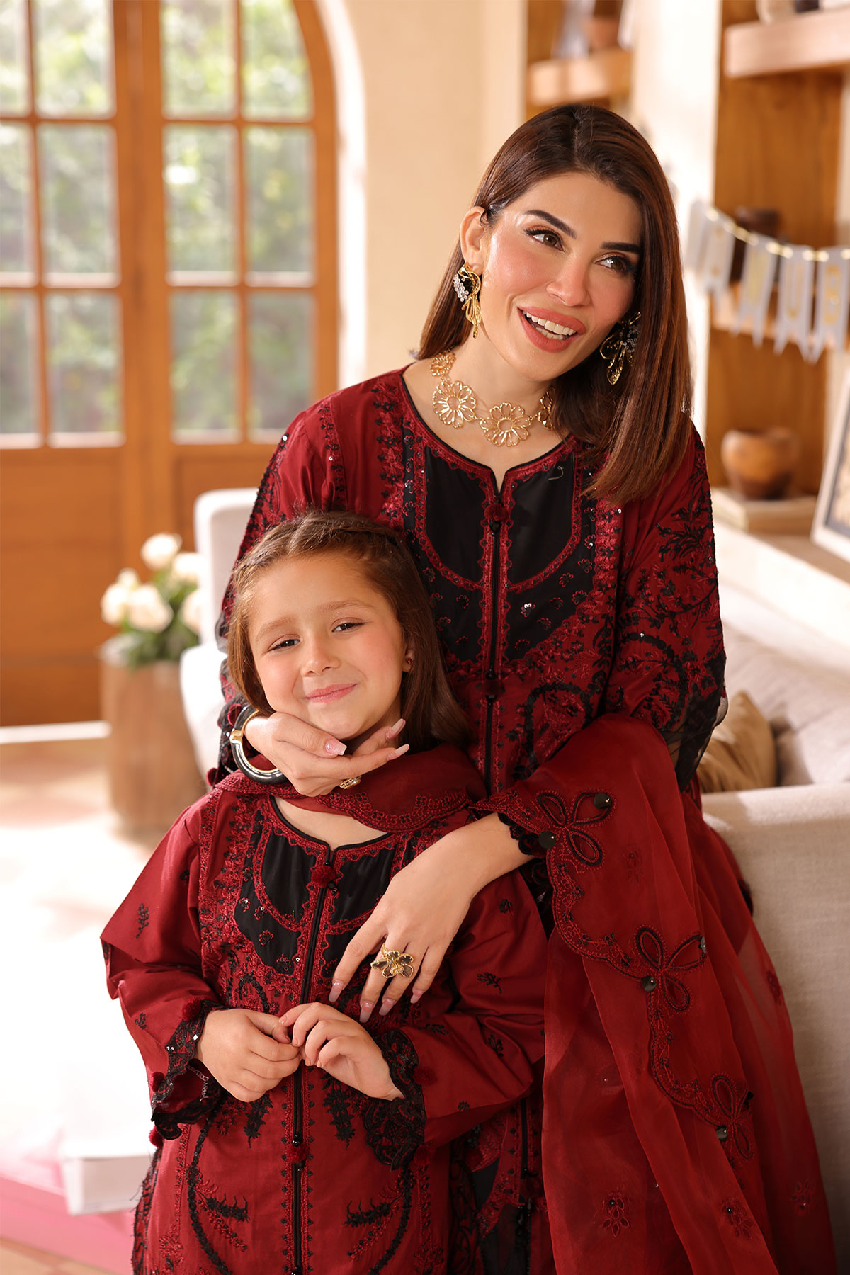 This beautiful 3 piece Lamhe kids collection features a straight Chikan Kari shirt with sequence embellishments throughout with an organza embroidered border. It comes with full length embroidered sleeves. Paired with straight leg trousers and the look is finished with an organza embroidered dupatta. Perfect mother and daughter collection for this Eid.