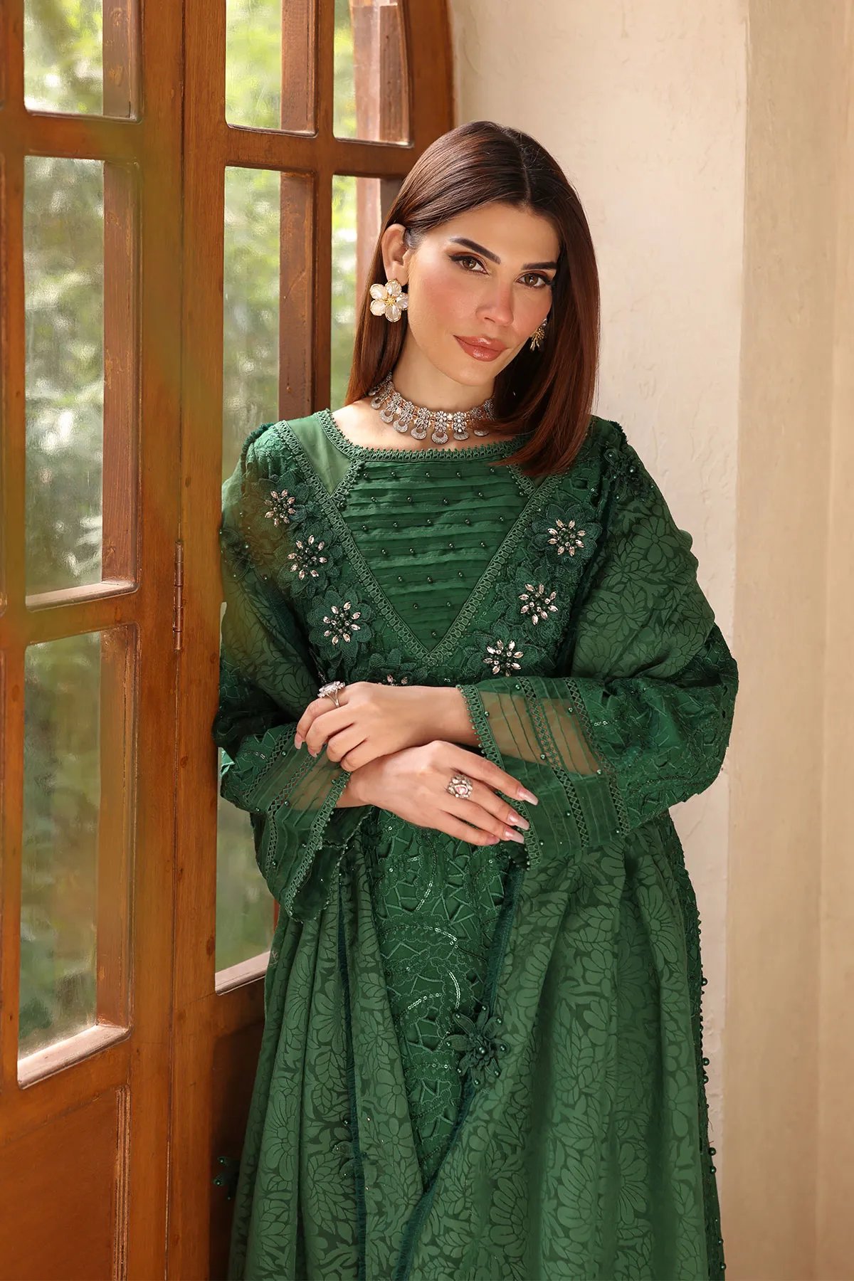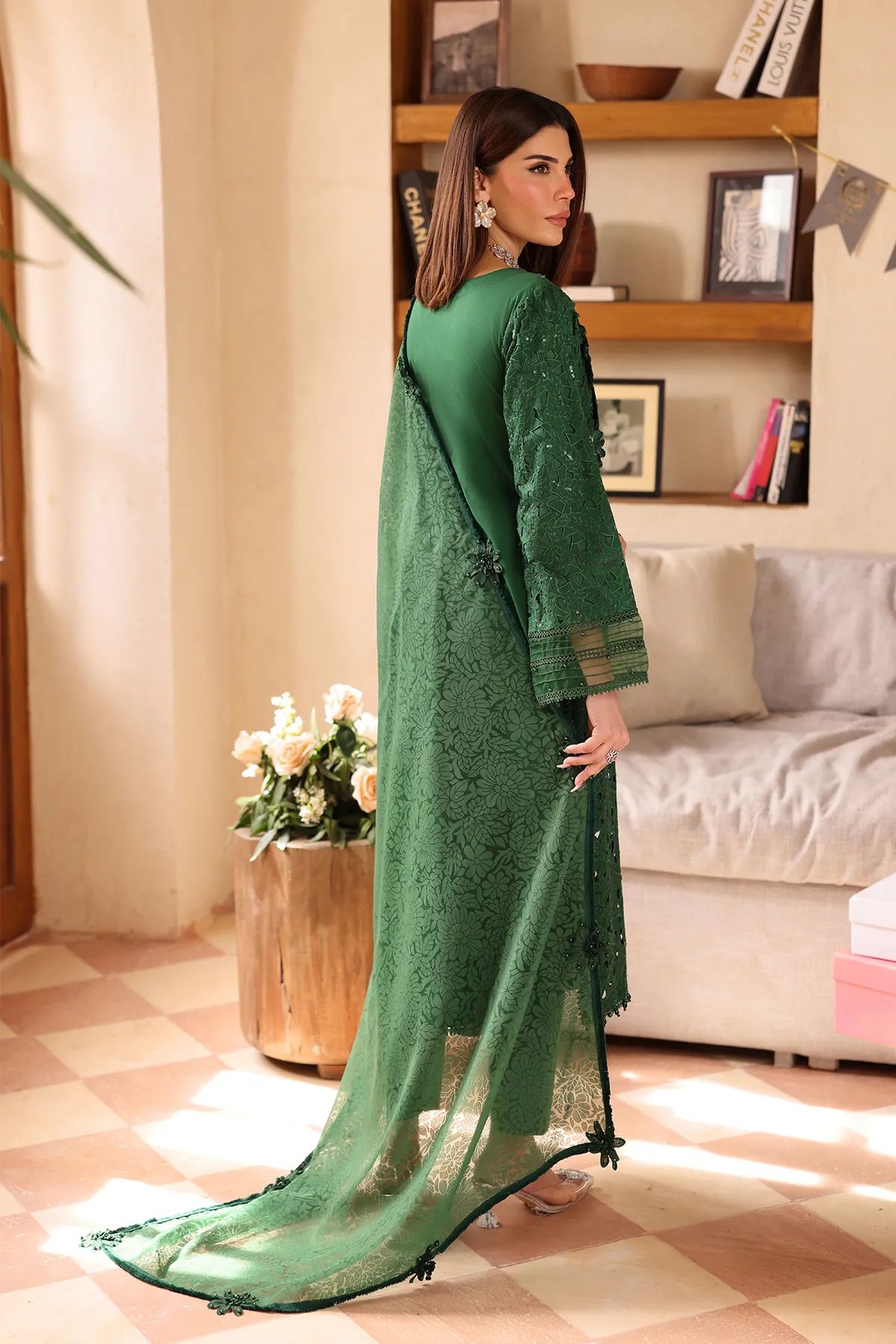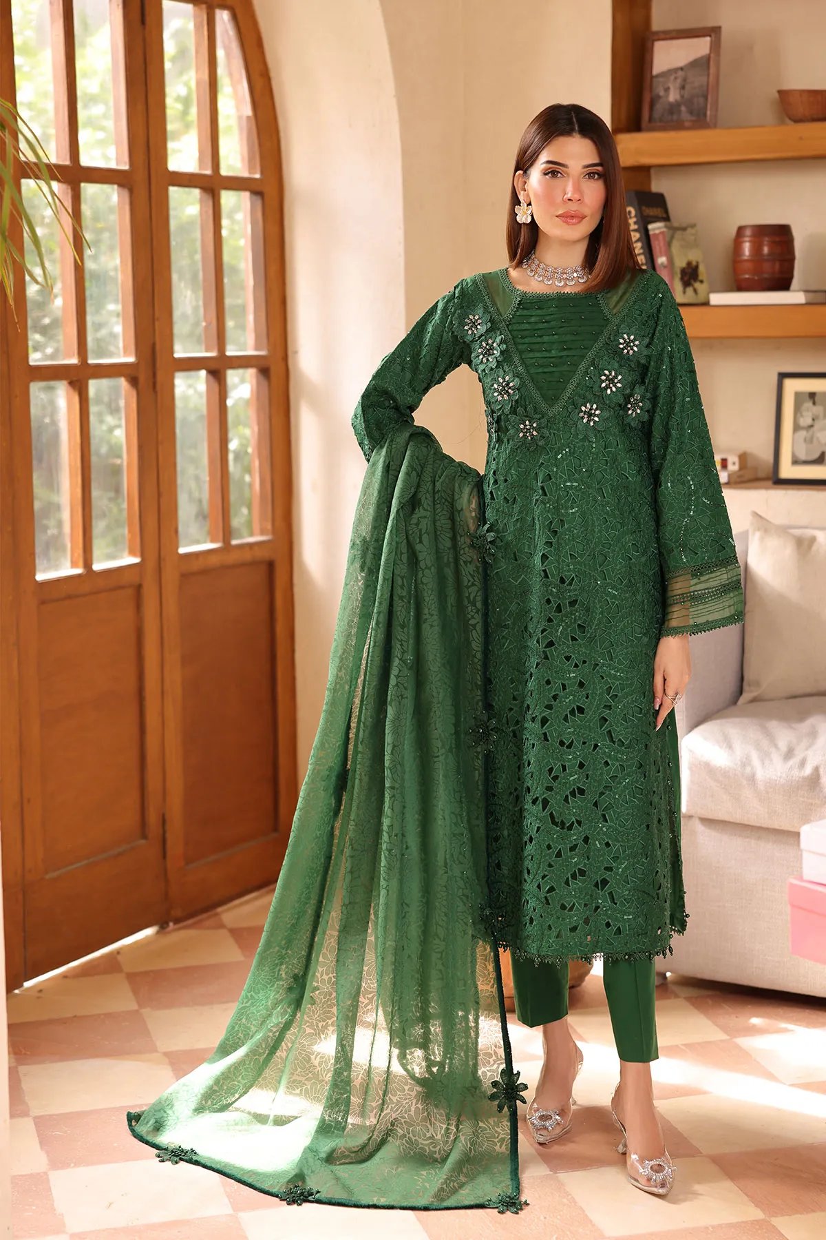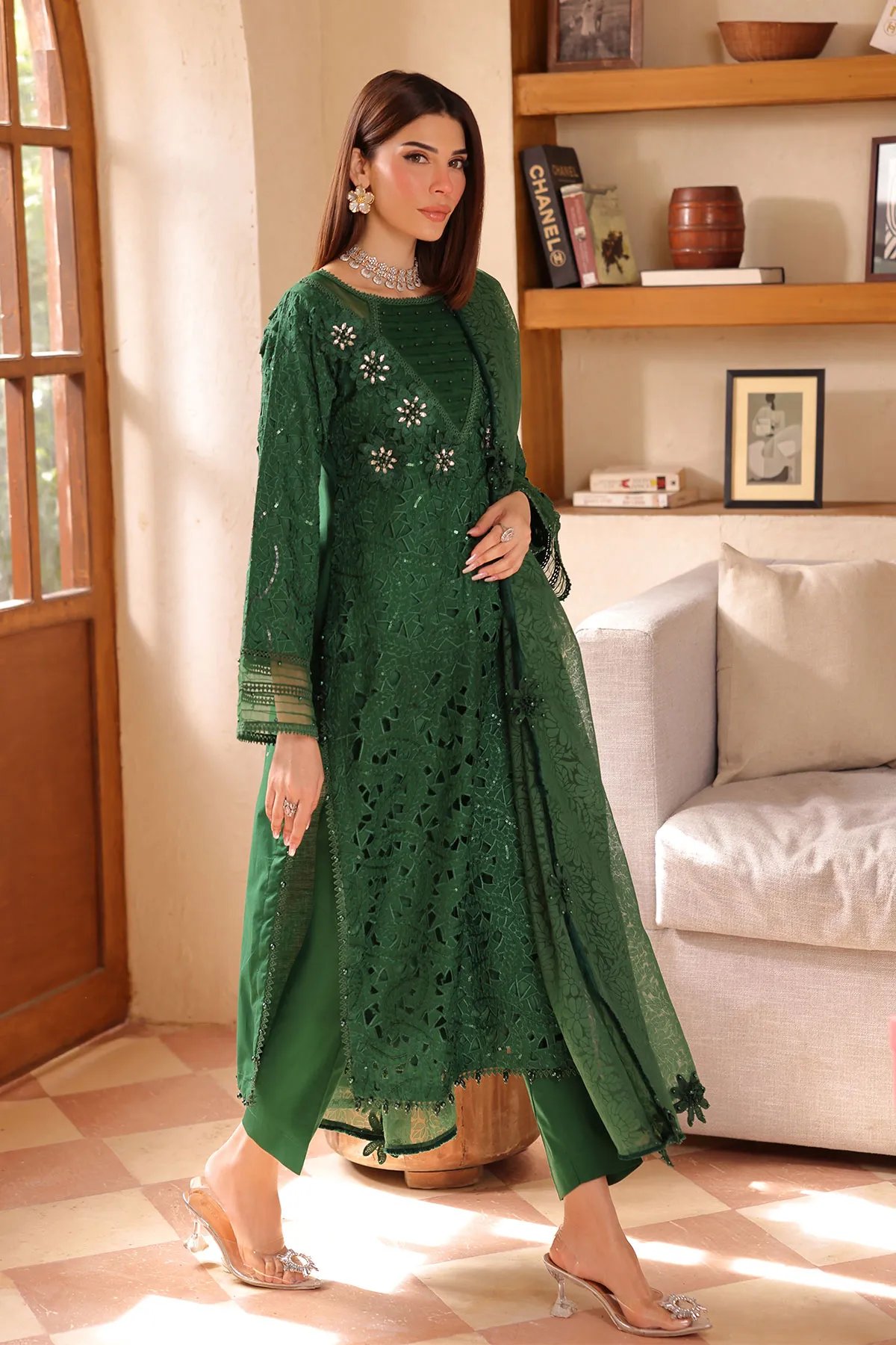 This beautiful 3 piece Lamhe collection features a straight Chikan Kari shirt with sequence embellishments throughout along with lace floral patterns with beads work designs on the front, finished with full length embroidered sleeves. Paired with straight leg trousers and the look is finished with a self printed organza dupatta. Perfect mother and daughter collection for this Eid.