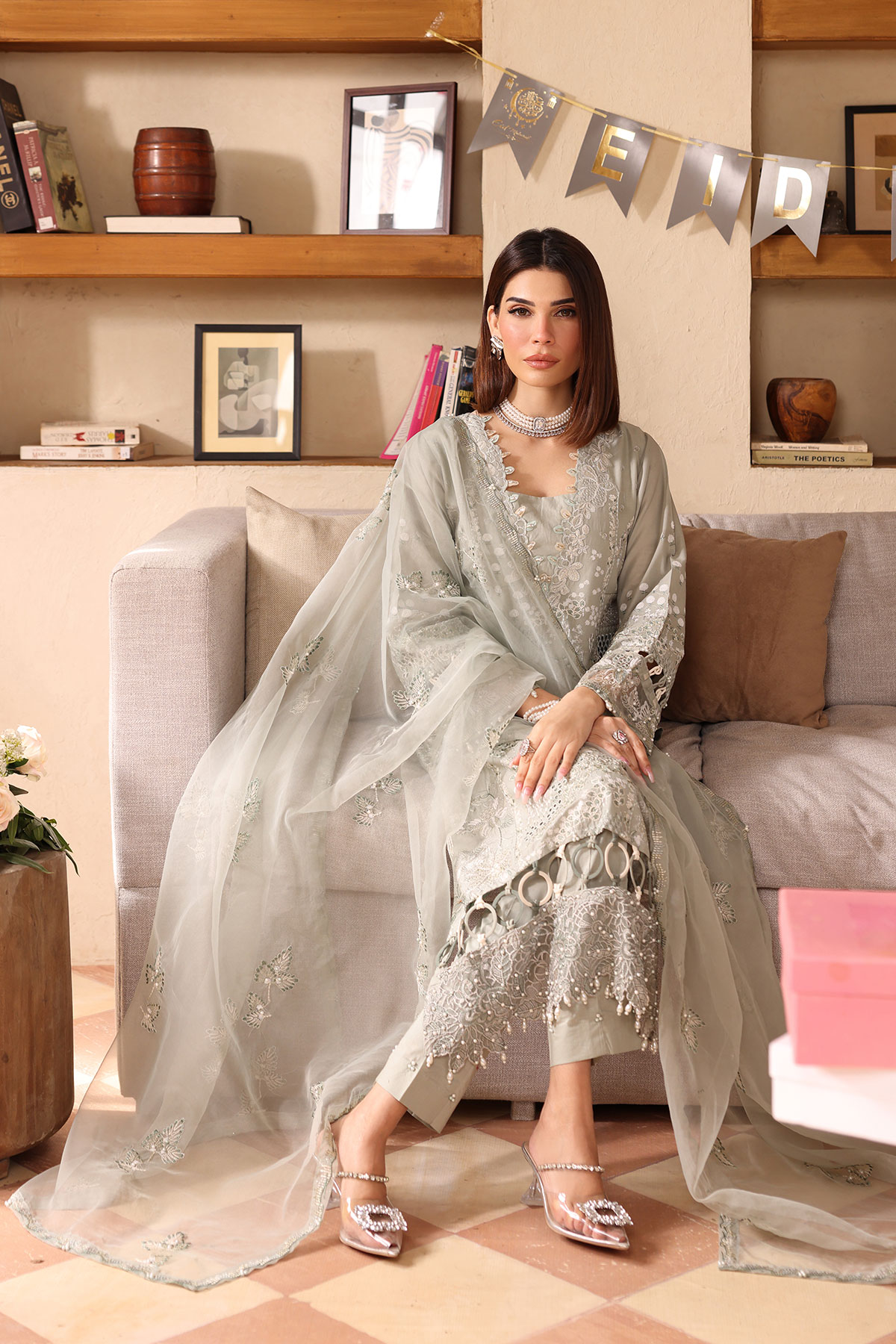 This beautiful 3 piece Lamhe collection features a straight Chikan Kari shirt with sequence embellishments throughout with a cut design border with piping embellishments. It comes with full length embroidered sleeves. Paired with straight leg trousers and the look is finished with an organza embroidered dupatta. Perfect mother and daughter collection for this Eid.