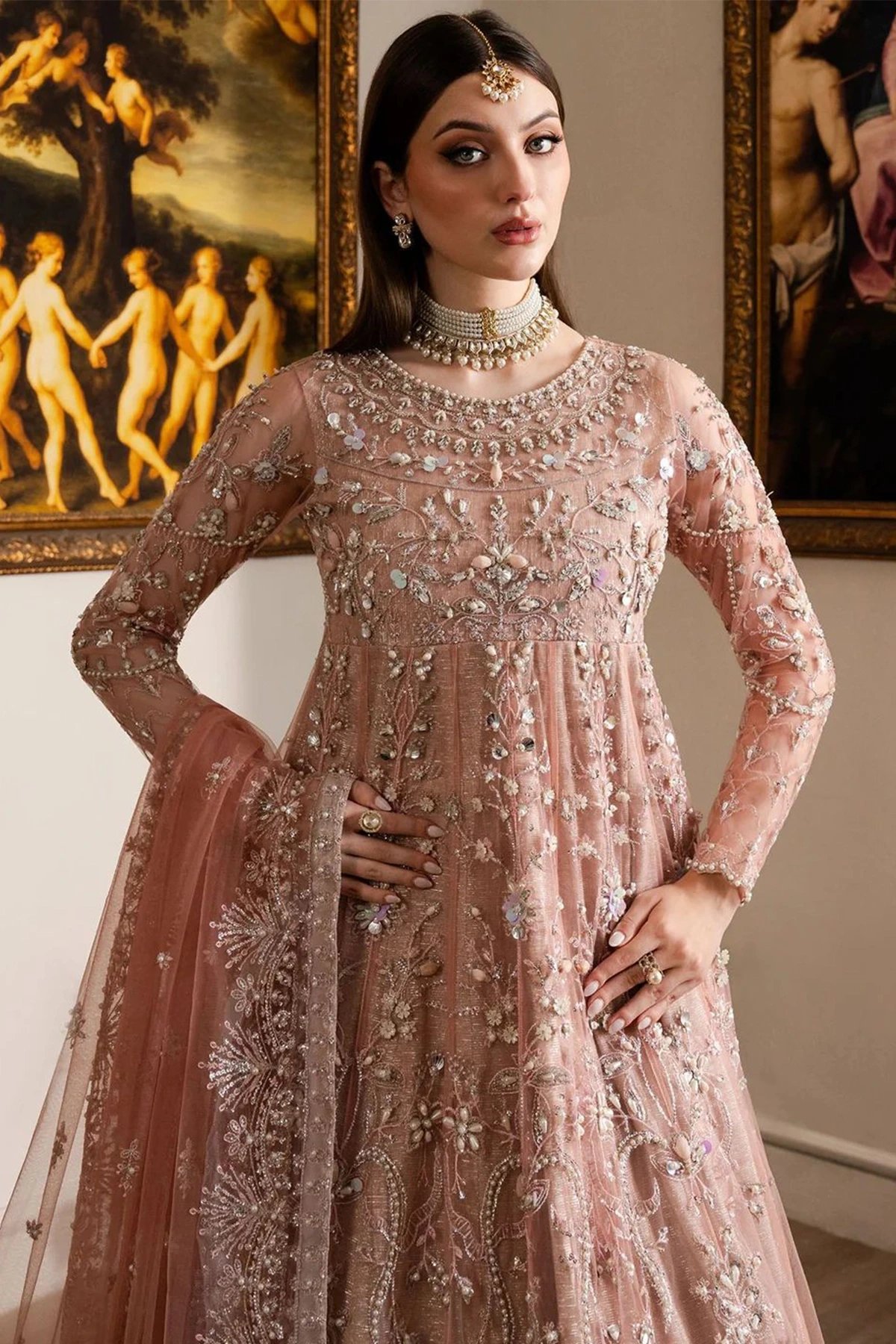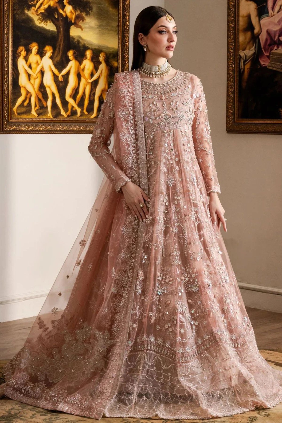 Lara premium collecion features a long net gown which ensemble luxury thread work embroidery and crafted for those who appreciate timeless south asian artistry. The outfit features intricate hand‑worked detailing across a sheer, flowing silhouette, creating a harmonious blend of tradition and modern elegance. Delicate floral and vine motifs shimmer with sequins, beads, and fine thread work, giving the garment a luminous, ethereal presence. Paired with crepe straight leg trousers and the look is finished with a net embroidered dupatta.