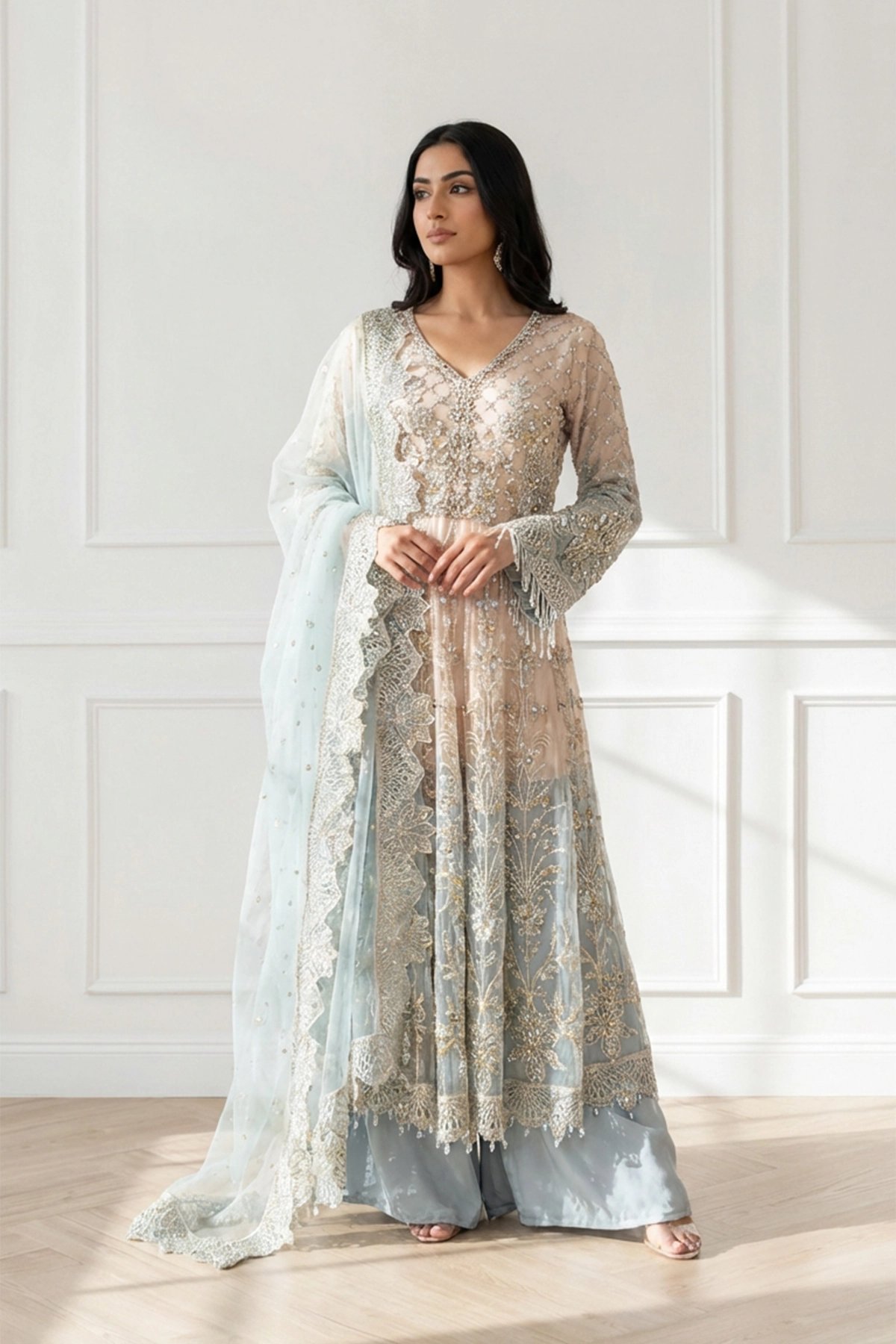 This pastel-toned embroidered ensemble brings together elegance and artistry in every detail. The V‑neck kameez features intricate hand‑worked embellishments, paired with wide‑leg trousers that create a graceful, flowing silhouette. A soft, scalloped dupatta completes the look with refined charm. Perfect for weddings, festive events, and formal occasions, this outfit blends traditional craftsmanship with a modern, sophisticated finish.