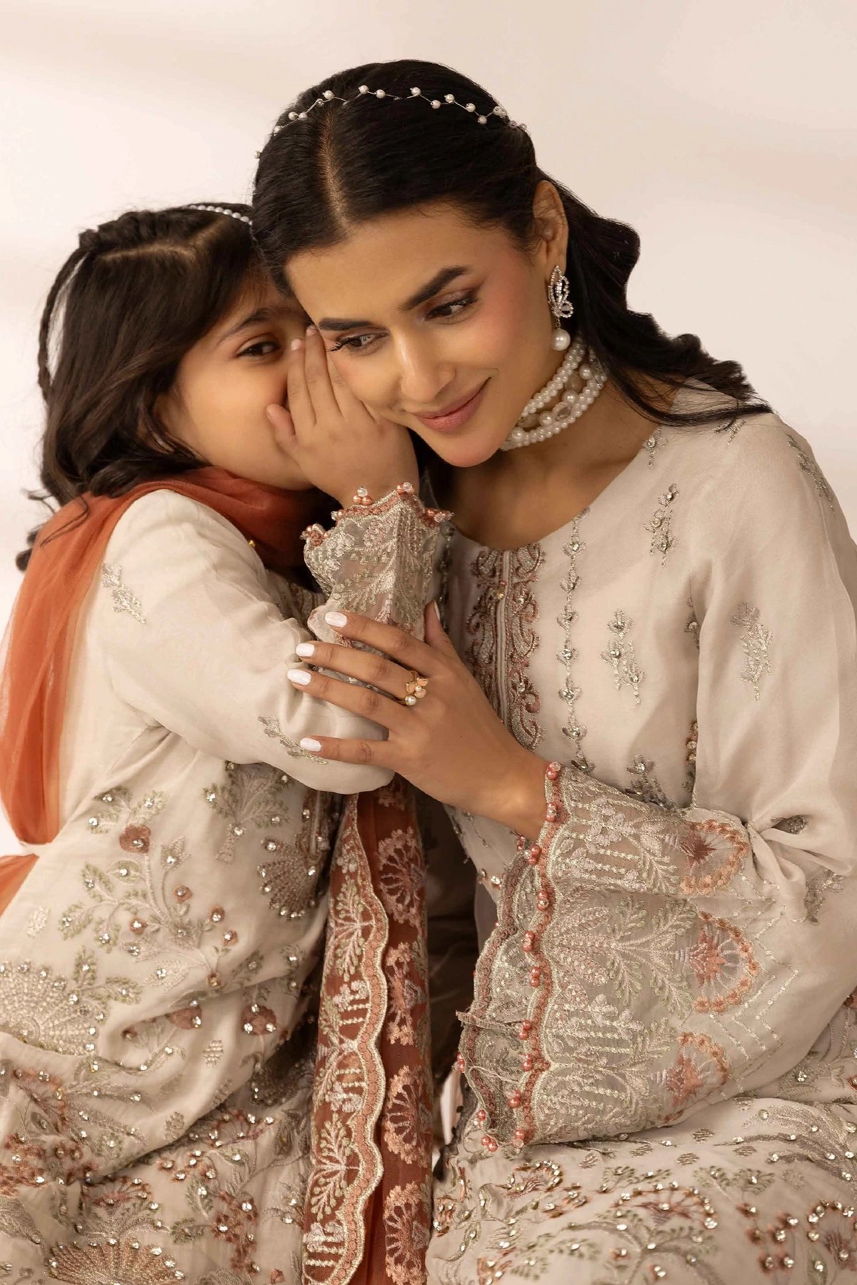 Lavish Eid edit 2026 kids collection features a straight shirt with luxury thread work embroidery throughout with bead embellishments on the front, finished with full length embroidered sleeves. Paired with straight leg crepe trousers. The look is finished with an embroidered organza dupatta. Perfect mother and daughter collection for this Eid.