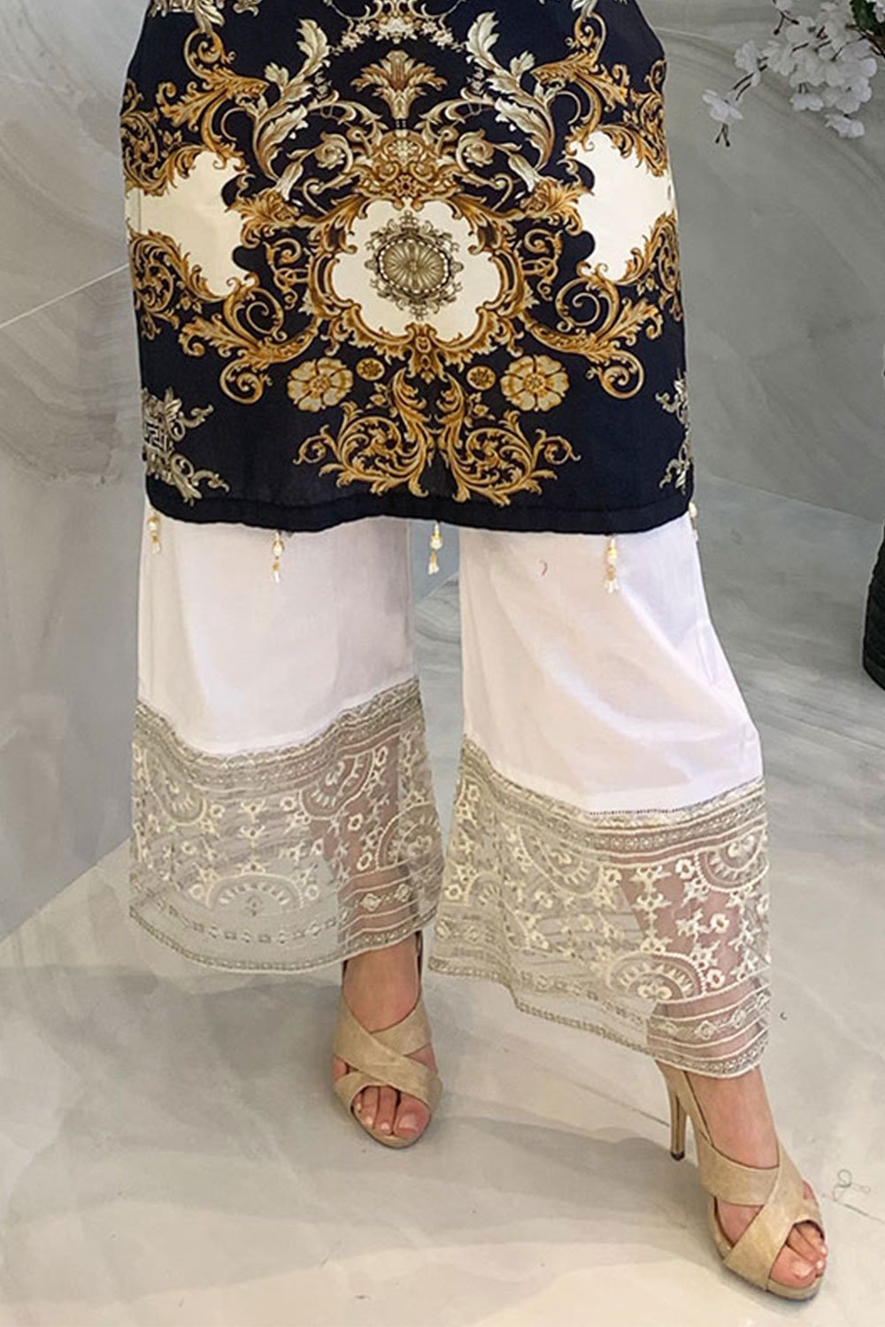 Casual lawn trousers with a lace embroidered border. Note: Design could vary between straight and wide leg.