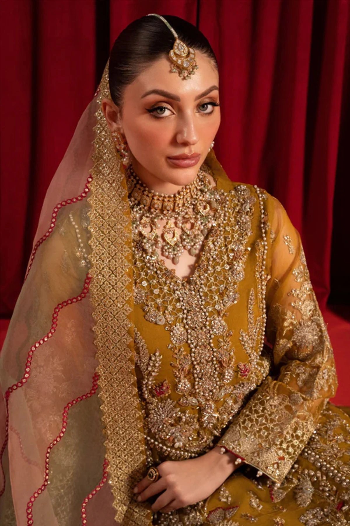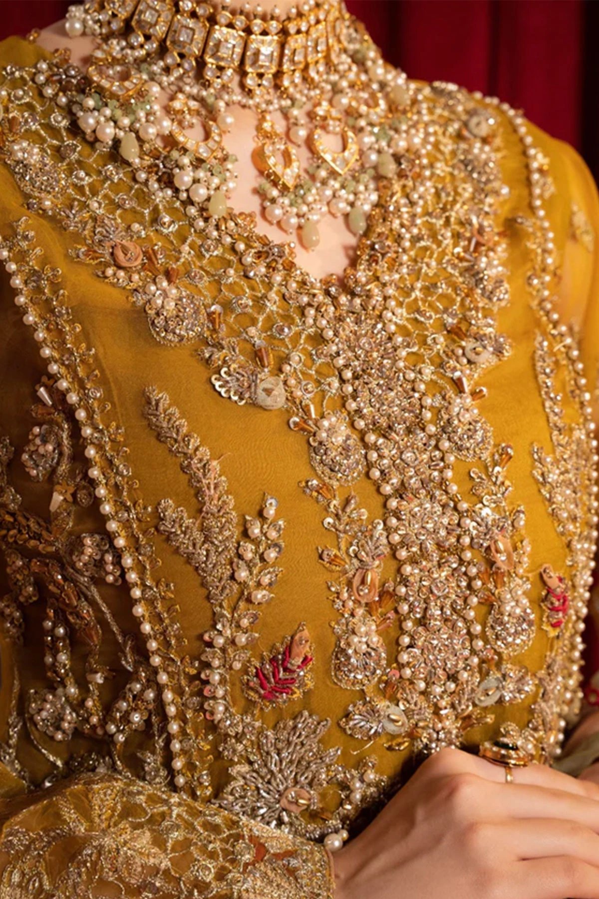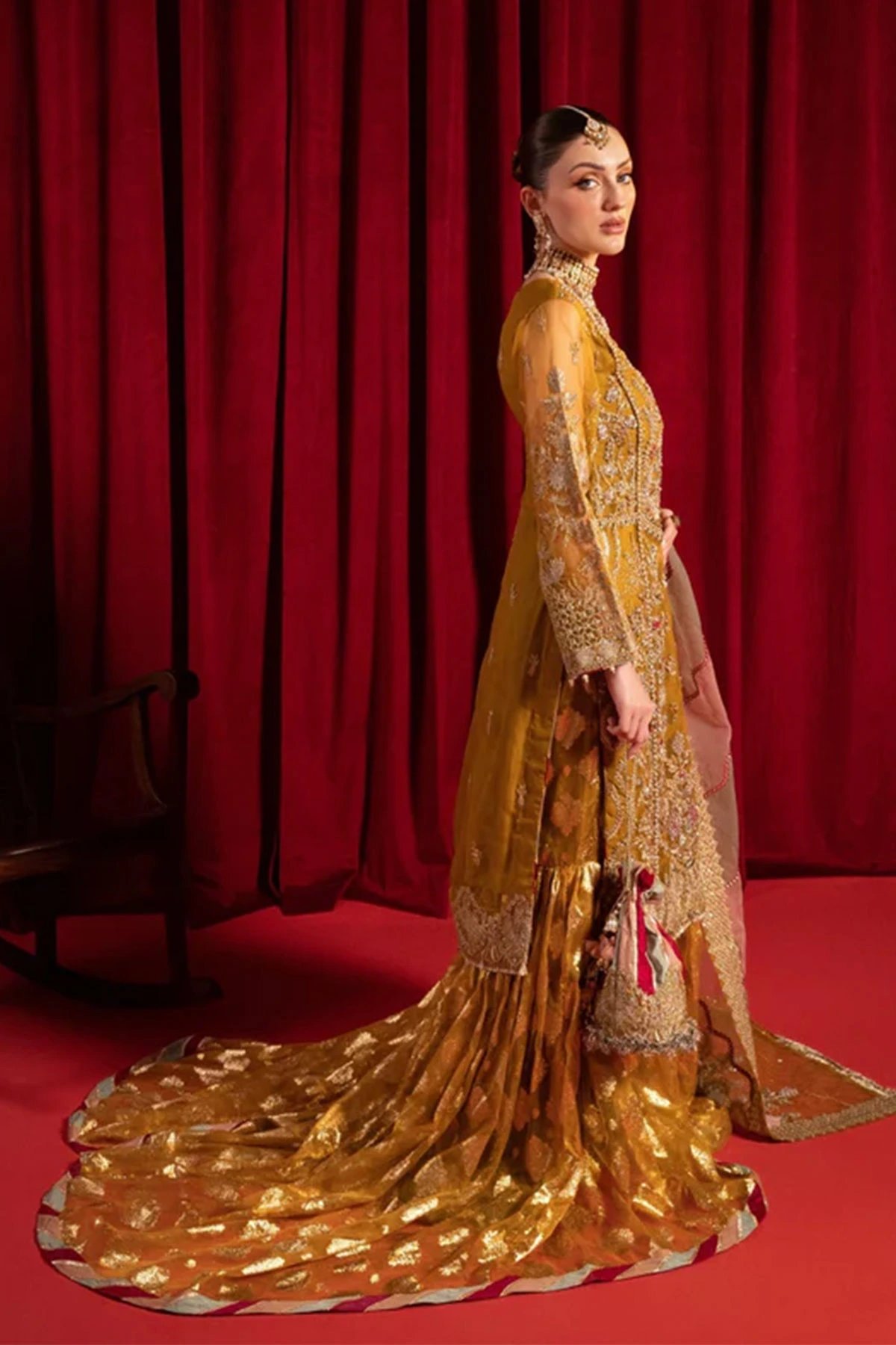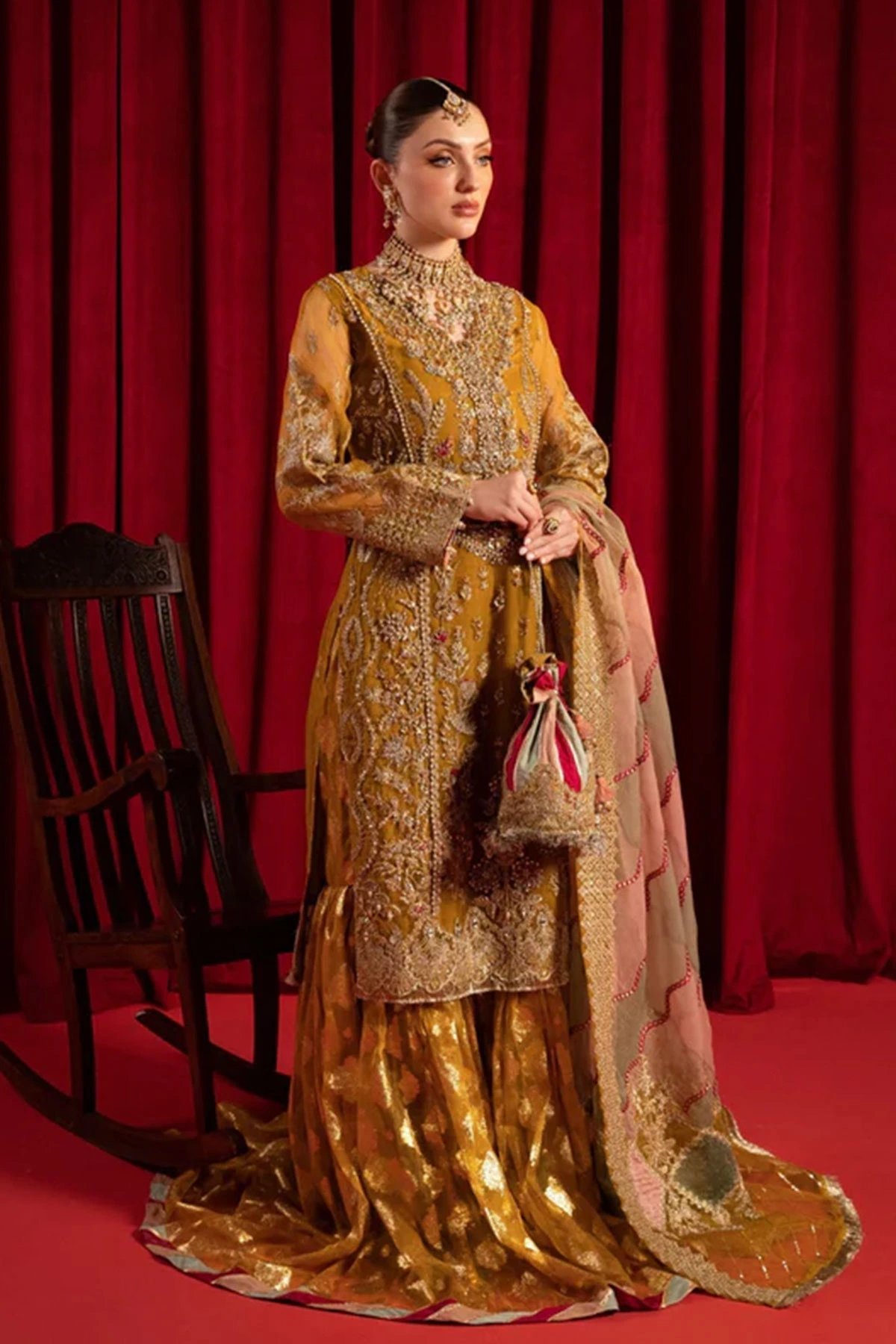 This beautiful 3 piece suit beholds the exquisite organza shirt, adorned with intricate handcrafted work and delicate pearls embellishments. Accompanying this masterpiece is a multi coloured stunning embroidered organza dupatta, embellished with shimmering sequins and delicate lace details. Let’s not forget the show-stopping organza farshi gharara, featuring a touch of lurex for that extra sparkle. To finish the look it comes with a sequin embroidered potli bag for that extra touch of elegance.