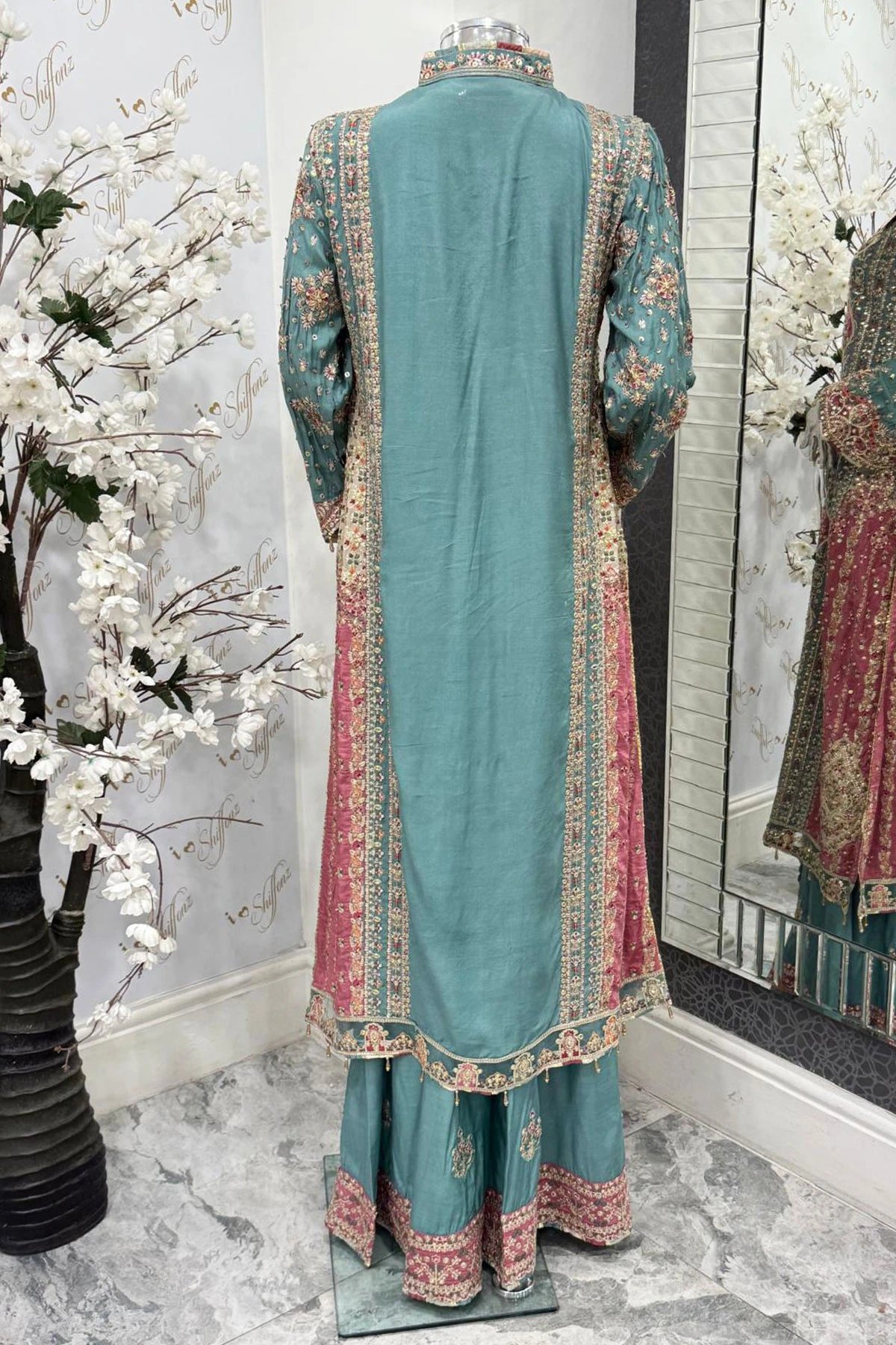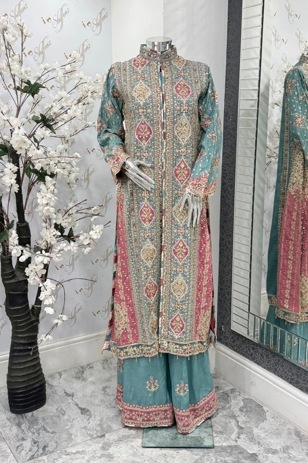 This beautiful 3 piece Qalamkaar inspired suit features a jacket style shirt with luxury thread work embroidery with sequence embellishments with full length embroidered sleeves along with a short length sleeves inner lining. Paired with an embroidered plazo trouser and the look is finished with an embroidered organza dupatta.