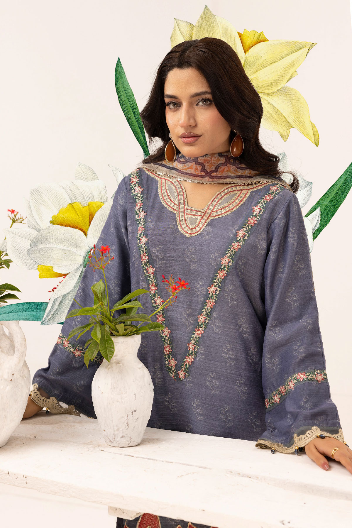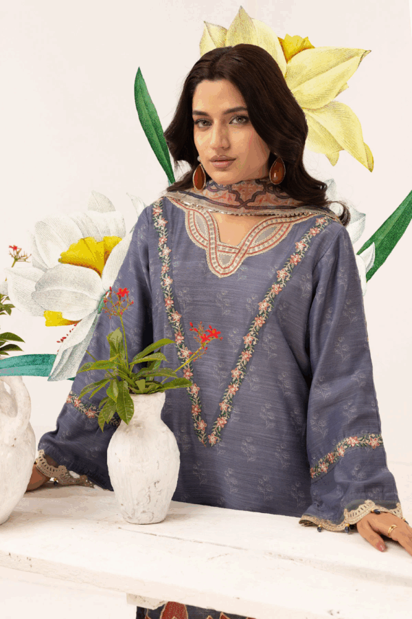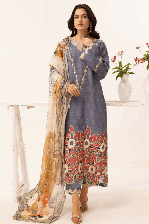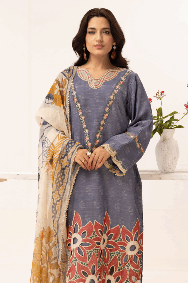 This beautiful 3 piece Libas e khas collection features a straight printed shirt with embroidered front on monar fabric, finished with a cut work embroidered border along with full length embroidered sleeves. Paired with straight leg trousers and the look is finished with a digital printed dupatta.