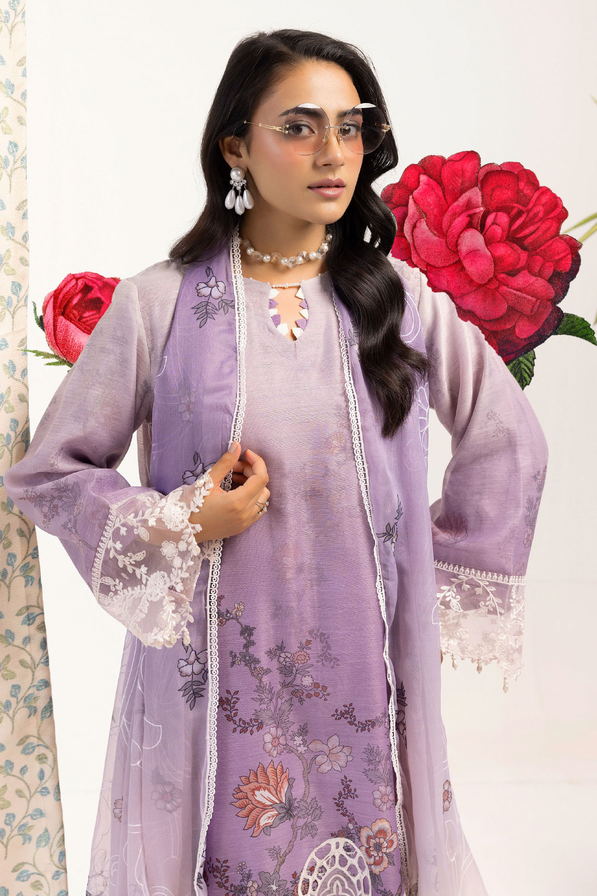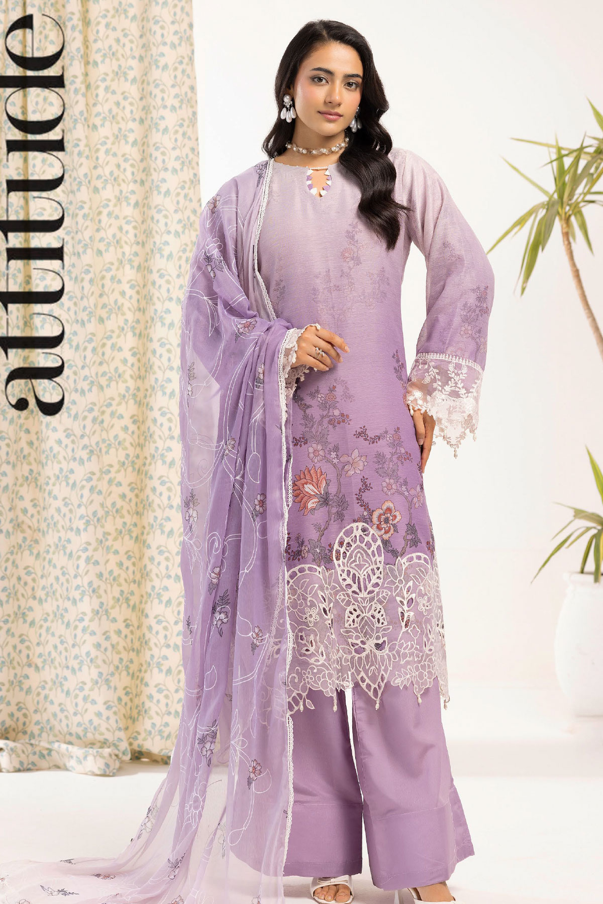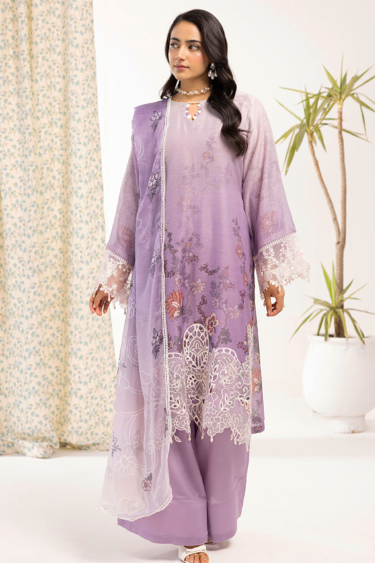 This beautiful 3 piece Libas e khas collection features a straight printed shirt with detailed keyhole neckline on monar fabric, finished with an organza lace embroidered border along with full length sleeves with embroidered cuffs. Paired with plain farshi shalwar and the look is finished with a digital printed dupatta.