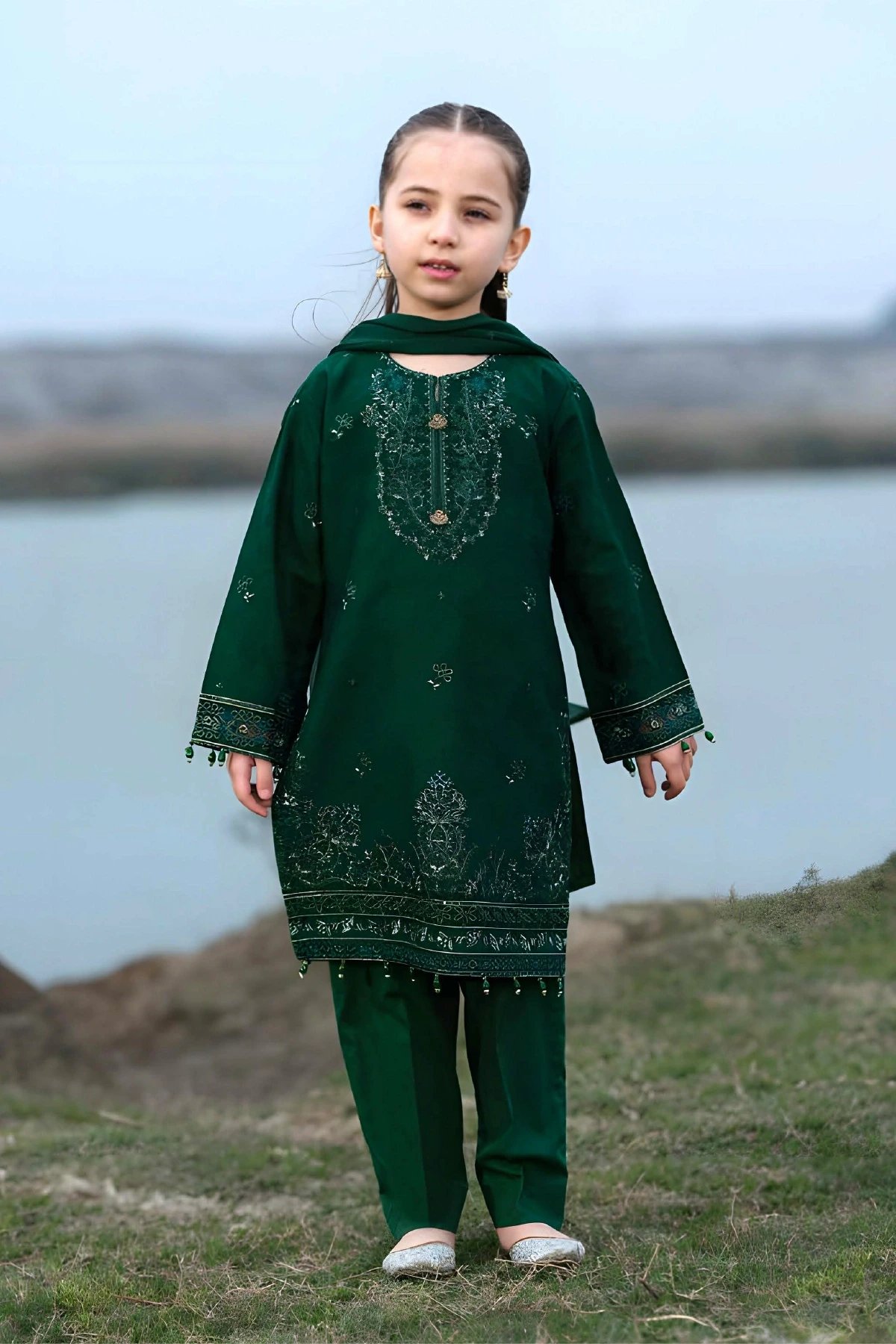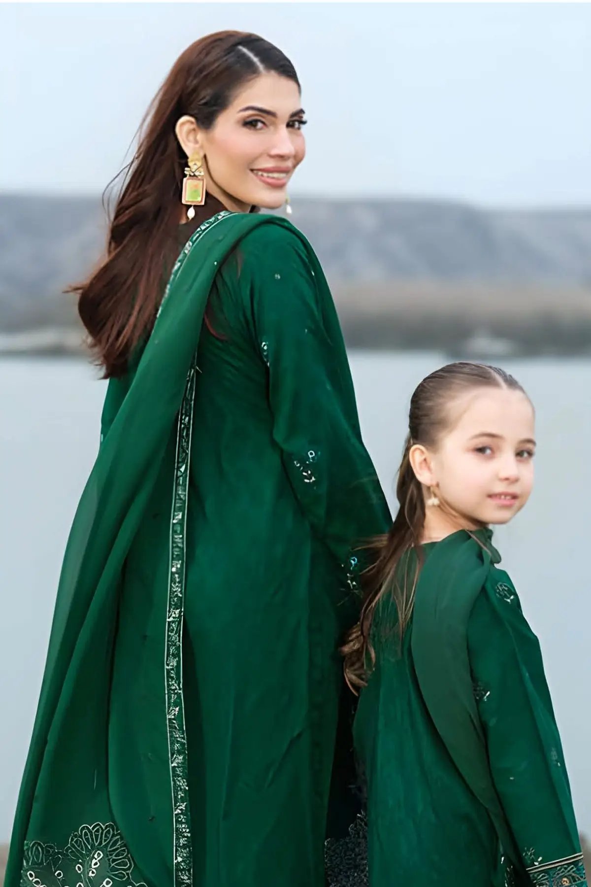 This beautiful 3 piece kids mother and daughter collection features a straight shirt with luxury thread work embroidered throughout with bead embellishments along the front neckline, finished with full length embroidered sleeves. Paired with straight leg trousers  and the look is finished with a chiffon dupatta. Perfect mother and daughter collection for this Eid.