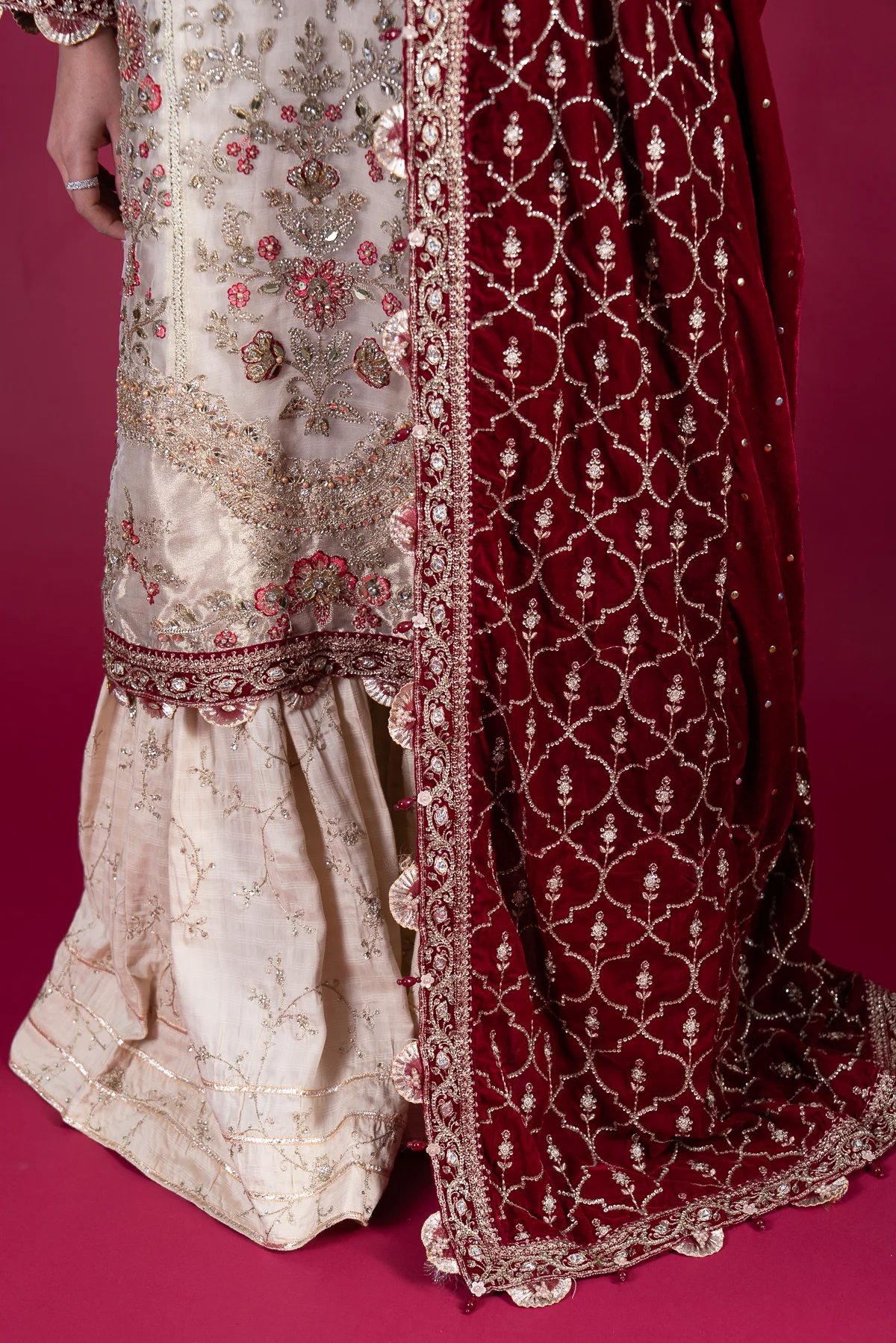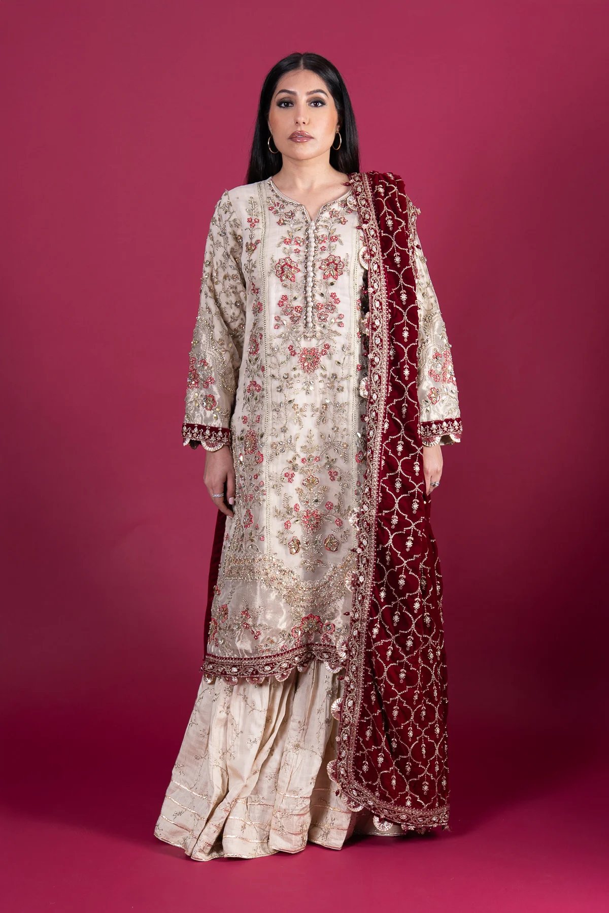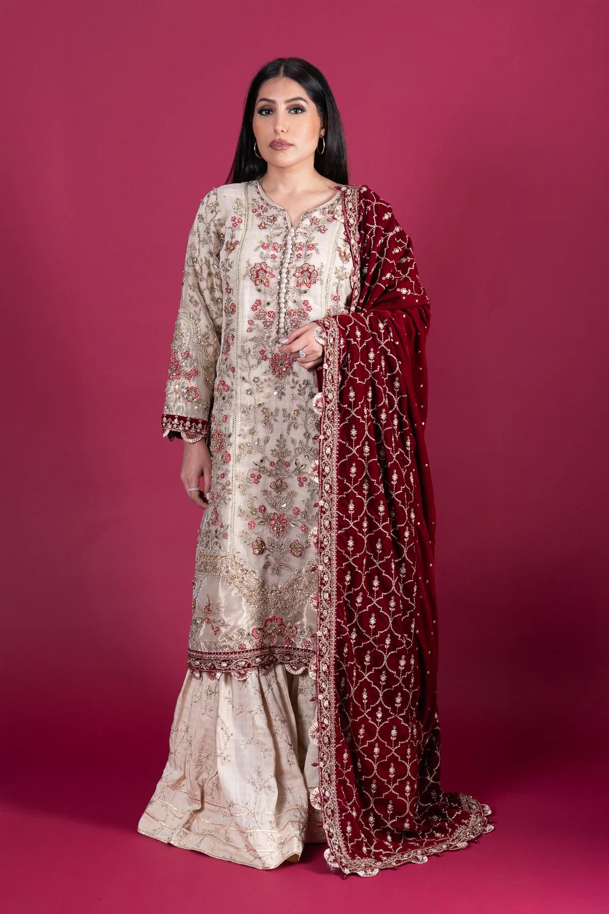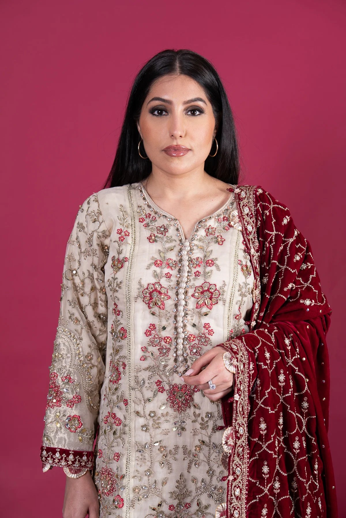 This beautiful 3-piece sharara suit is designed in elegant organza, featuring intricate threadwork embroidery and delicate sequins work throughout for a sophisticated look. The raw silk sharara is adorned with fine threadwork, adding a graceful charm. A rich velvet dupatta with detailed thread embroidery completes the ensemble, making it a perfect choice for festive occasions and formal gatherings.