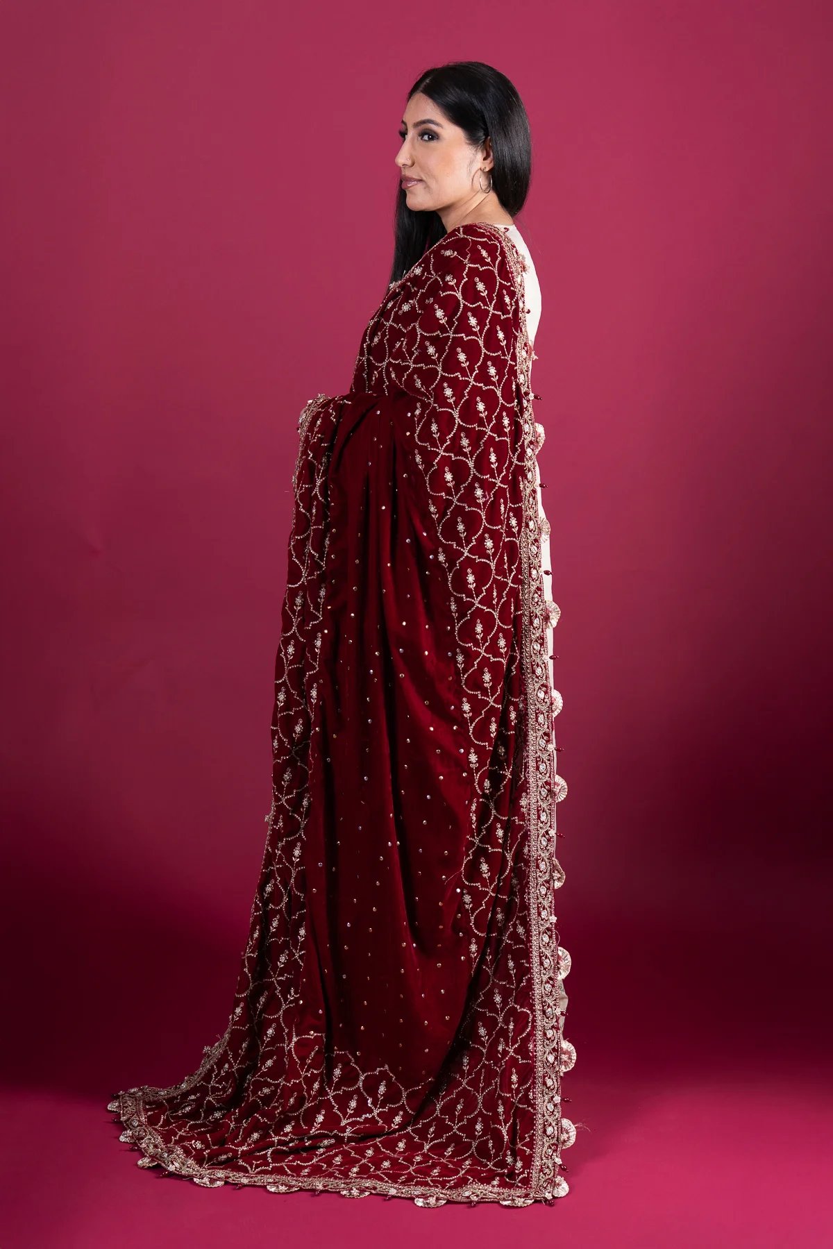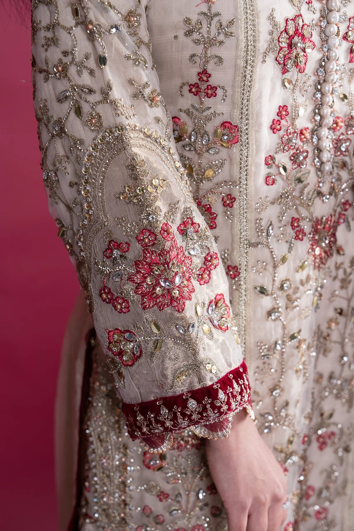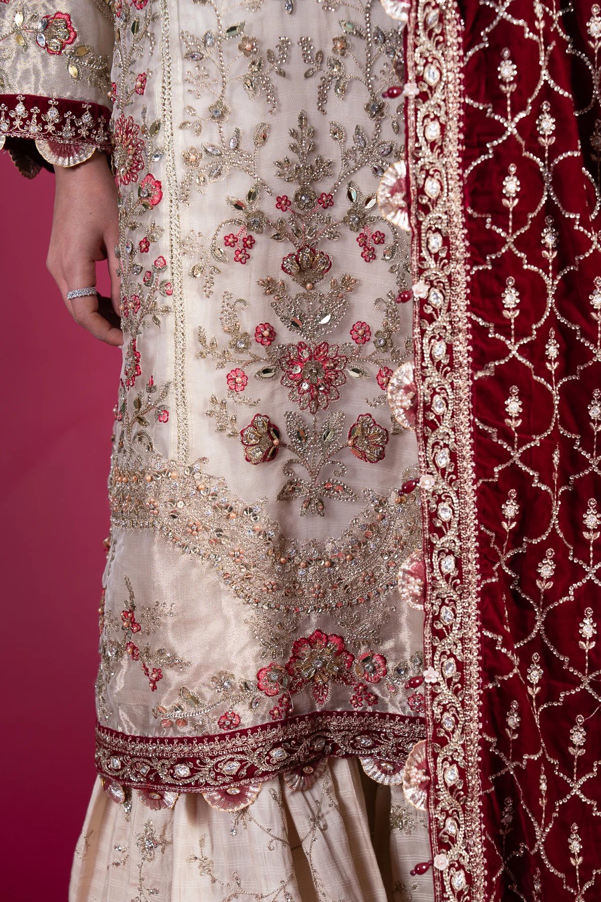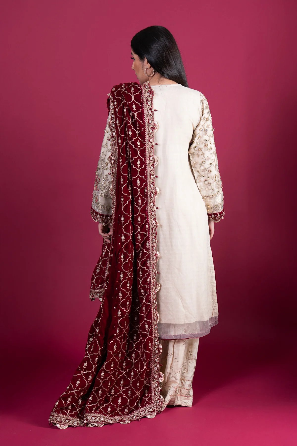 This beautiful 3-piece sharara suit is designed in elegant organza, featuring intricate threadwork embroidery and delicate sequins work throughout for a sophisticated look. The raw silk sharara is adorned with fine threadwork, adding a graceful charm. A rich velvet dupatta with detailed thread embroidery completes the ensemble, making it a perfect choice for festive occasions and formal gatherings.