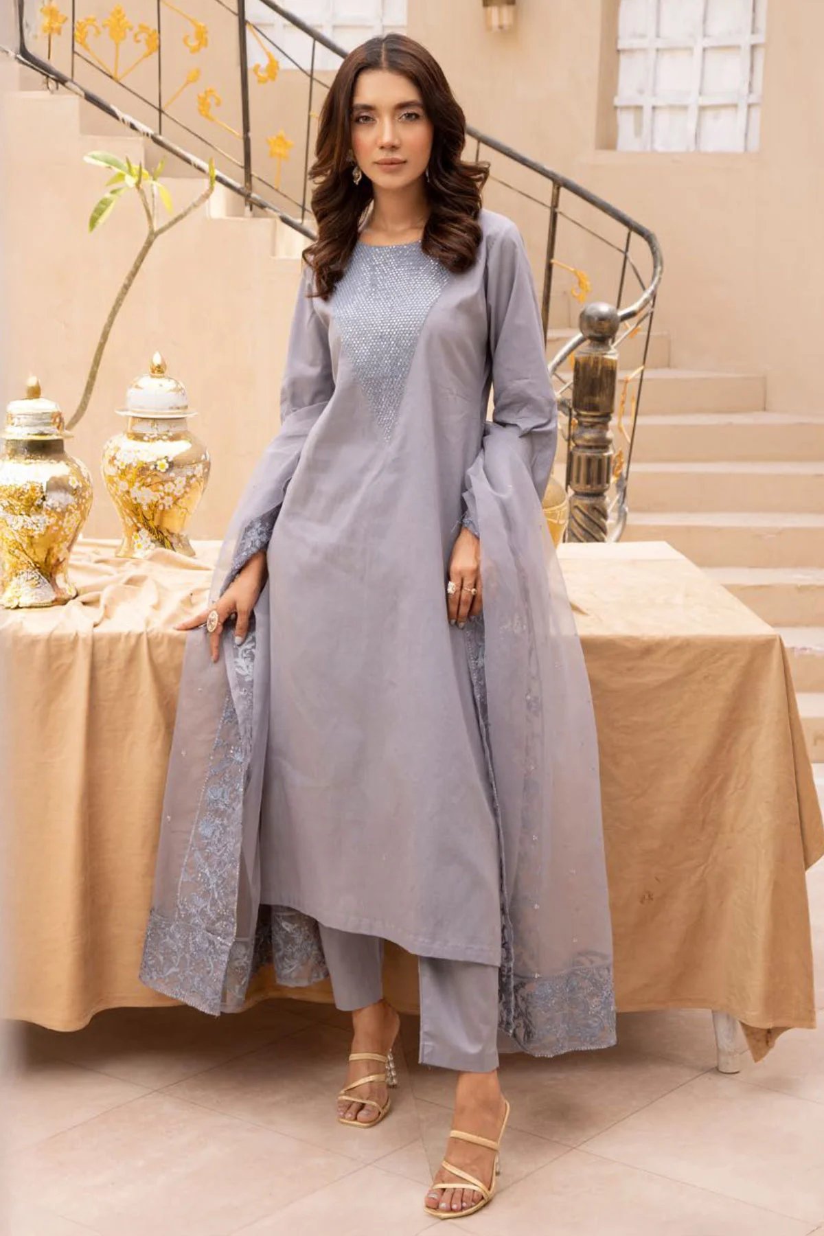 This beautiful 3-piece mother and daughter collection suit features a lawn top adorned with delicate embroidery along the neckline, creating a refined and sophisticated look. The matching lawn trousers offer a comfortable fit, while the tissue dupatta adds a touch of elegance, complementing the overall ensemble perfectly. This stylish and graceful outfit is ideal for any Eid celebration, blending traditional charm with modern comfort.