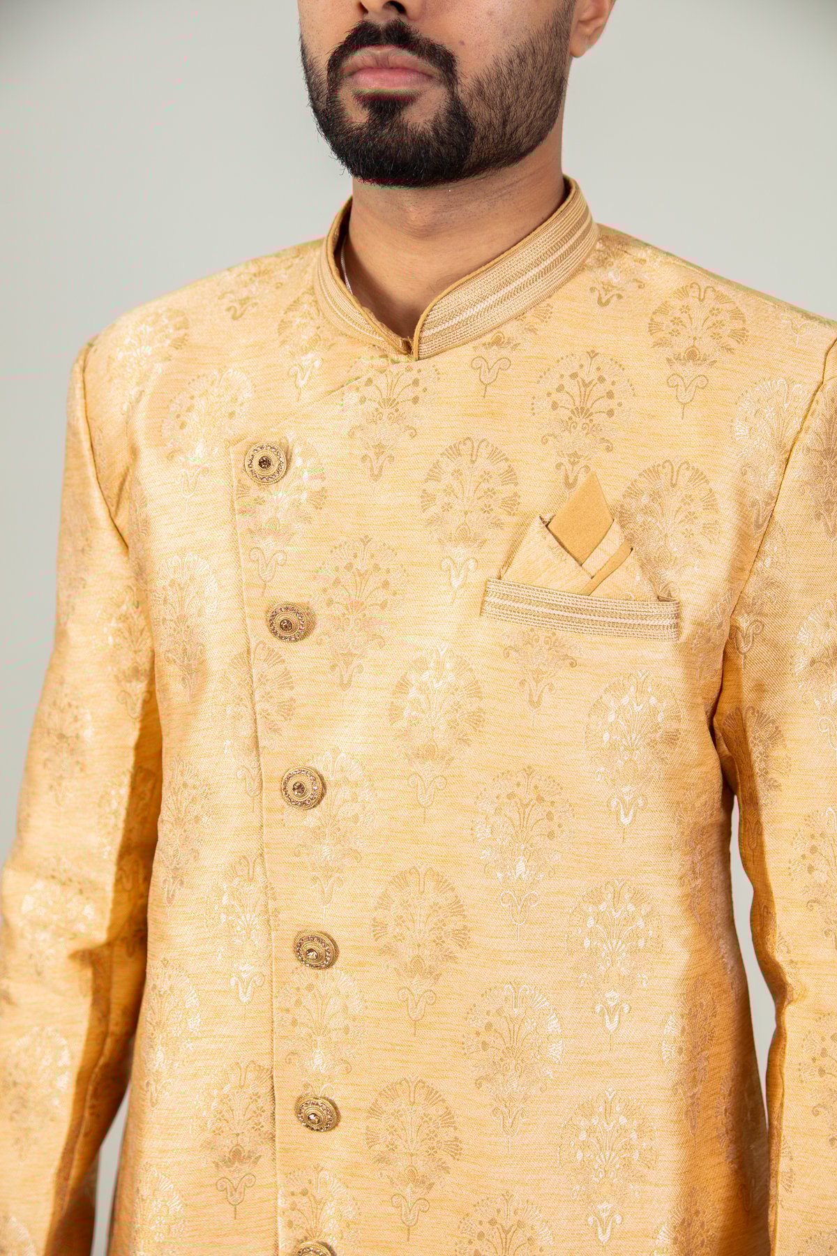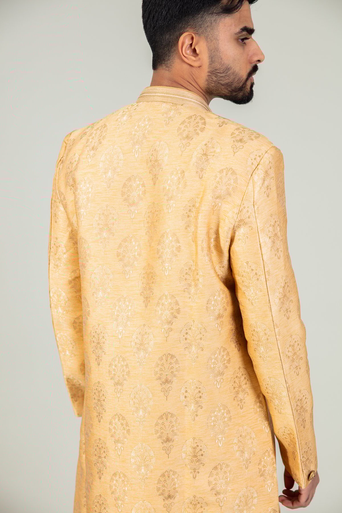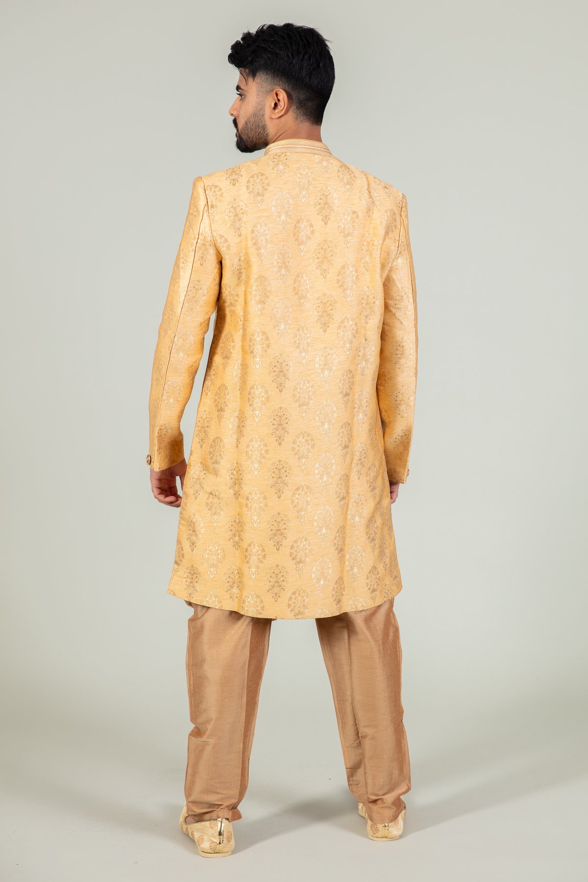This beautiful 2 piece mens’s brocade sherwani features a long printed coat with full length printed sleeves. It comes with a mandarin embroidered collar with patterned button embellishments along the middle. The look is finished with straight leg trousers.