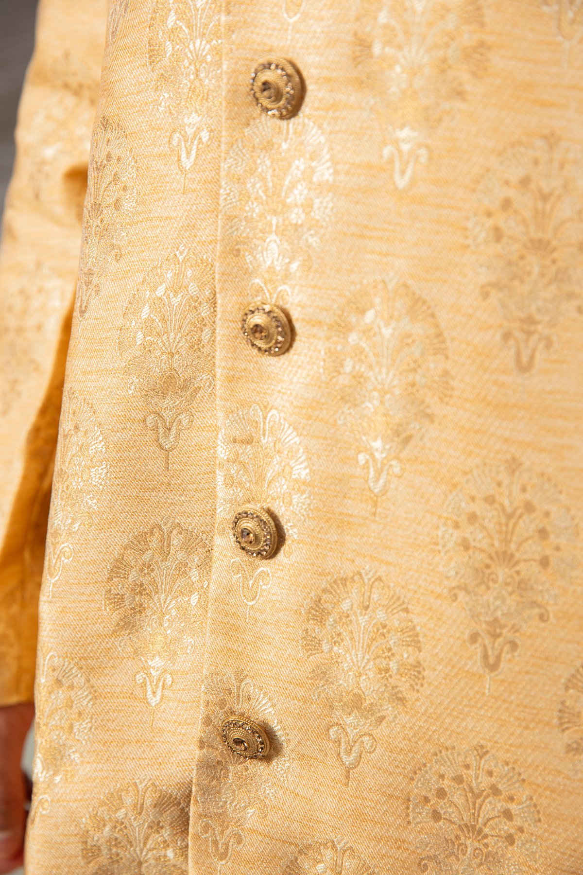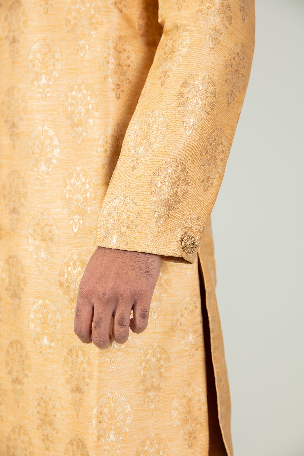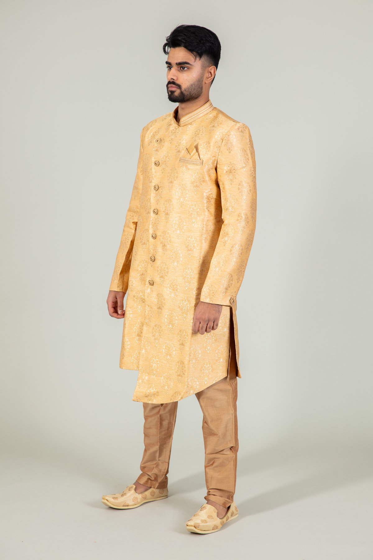 This beautiful 2 piece mens’s brocade sherwani features a long printed coat with full length printed sleeves. It comes with a mandarin embroidered collar with patterned button embellishments along the middle. The look is finished with straight leg trousers.