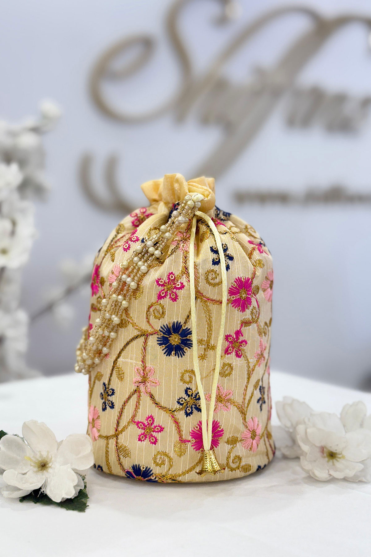Luxury potli bag is embellished with high-quality thread work and sequence embellishments throughout the front and back with beautiful colour combinations on a high quality raw silk fabric. Motif drawstrings along the wrist handle studded with pearls and beads. Potli bags are irreplaceable fashion accessories that women love to flaunt. very unique, these bags are perfect accessories for casual and party wear attires.