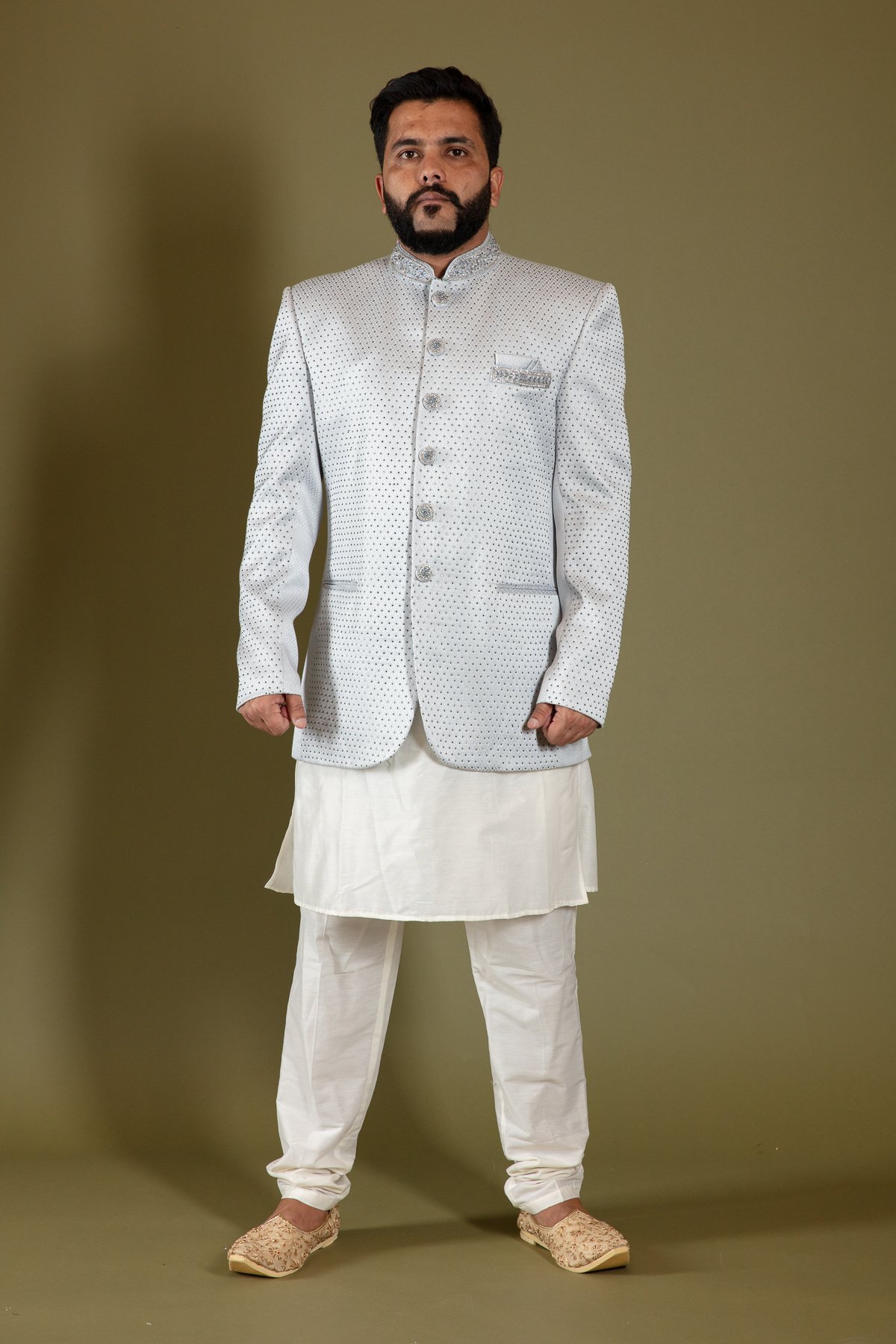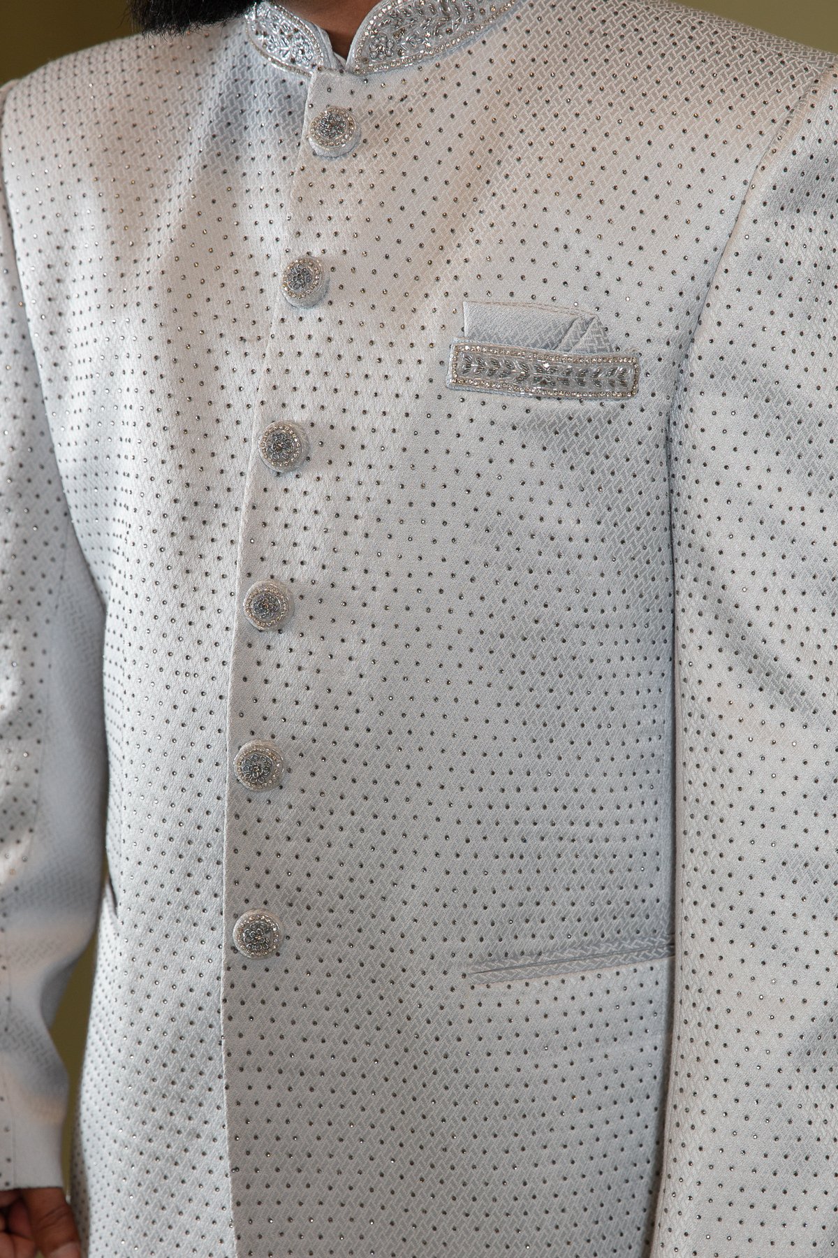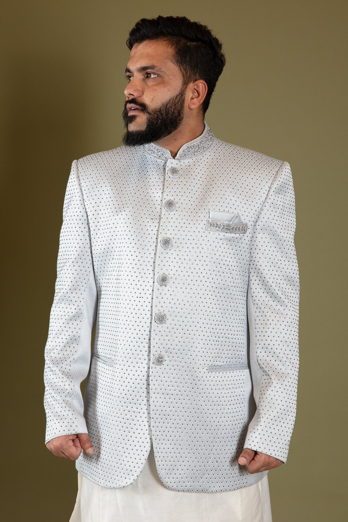 This beautiful men’s brocade coat sherwani features polka dot embroidery throughout with button embellishments along the middle, finished with a luxury beaded embroidered collar.