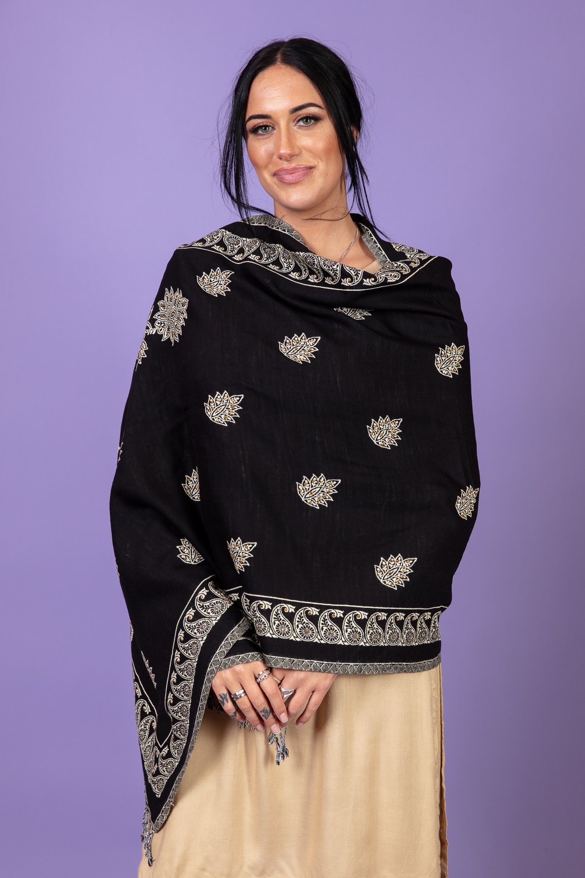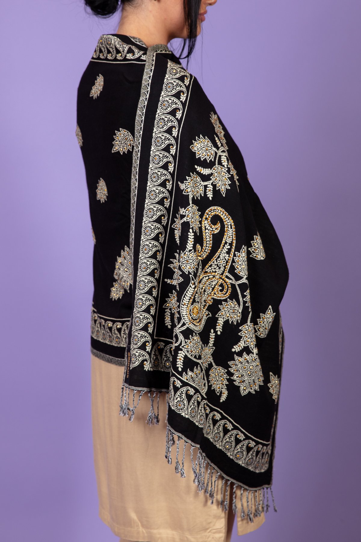 This beautiful marina shawl features floral and sequence design in the middle along with patterned design down the borders, finished with threads based tassels covering both sides of borders. Perfect for everyday wear.