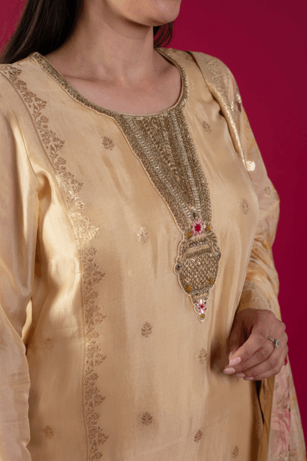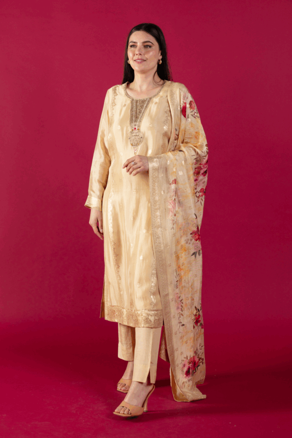 This beautiful 3 piece suit features a straight banarsi printed shirt with luxury embroidered front, finished with full length printed sleeves. Paired with straight leg silk trousers and the look is finished with a luxury printed banarsi dupatta.