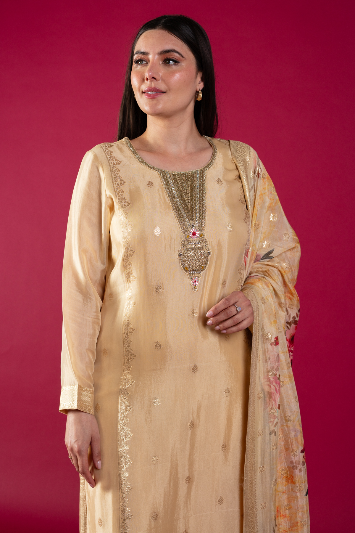 This beautiful 3 piece suit features a straight banarsi printed shirt with luxury embroidered front, finished with full length printed sleeves. Paired with straight leg silk trousers and the look is finished with a luxury printed banarsi dupatta.