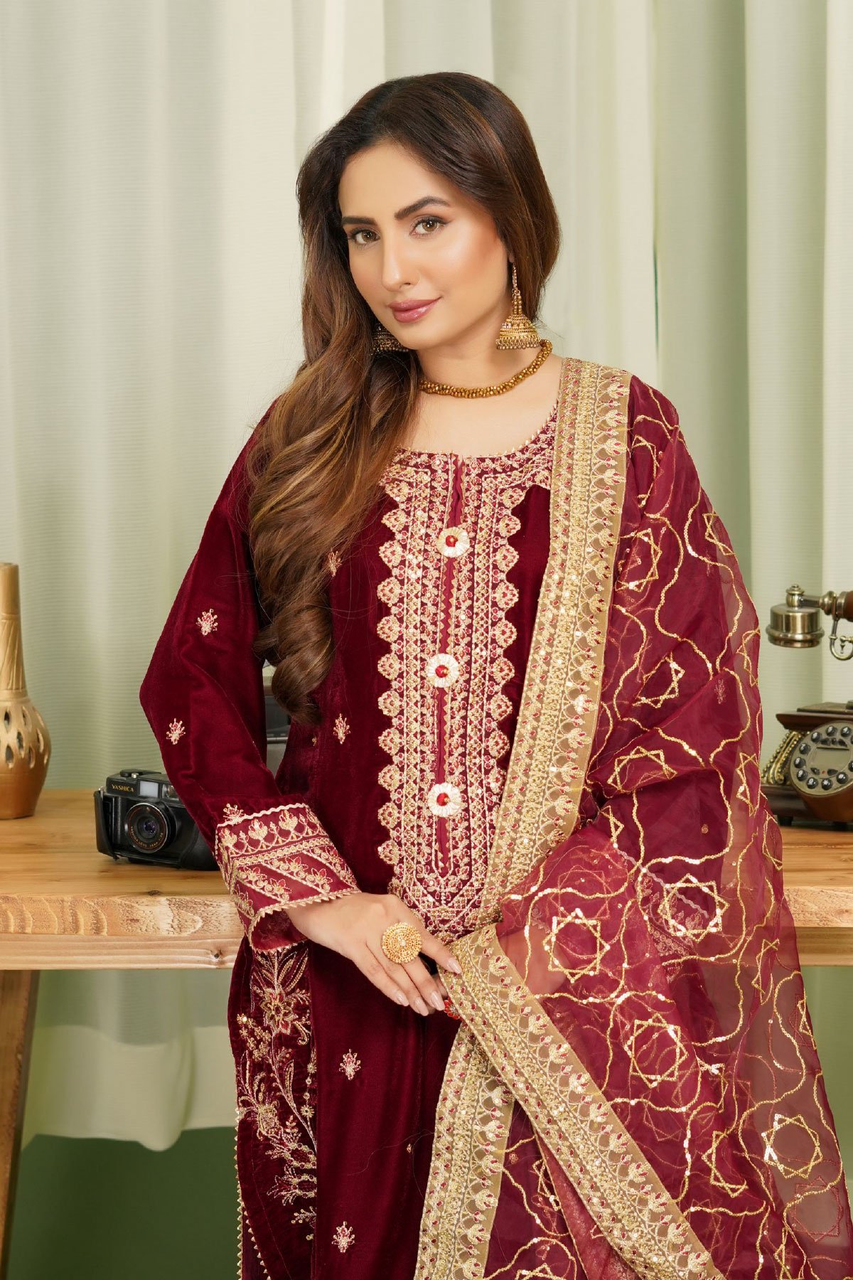 This beautiful makhmali velvet collection ensembles a straight shirt with luxury thread work embroidery throughout with bead embellished front, finished with full length embroidered sleeves. Paired with velvet trousers and the look is finished with an embroidered organza dupatta.