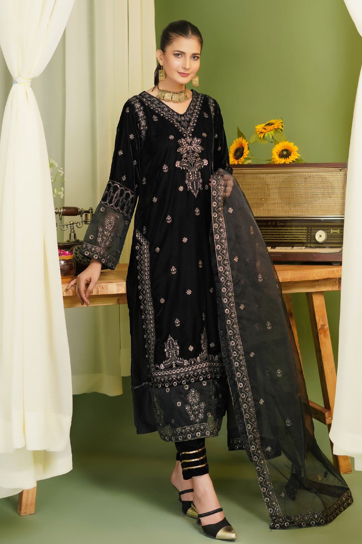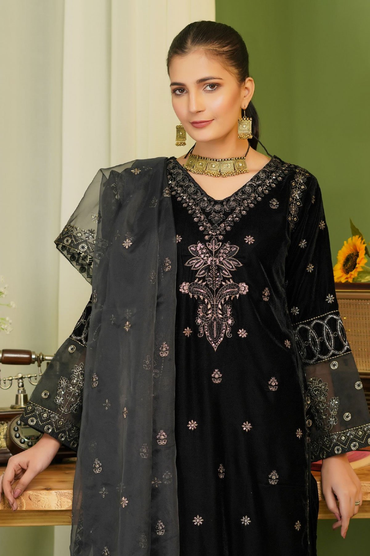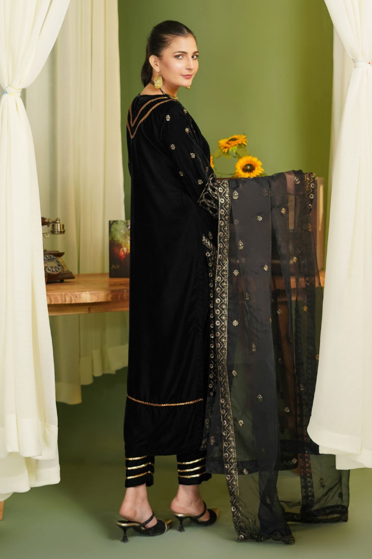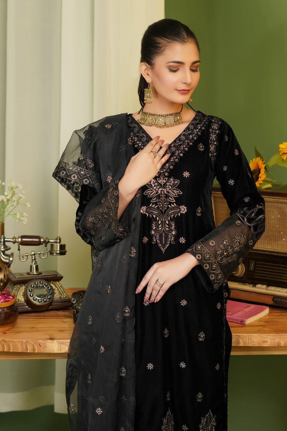 This beautiful makhmali velvet collection ensembles a straight shirt with luxury thread work embroidery throughout, finished with full length embroidered sleeves. Paired with velvet straight leg trousers and the look is finished with an embroidered organza dupatta.
