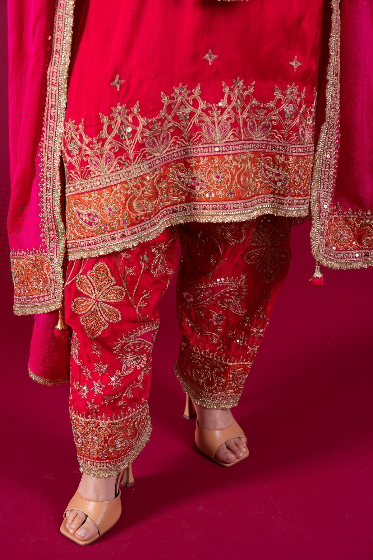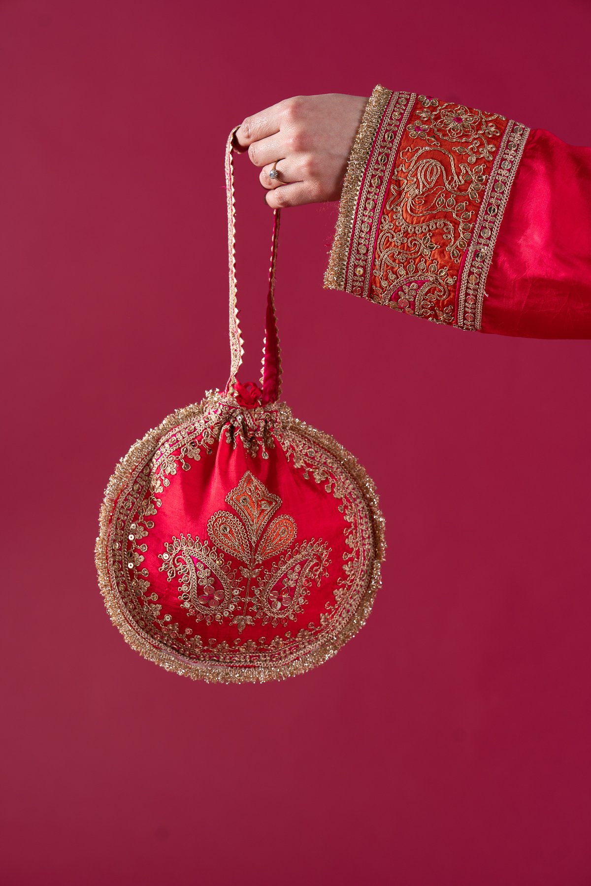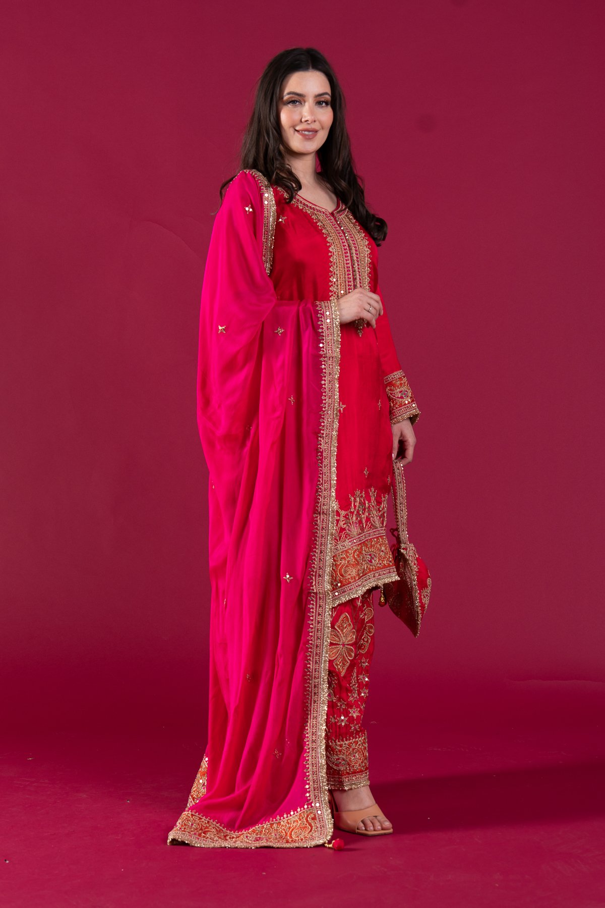 This beautiful 3 piece suit features a straight shirt with luxury thread and dori work embroidery with embellished sequence work throughout the front, it comes with full length sleeves with embroidered cuffs. Paired with a luxury shamoz silk embroidered shalwar and a chiffon luxury embroidered dupatta. The look is finished with an embroidered potli bag to enhance the suit.