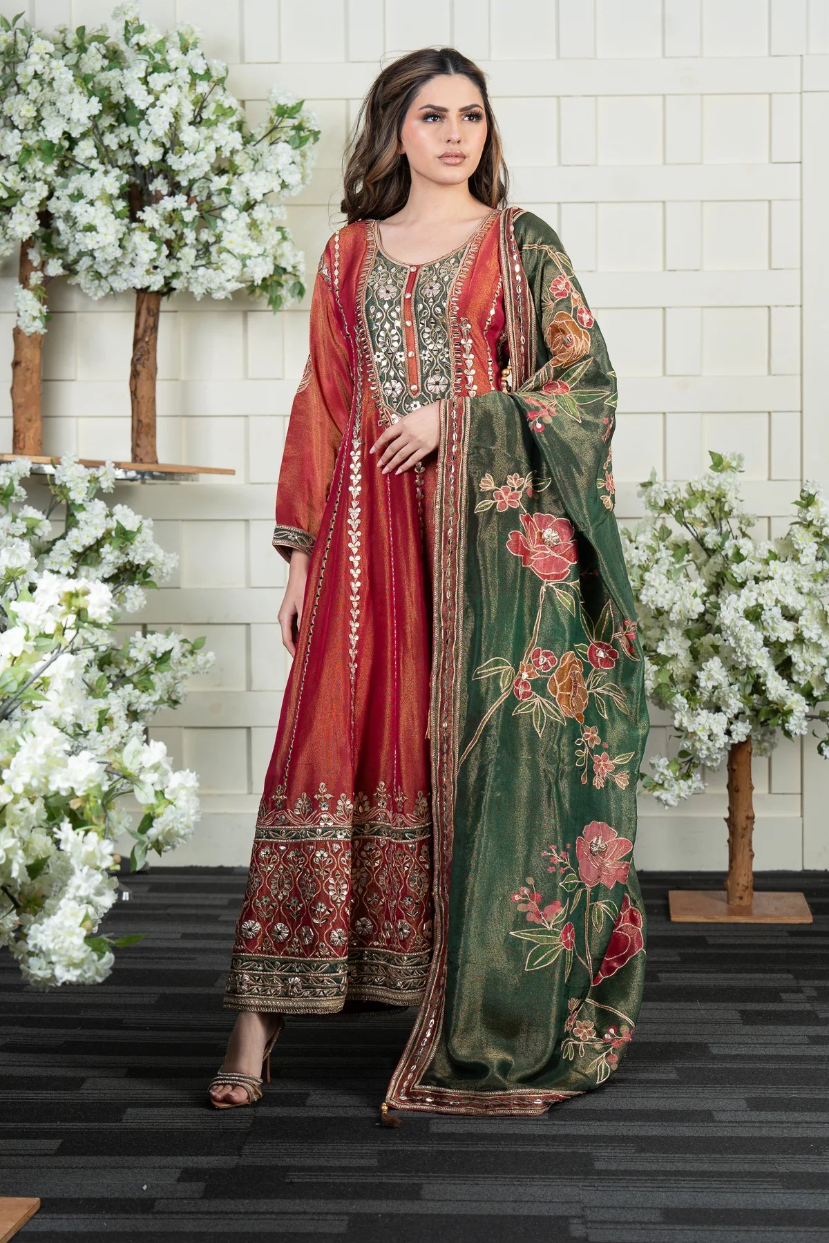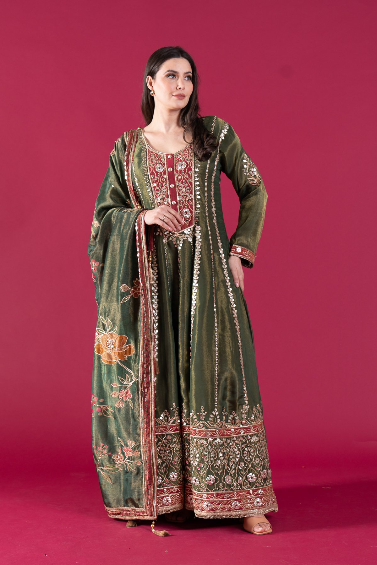 This beautiful 3 piece suit features a long maxi on the pure shimmer overlay with luxury gotta work embroidery along with pressed mirror embellishments within the patterns. Button embellishments along the middle front, finished with full length embroidered sleeves. The look is finished with a luxury embroidered shimmer dupatta. Trousers are not included. Full length of the gown is 54 inches.