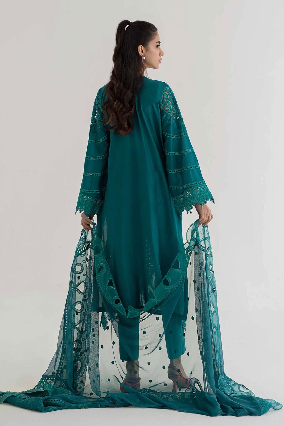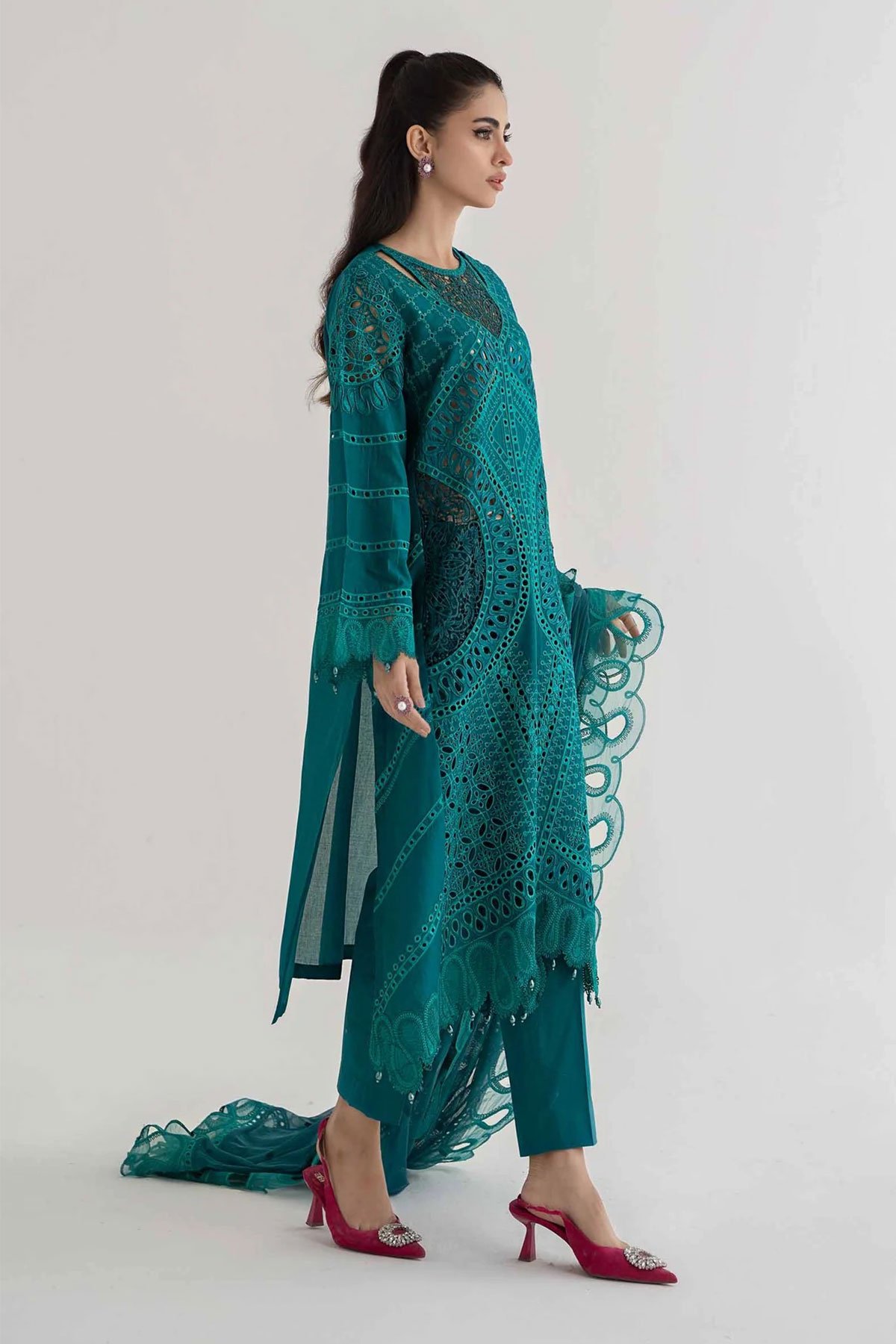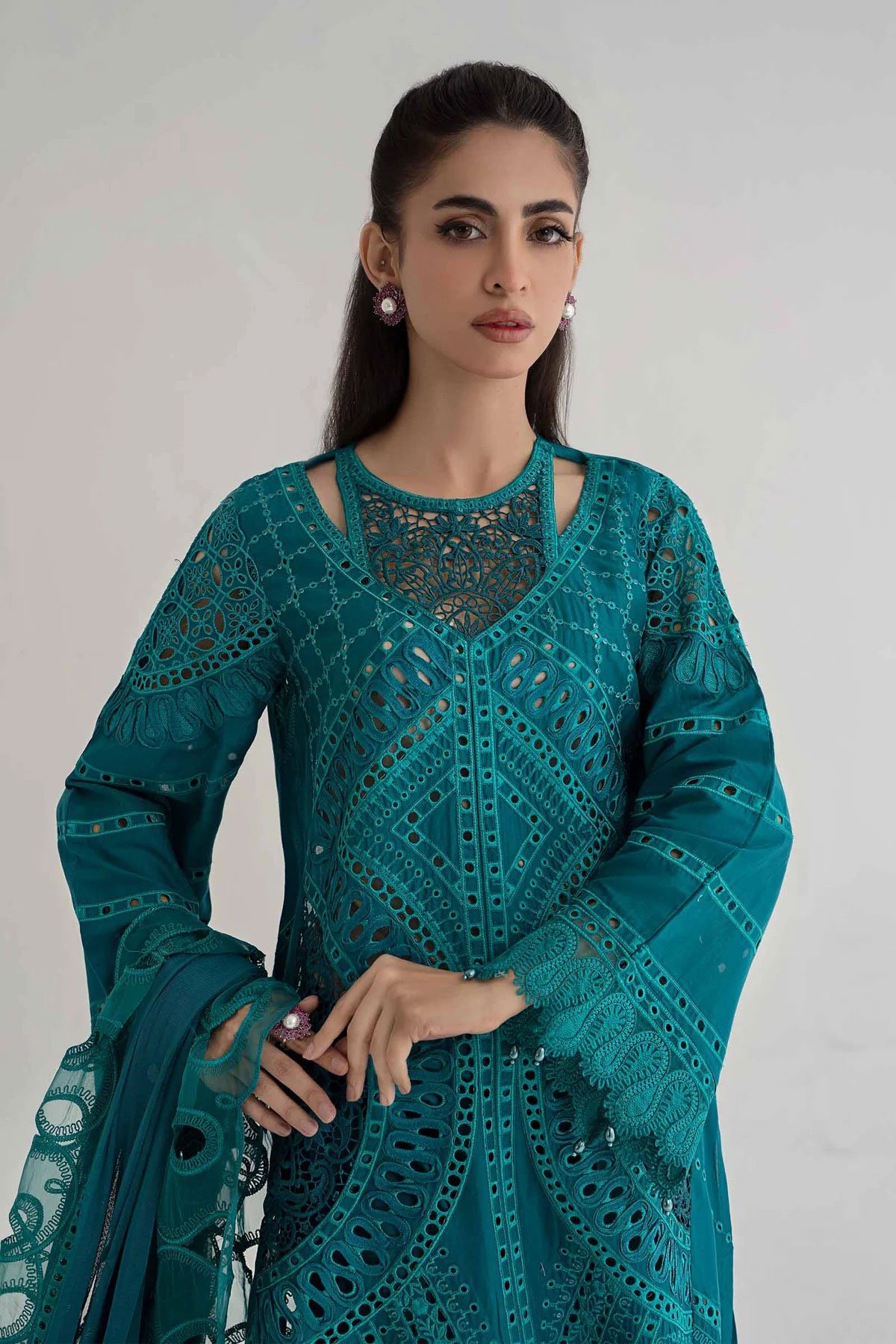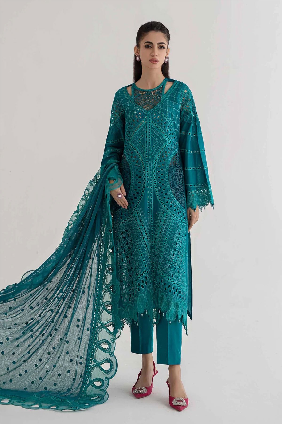 This beautiful 3 piece Maria b inspired suit features a straight chikankari cut work embroidered shirt with full length sleeves. It comes with straight leg trousers and the look is finished with a soft net dupatta. Note: The picture shown is a catalogue picture for design reference only. Embroidery, stitching and lace embellishment would vary.