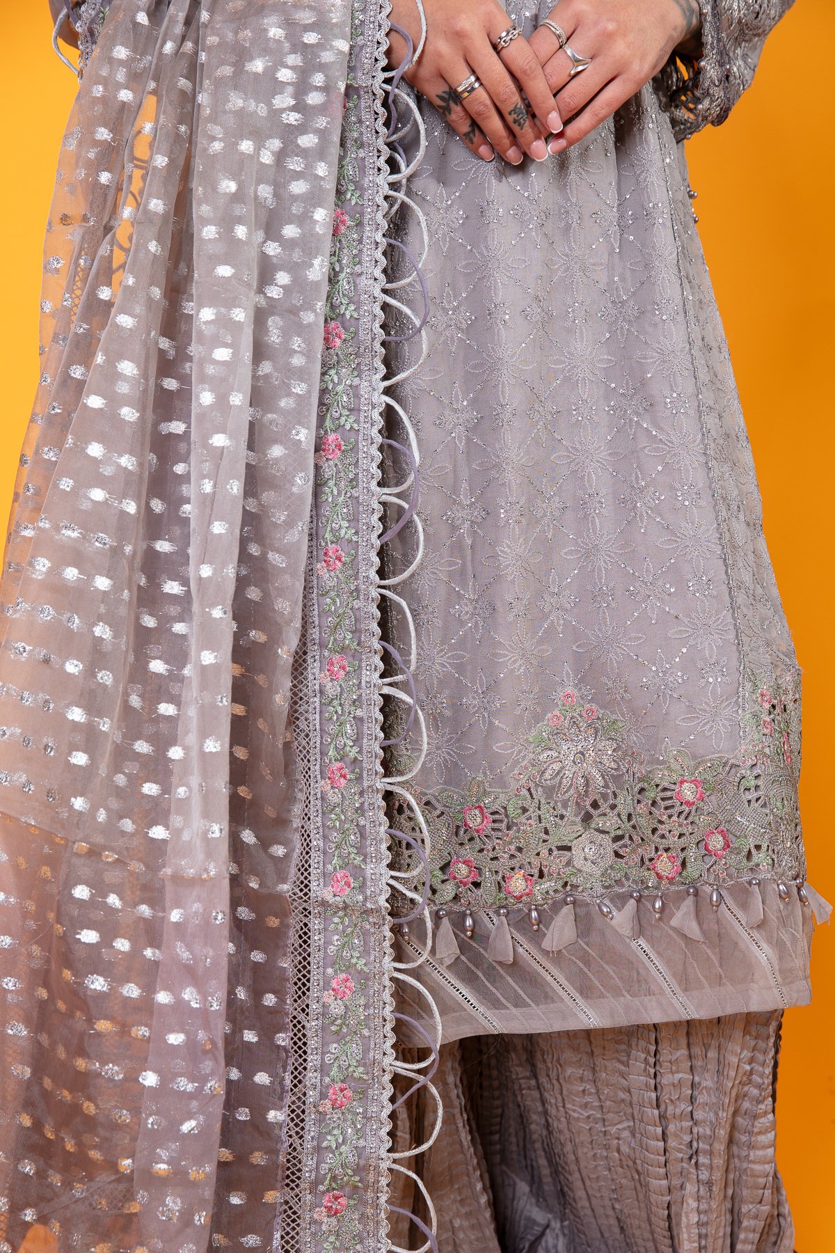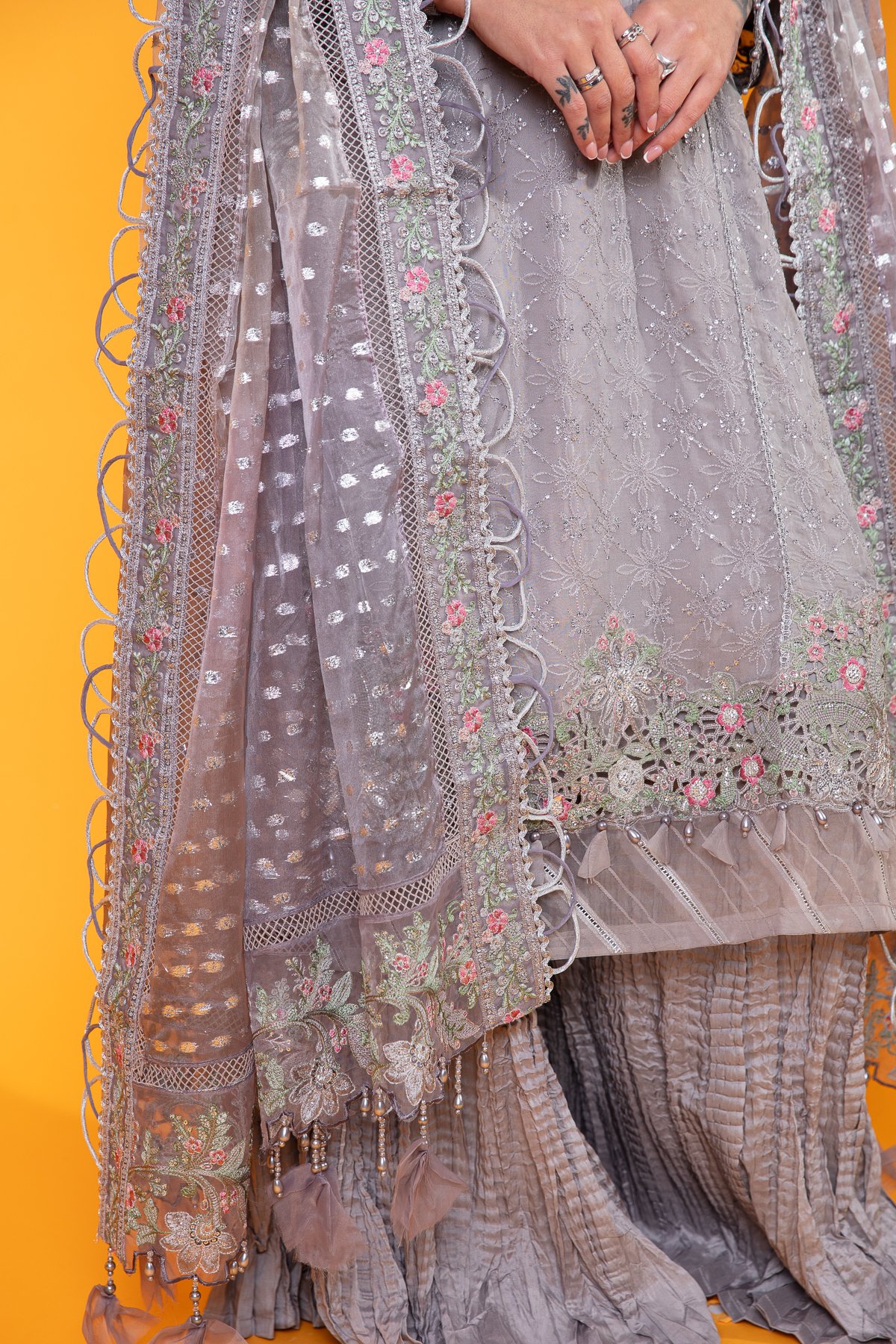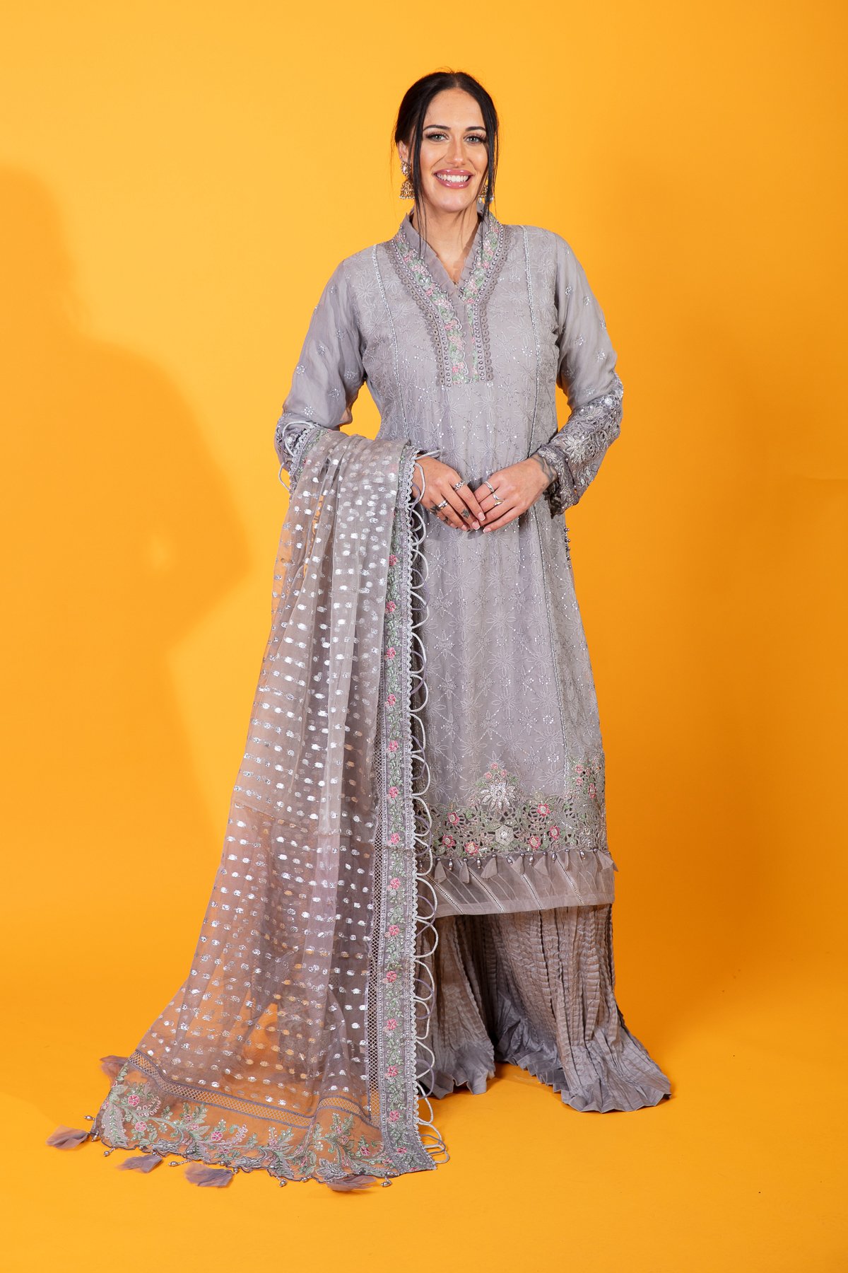 This beautiful 3 piece Maria b inspired suit features a straight long length shirt with thread work embroidery throughout the front, finished with an organza border with fabric dangling baubles. It comes with full length embroidered sleeves. The look is finished with crushed plazo trousers and an embroidered organza dupatta.