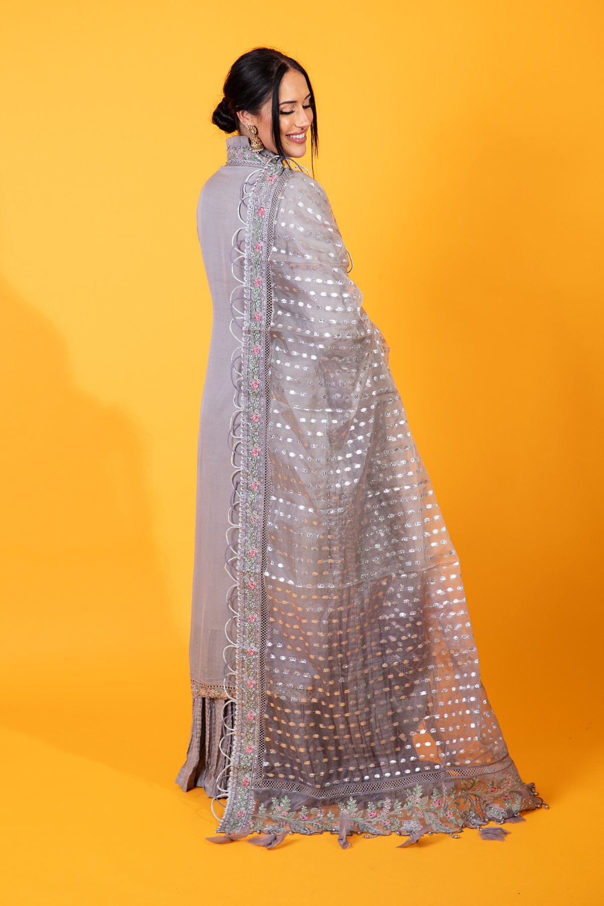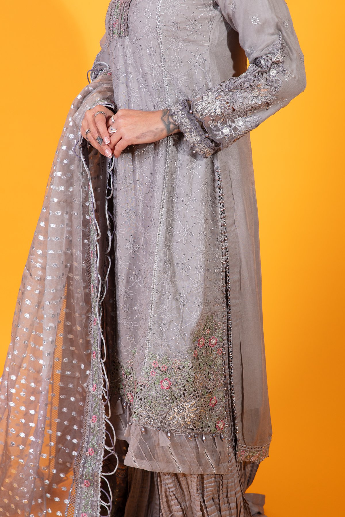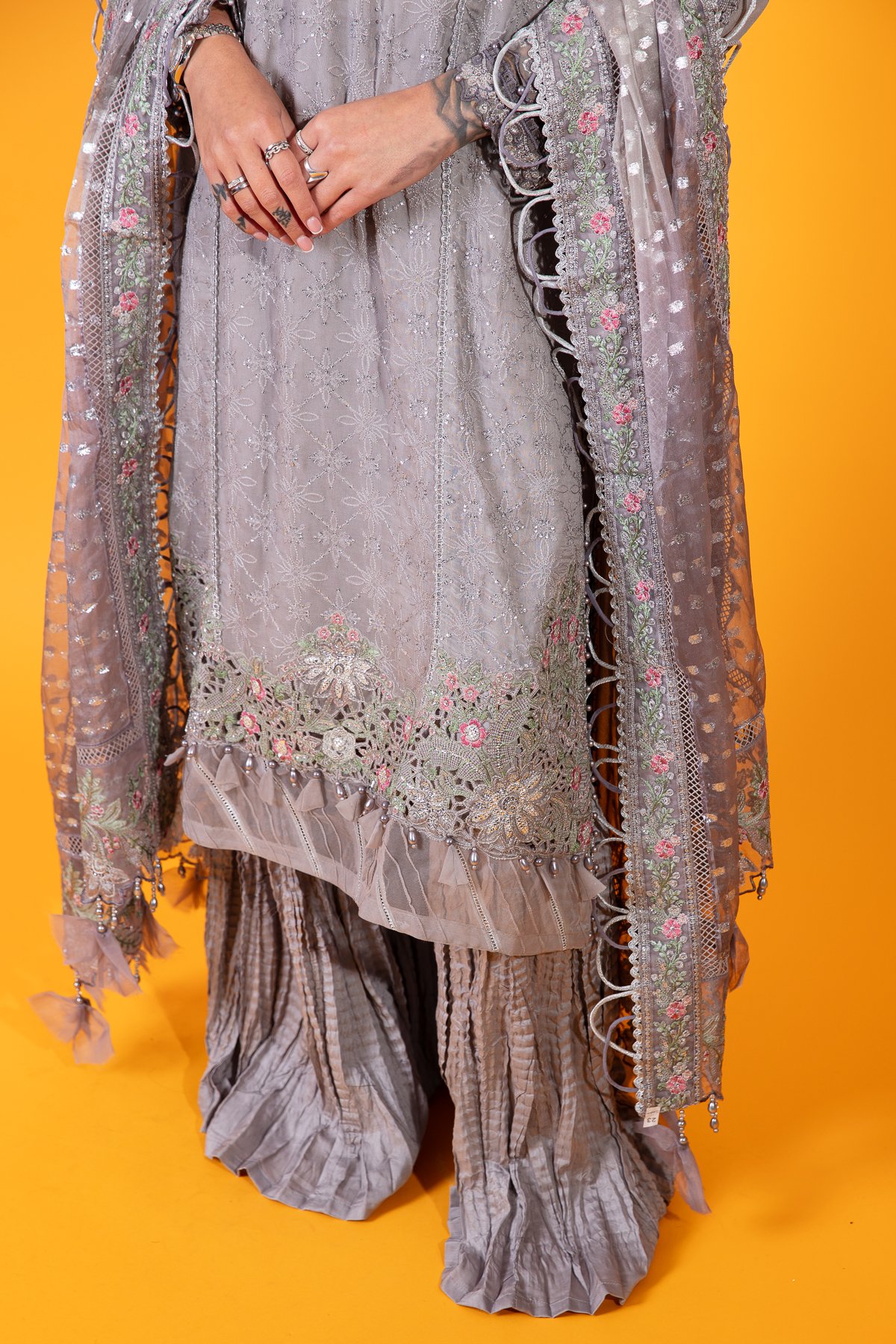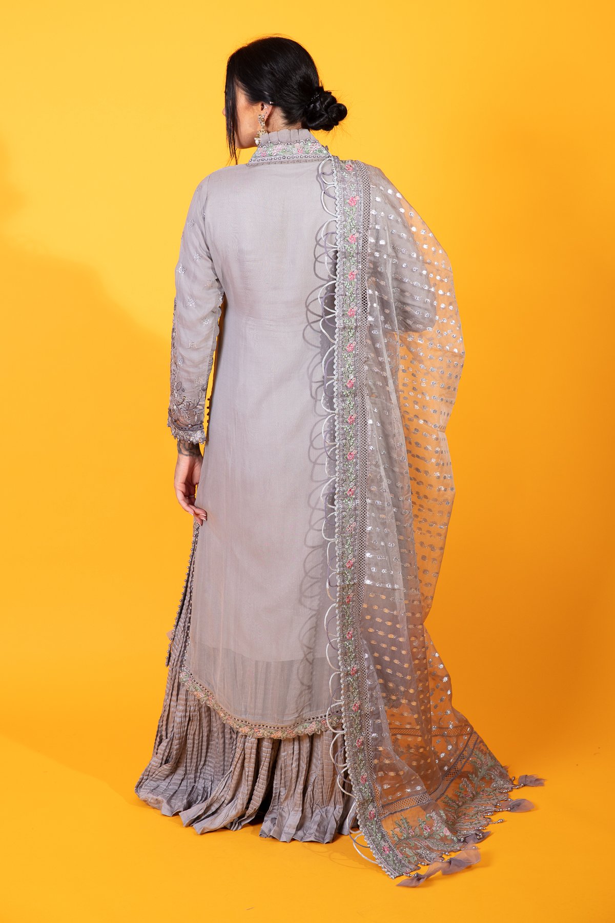 This beautiful 3 piece Maria b inspired suit features a straight long length shirt with thread work embroidery throughout the front, finished with an organza border with fabric dangling baubles. It comes with full length embroidered sleeves. The look is finished with crushed plazo trousers and an embroidered organza dupatta.