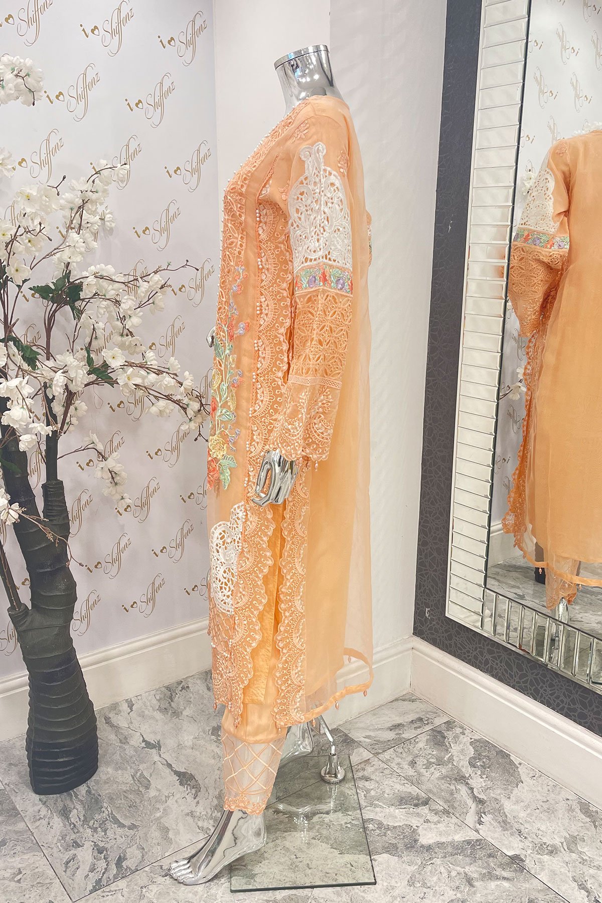 This beautiful 3 piece Maria b inspired partywear suit features a straight shirt with luxury thread work embroidery throughout with bead embellishments, finished with lace embroidered border. It comes with full length embroidered sleeves and straight leg trousers. The look is finished with a printed chiffon dupatta with an organza patch around the border. Note: Above catalogue pictures are for design reference only.