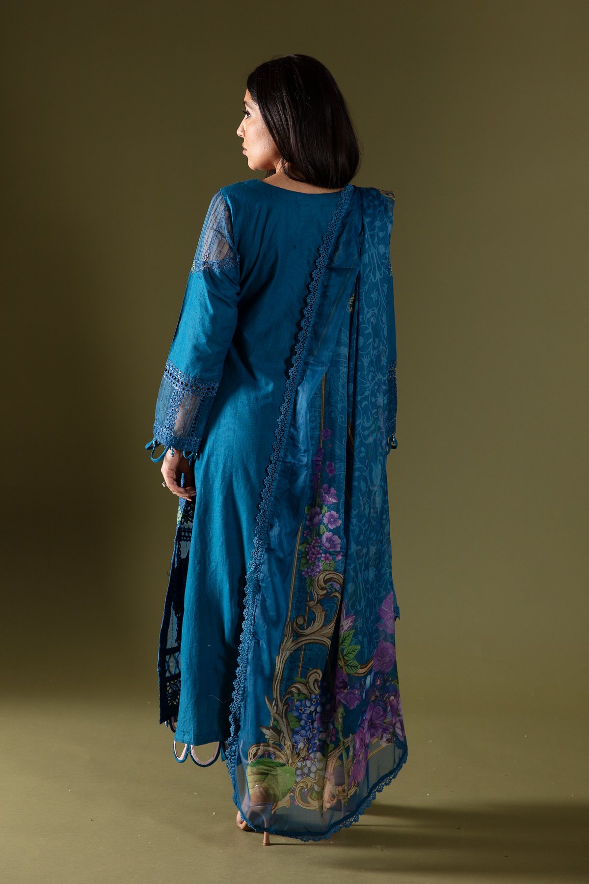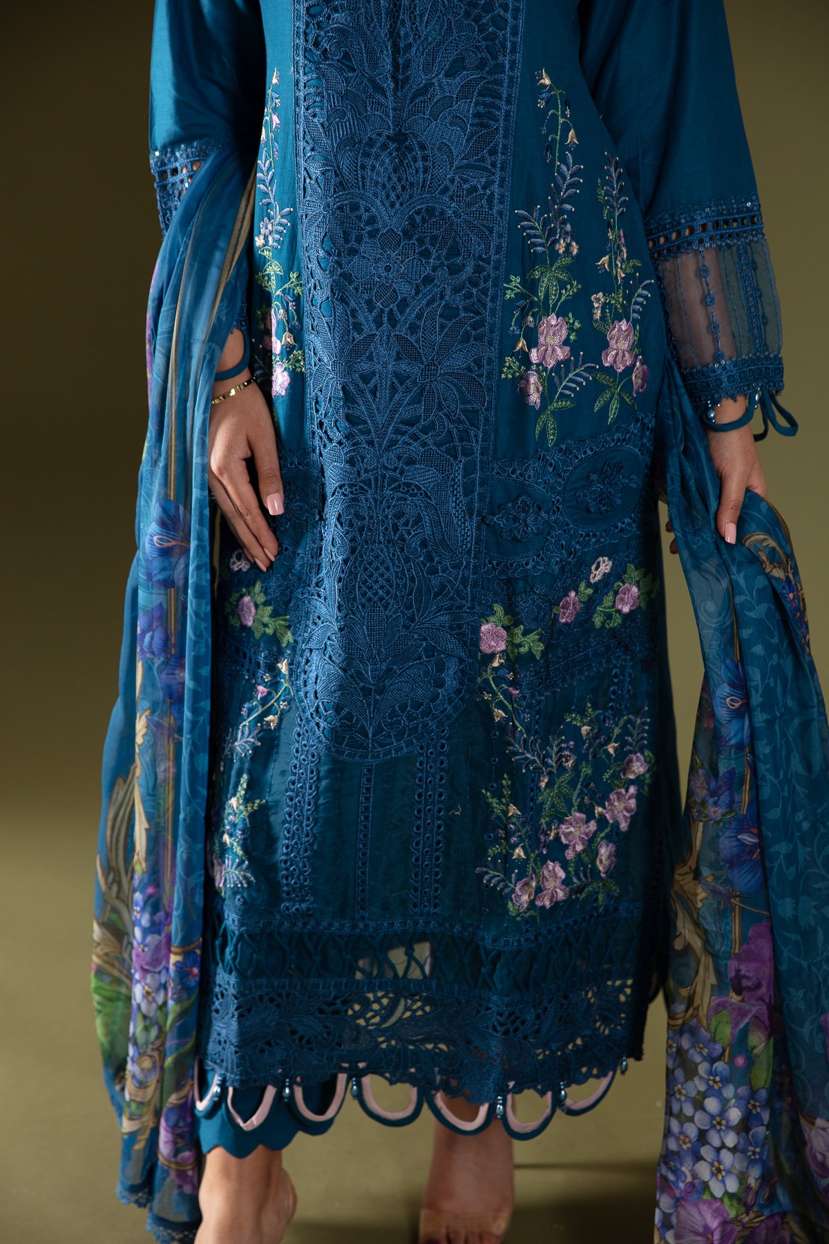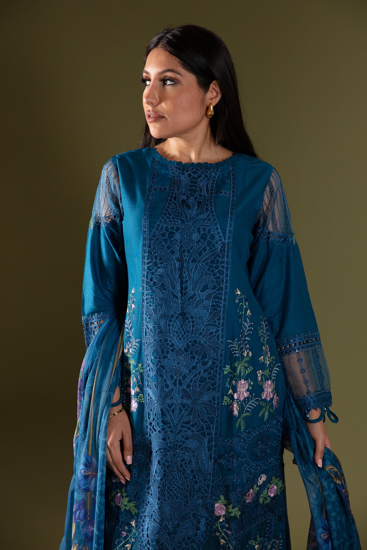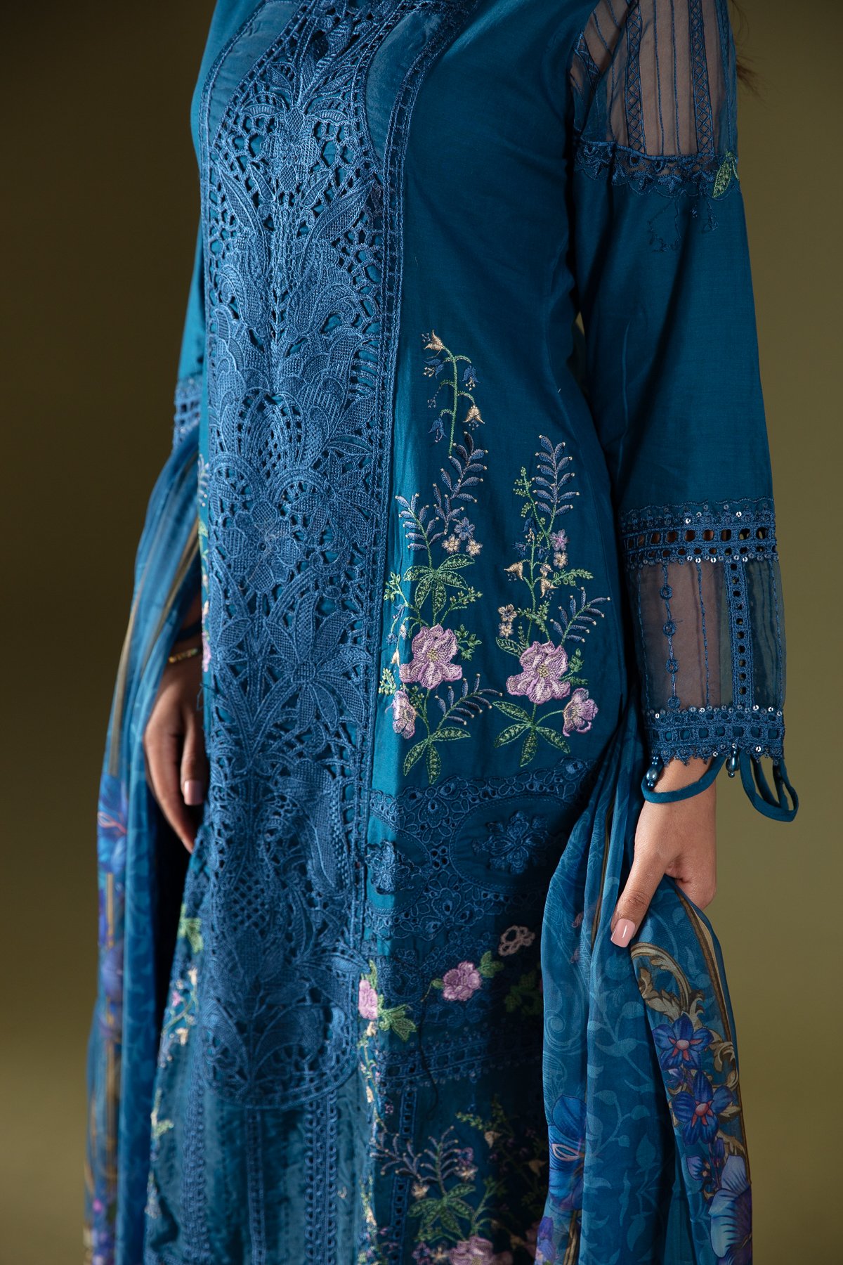 This beautiful 3 piece Maria b inspired suit features a straight chikankari shirt with luxury thread work embroidery throughout, finished with cut work on the border with fabric piping. It comes with full length embroidered sleeves and straight leg trousers. The look is finished with a digital printed silk dupattta.