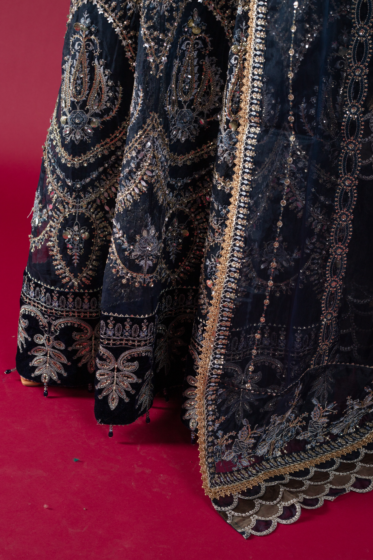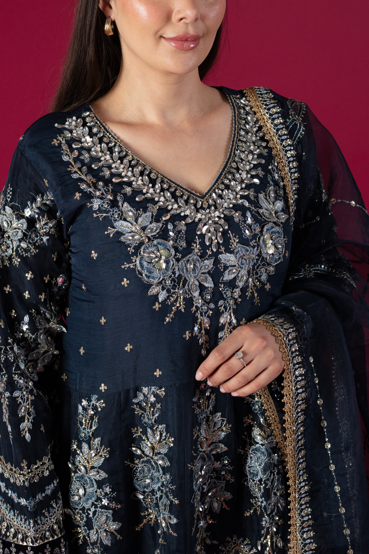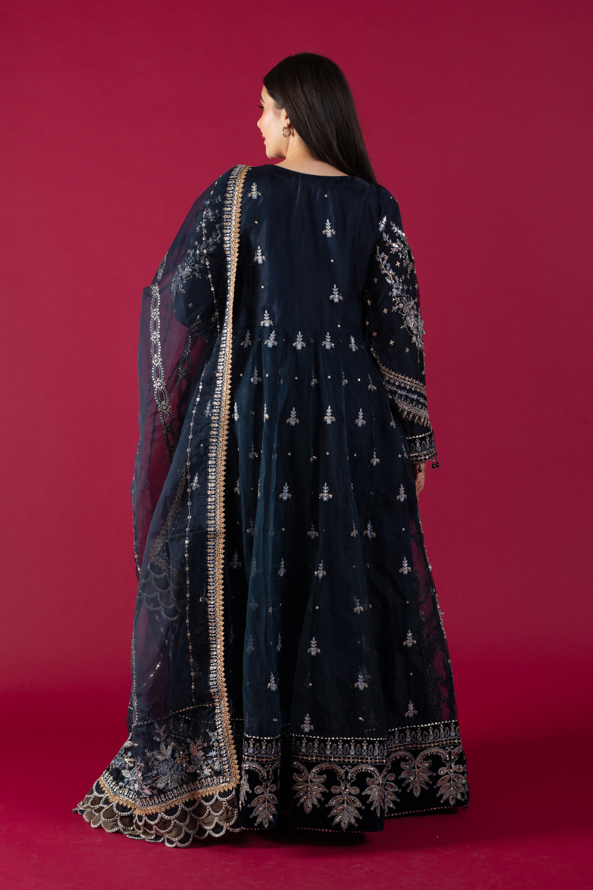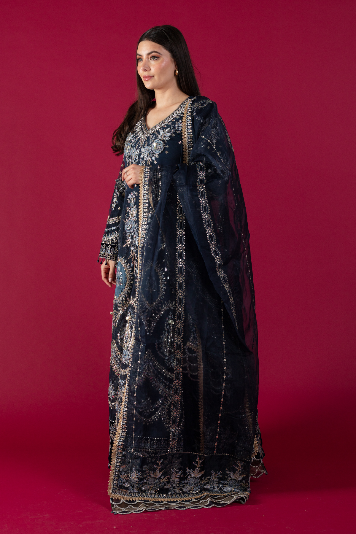 This beautiful 3 piece Maria b suit features a long maxi dress with luxury hand embellishments embroidery with 3d flower embellishments along with bead work on the neckline finished with an embroidered velvet border. It comes with full length embroidered sleeves. Paired with straight leg trousers and the look is finished with an embroidered organza dupatta.