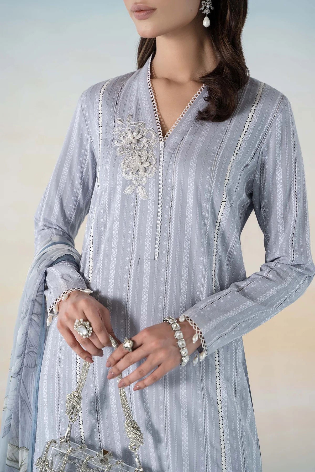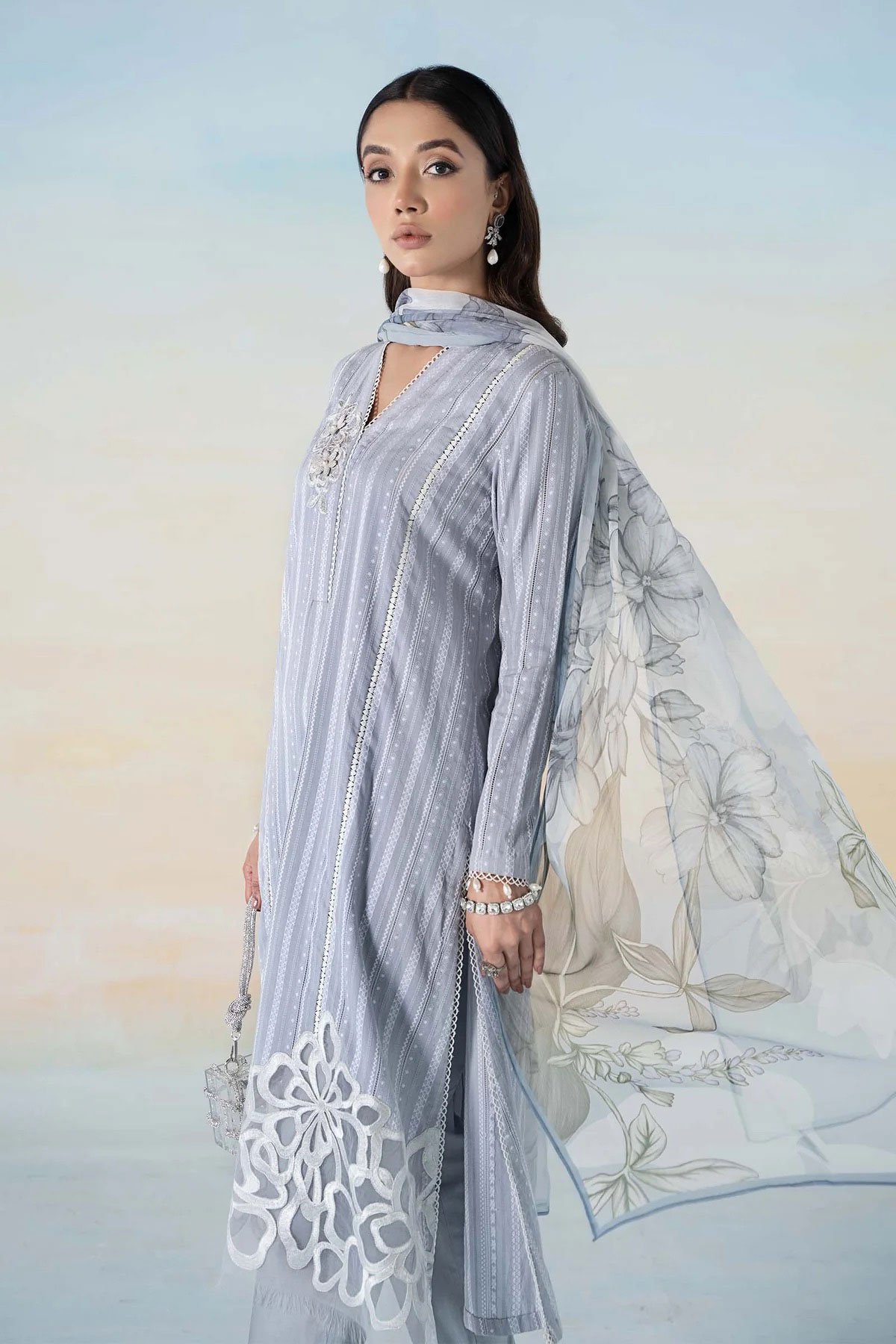 This beautiful 3 piece Maria b inspired suit features a straight printed shirt with lace embroidered patch on the front as well as the border, finished with lace  embellished hems, It comes with full length sleeves and straight leg trousers and the look is finished with digital printed silk dupatta.